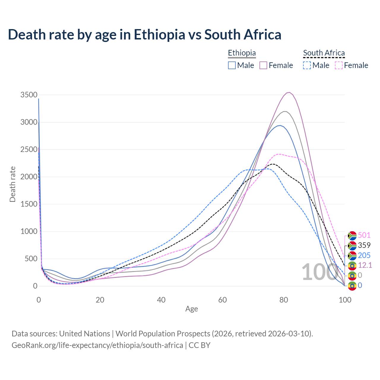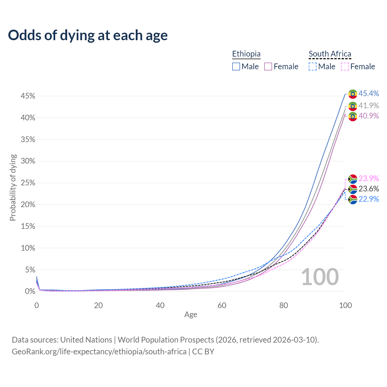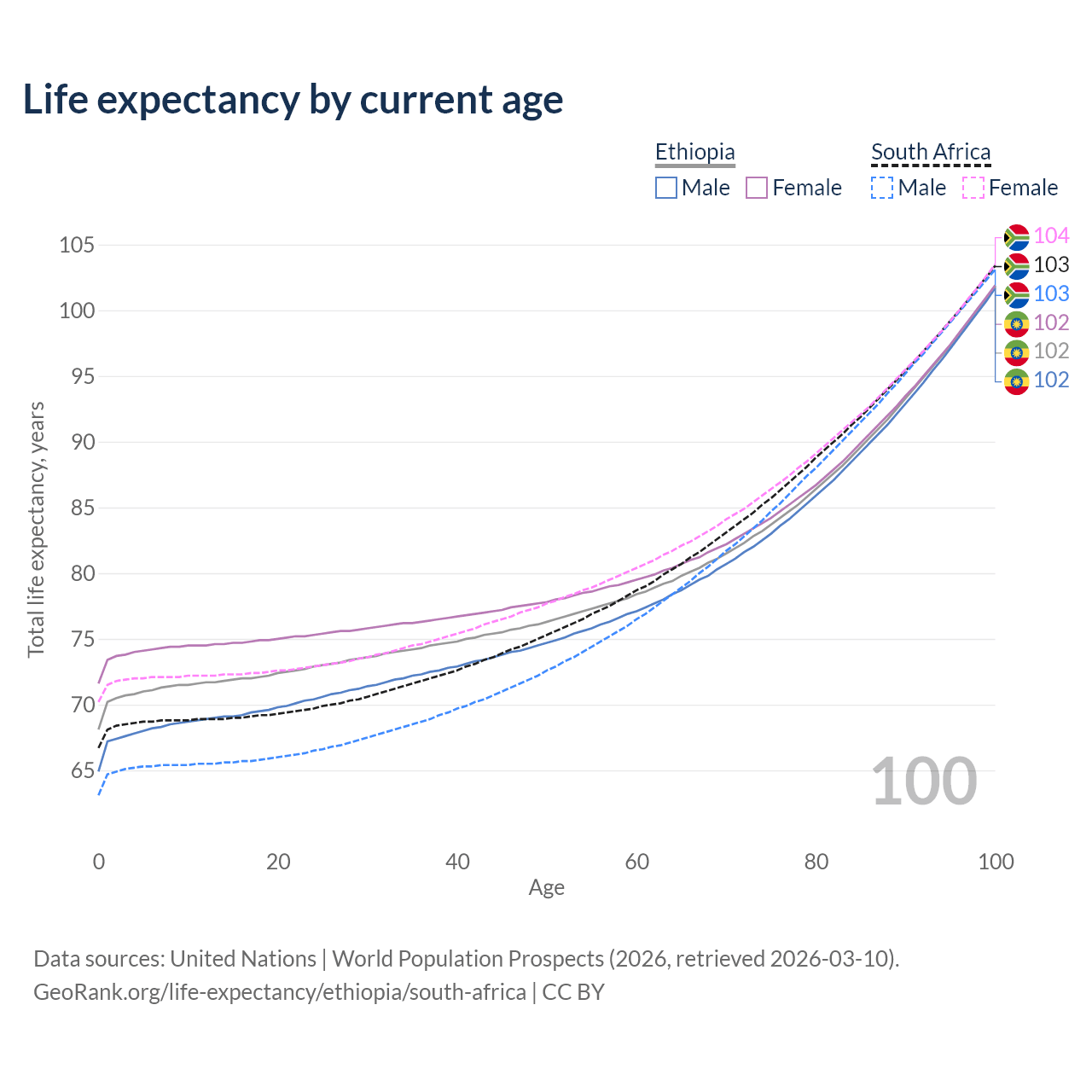 This life expectancy calculator shows the odds of living to 100, 95, 90, and below based on current age for both males and females in Ethiopia and South Africa, along with mean and median age of death. The calculations are based on the 2026 life tables (actuarial tables) from the UN World Population Prospects.