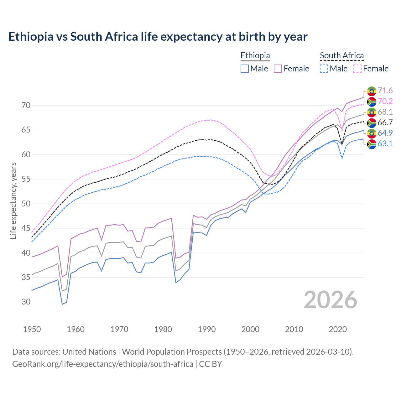 The average life expectancy at birth is 68.1 years in Ethiopia vs 66.7 in South Africa. Ethiopia is ranked 150/197 by life expectancy, and South Africa is 164/197. In Ethiopia, the life expectancy is 64.9 years for males and 71.6 years for females. In South Africa, it's 63.1 years for males and 70.2 years for females.