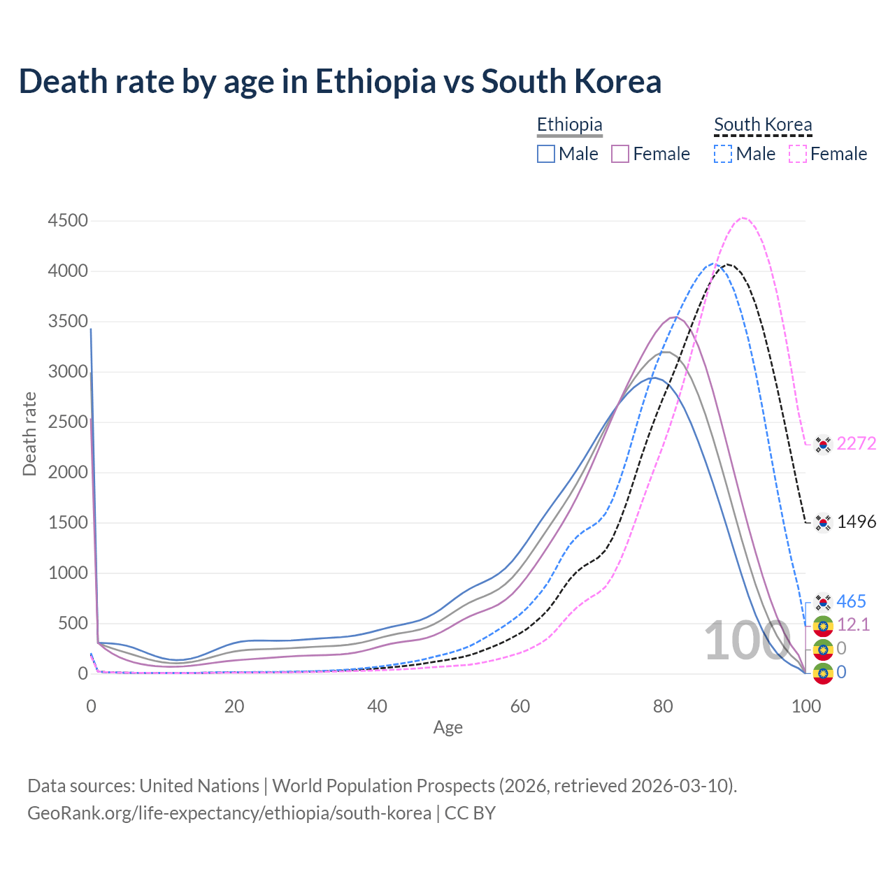 In Ethiopia, the most common age of death is 80, compared to 89 in South Korea. The median age of death is 74.8 in Ethiopia and 86.8 in South Korea, meaning only half of each cohort is expected to live past that age.