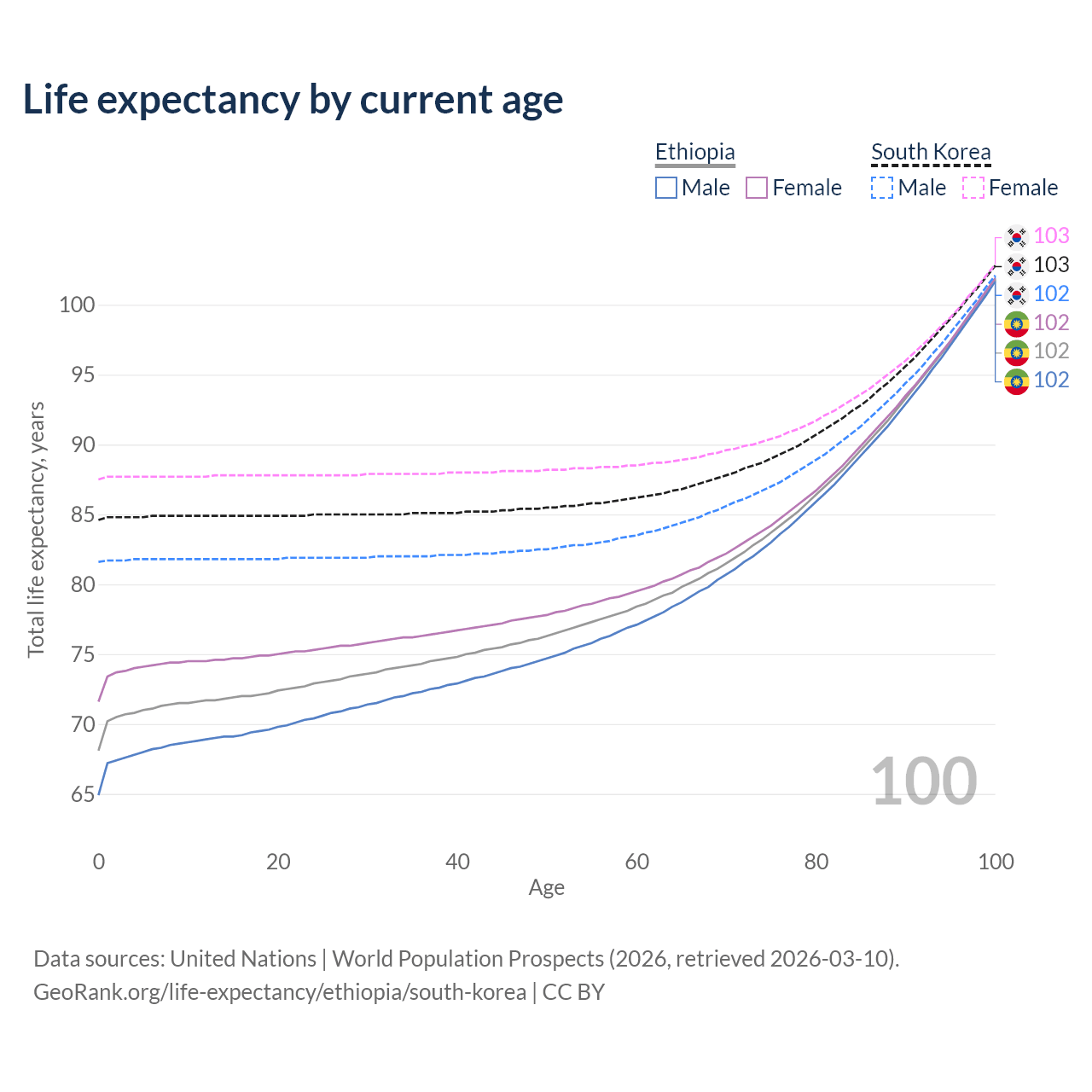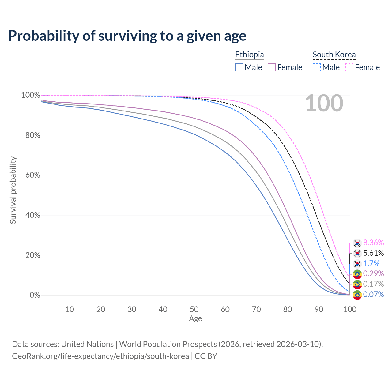 This life expectancy calculator shows the odds of living to 100, 95, 90, and below based on current age for both males and females in Ethiopia and South Korea, along with mean and median age of death. The calculations are based on the 2026 life tables (actuarial tables) from the UN World Population Prospects.