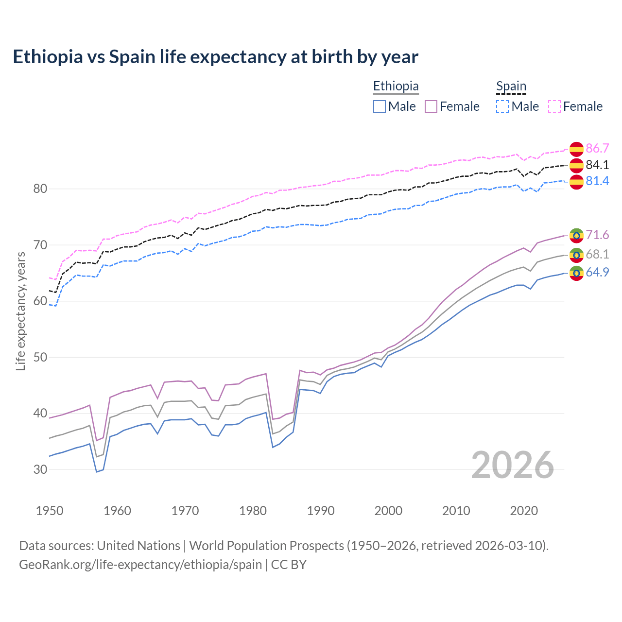 The average life expectancy at birth is 68.1 years in Ethiopia vs 84.1 in Spain. Ethiopia is ranked 150/197 by life expectancy, and Spain is 10/197. In Ethiopia, the life expectancy is 64.9 years for males and 71.6 years for females. In Spain, it's 81.4 years for males and 86.7 years for females.