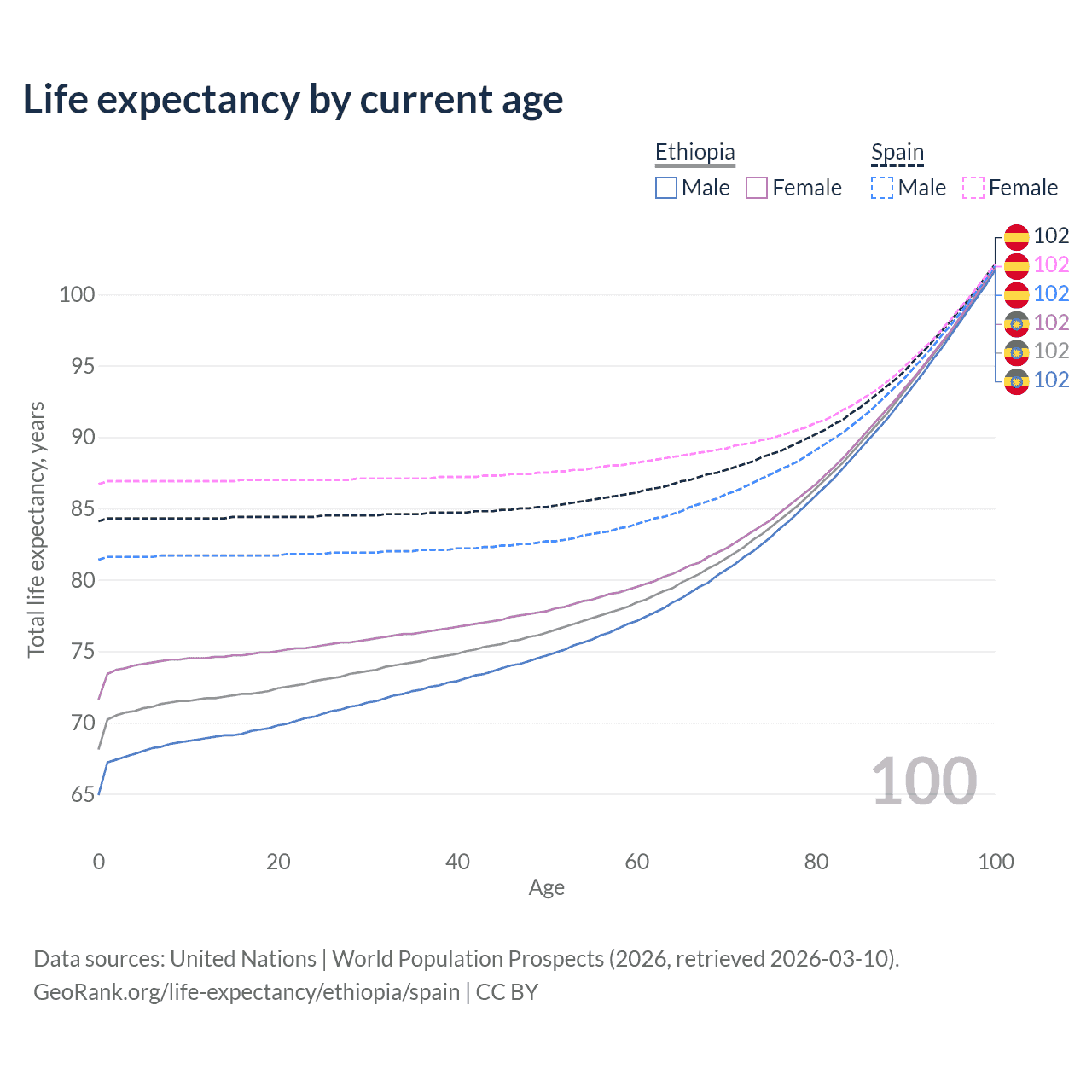 This life expectancy calculator shows the odds of living to 100, 95, 90, and below based on current age for both males and females in Ethiopia and Spain, along with mean and median age of death. The calculations are based on the 2026 life tables (actuarial tables) from the UN World Population Prospects.
