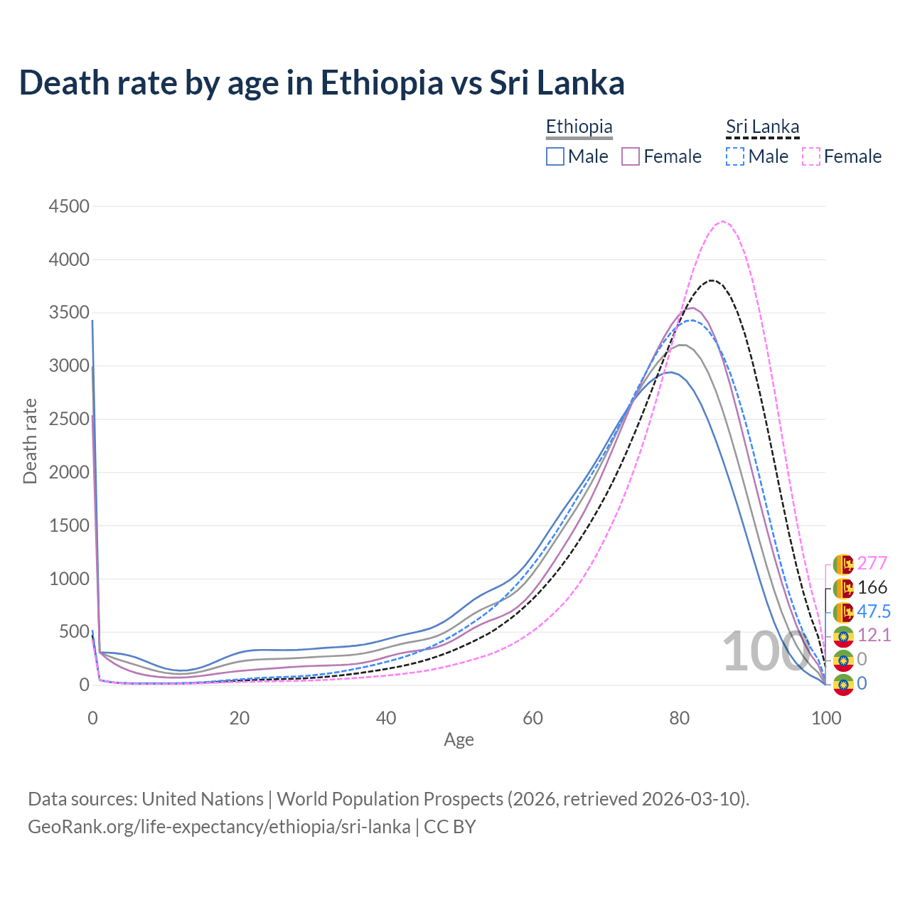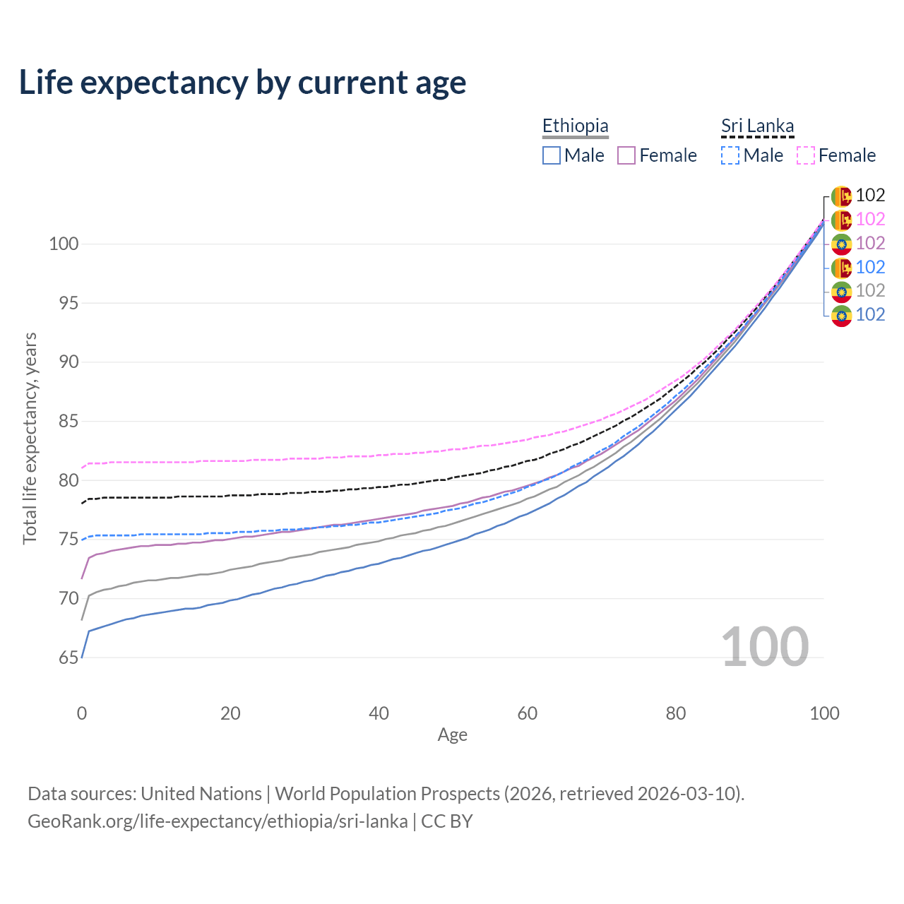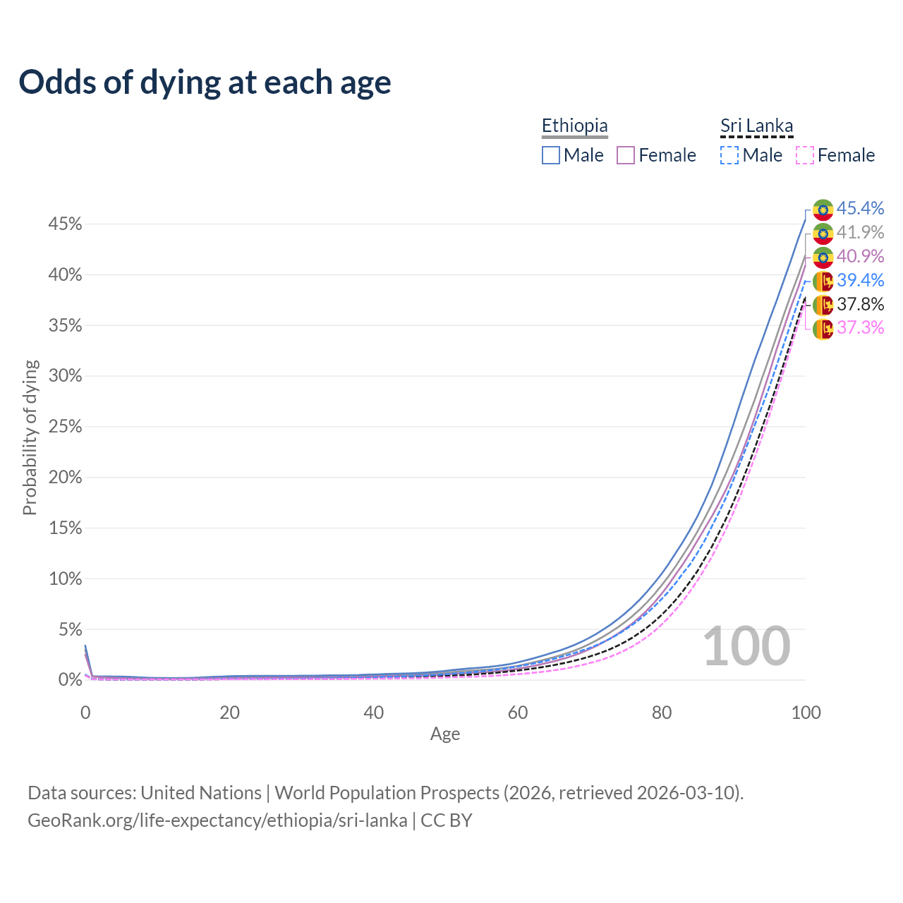 This life expectancy calculator shows the odds of living to 100, 95, 90, and below based on current age for both males and females in Ethiopia and Sri Lanka, along with mean and median age of death. The calculations are based on the 2026 life tables (actuarial tables) from the UN World Population Prospects.