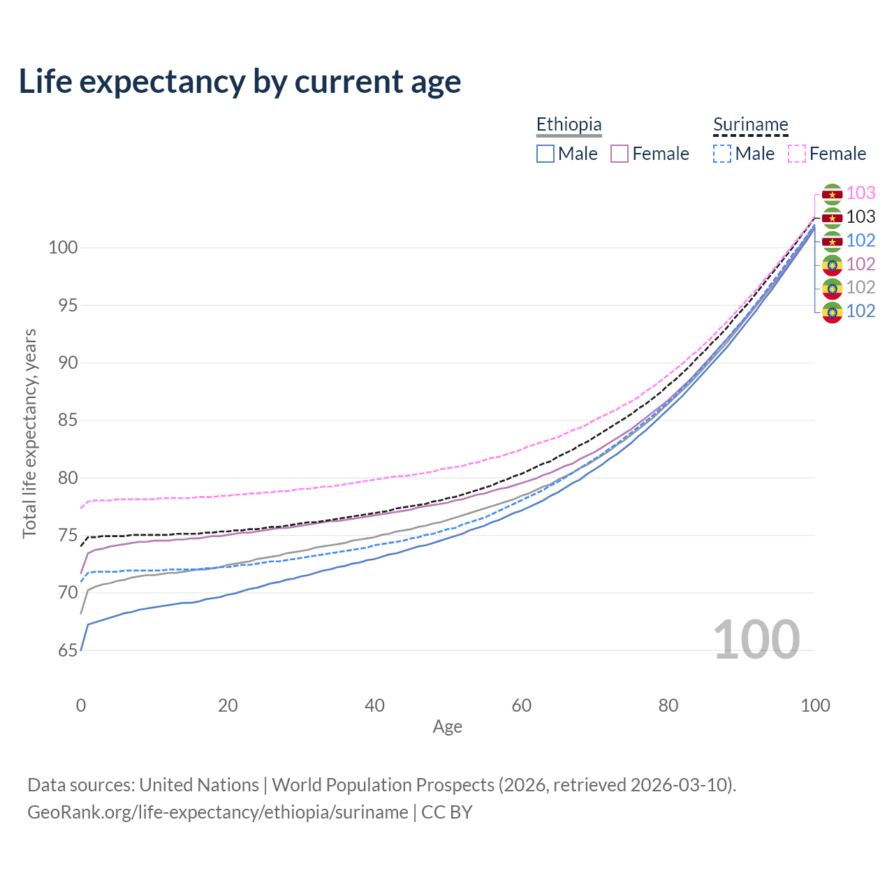 This life expectancy calculator shows the odds of living to 100, 95, 90, and below based on current age for both males and females in Ethiopia and Suriname, along with mean and median age of death. The calculations are based on the 2026 life tables (actuarial tables) from the UN World Population Prospects.