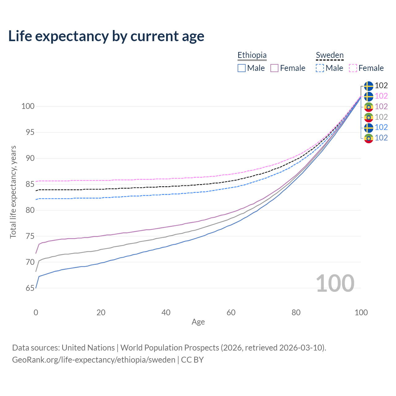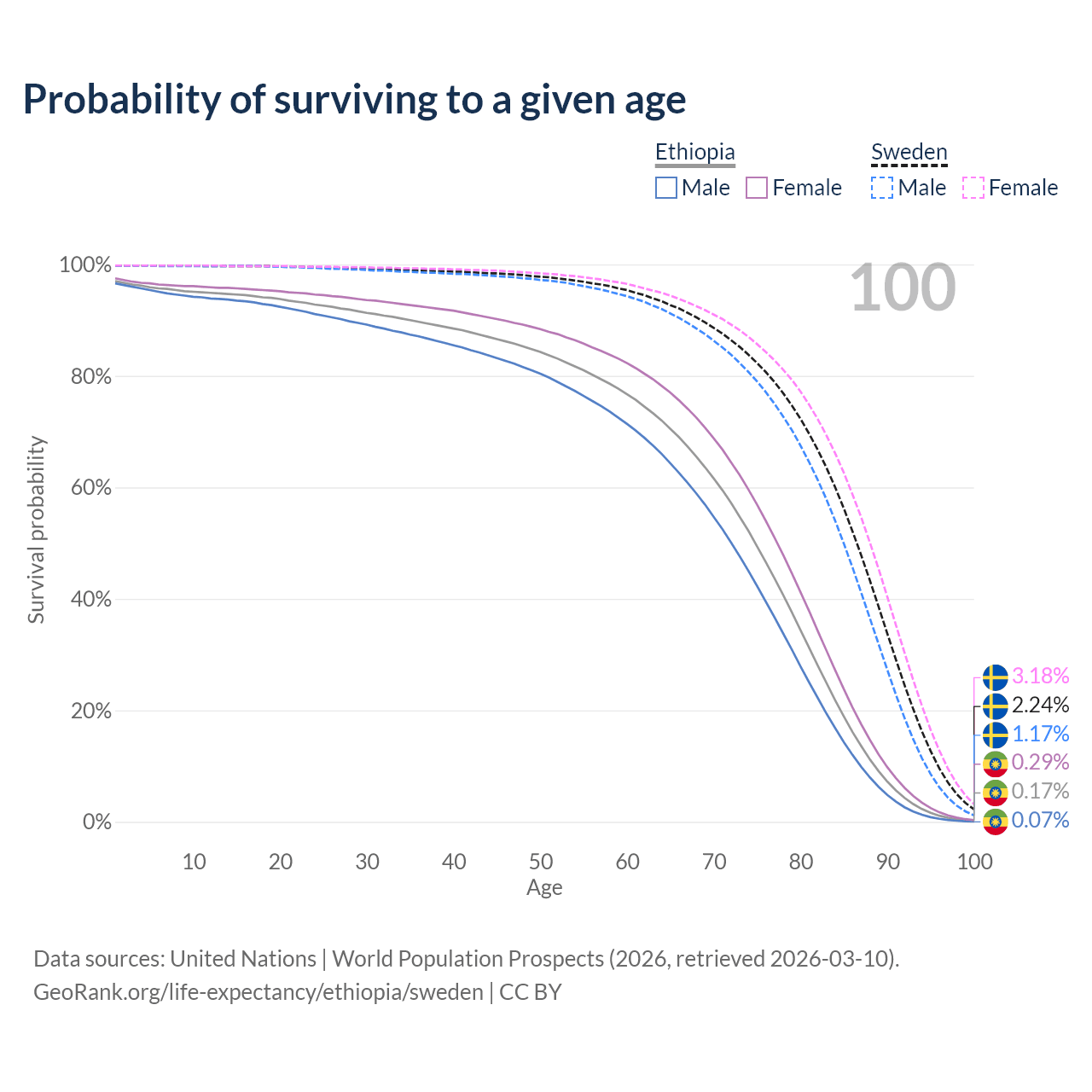 This life expectancy calculator shows the odds of living to 100, 95, 90, and below based on current age for both males and females in Ethiopia and Sweden, along with mean and median age of death. The calculations are based on the 2026 life tables (actuarial tables) from the UN World Population Prospects.