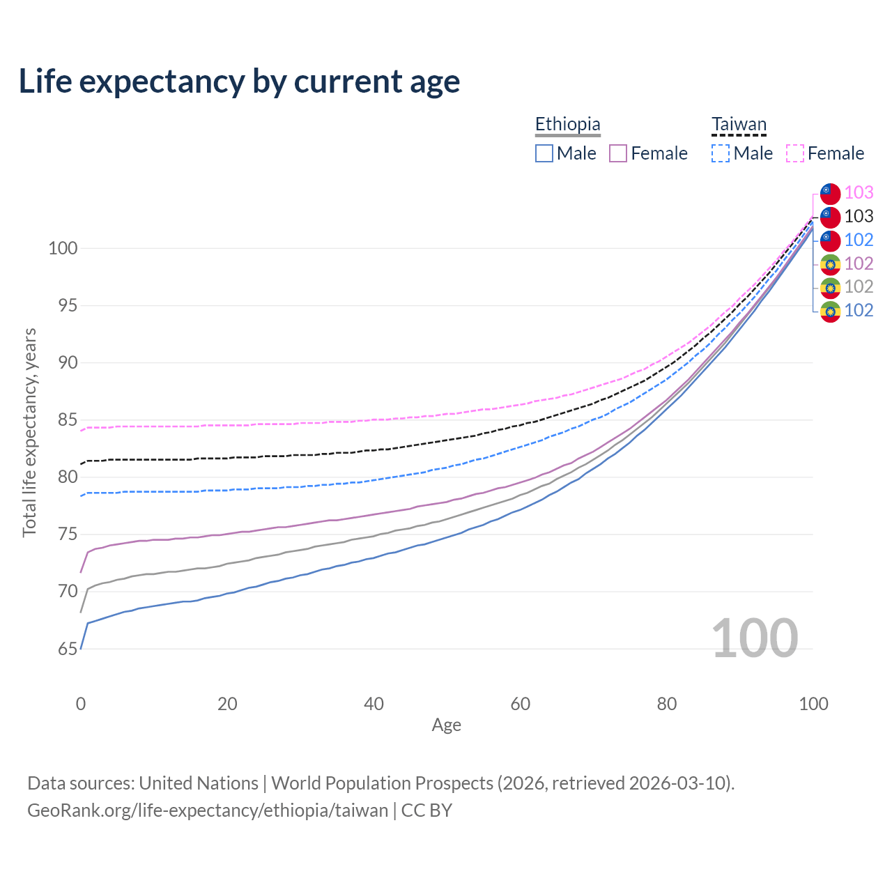 This life expectancy calculator shows the odds of living to 100, 95, 90, and below based on current age for both males and females in Ethiopia and Taiwan, along with mean and median age of death. The calculations are based on the 2026 life tables (actuarial tables) from the UN World Population Prospects.