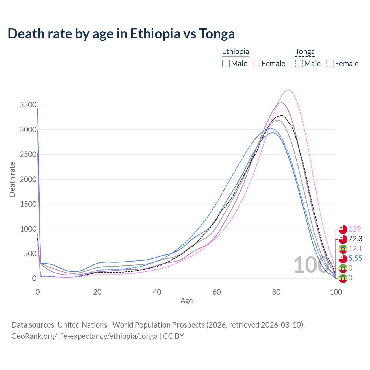 In Ethiopia, the most common age of death is 80, compared to 82 in Tonga. The median age of death is 74.8 in Ethiopia and 77 in Tonga, meaning only half of each cohort is expected to live past that age.
