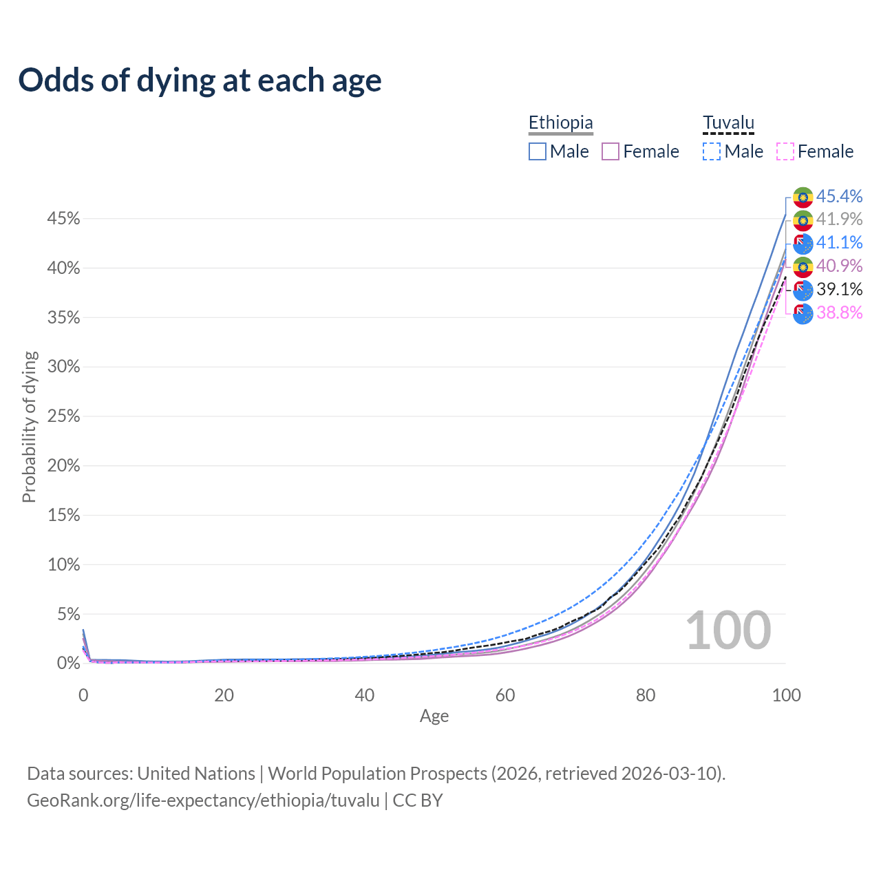 This life expectancy calculator shows the odds of living to 100, 95, 90, and below based on current age for both males and females in Ethiopia and Tuvalu, along with mean and median age of death. The calculations are based on the 2026 life tables (actuarial tables) from the UN World Population Prospects.