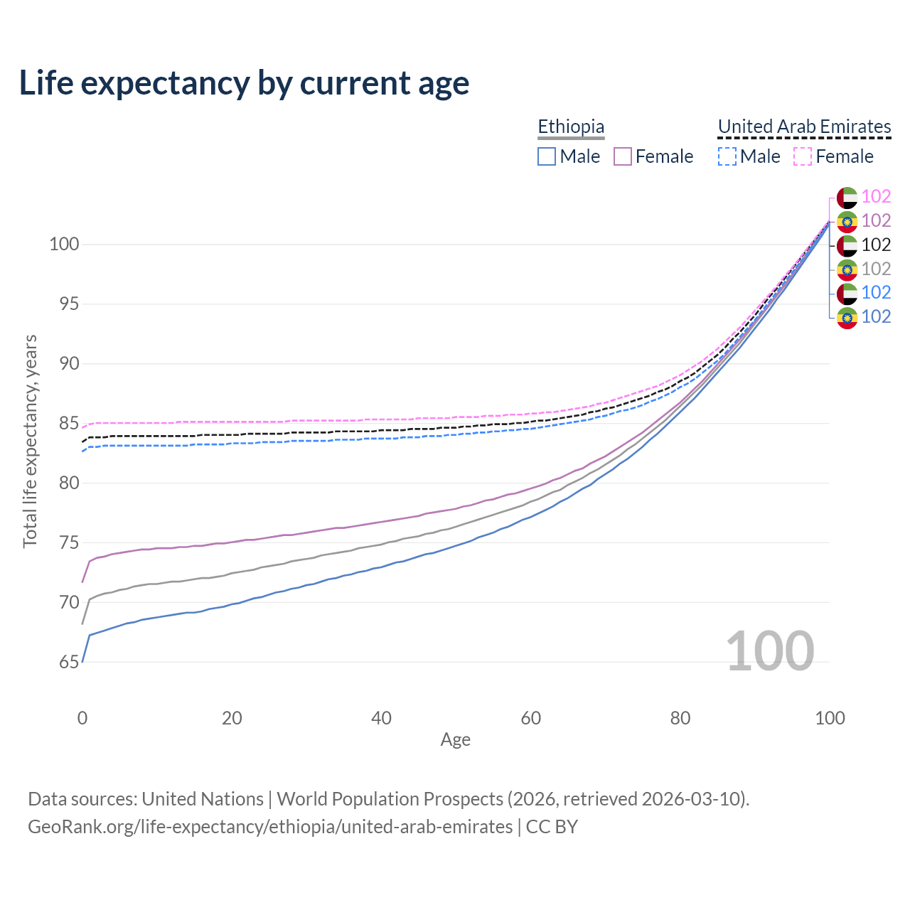 This life expectancy calculator shows the odds of living to 100, 95, 90, and below based on current age for both males and females in Ethiopia and the United Arab Emirates, along with mean and median age of death. The calculations are based on the 2026 life tables (actuarial tables) from the UN World Population Prospects.