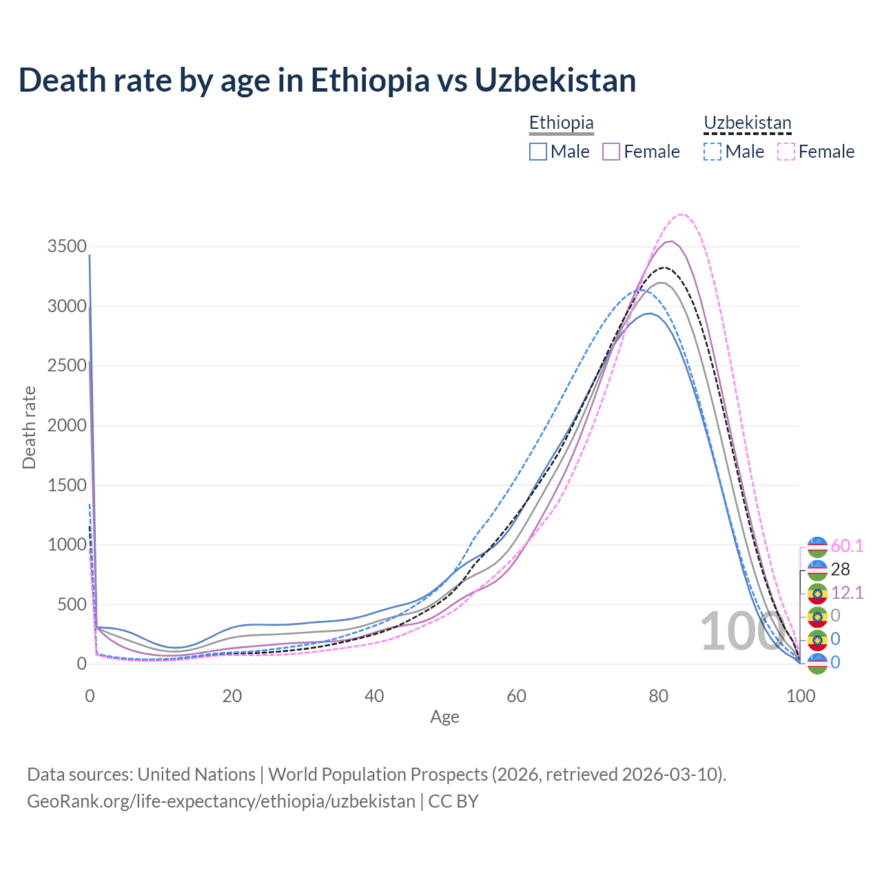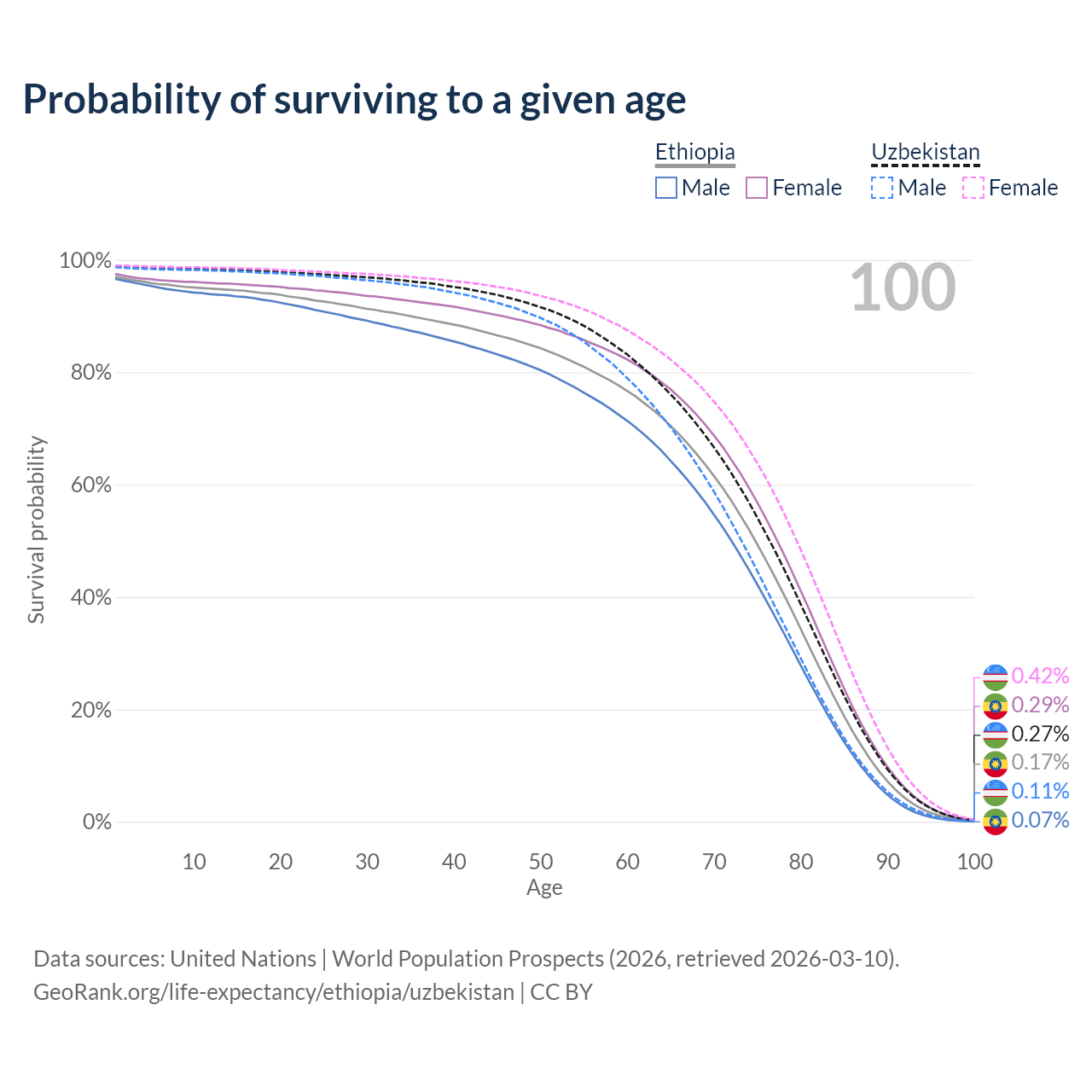 This life expectancy calculator shows the odds of living to 100, 95, 90, and below based on current age for both males and females in Ethiopia and Uzbekistan, along with mean and median age of death. The calculations are based on the 2026 life tables (actuarial tables) from the UN World Population Prospects.
