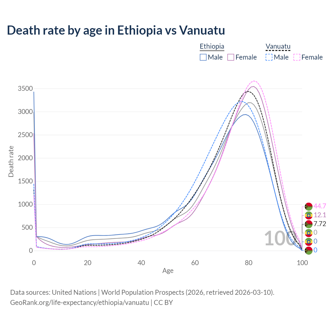This life expectancy calculator shows the odds of living to 100, 95, 90, and below based on current age for both males and females in Ethiopia and Vanuatu, along with mean and median age of death. The calculations are based on the 2026 life tables (actuarial tables) from the UN World Population Prospects.