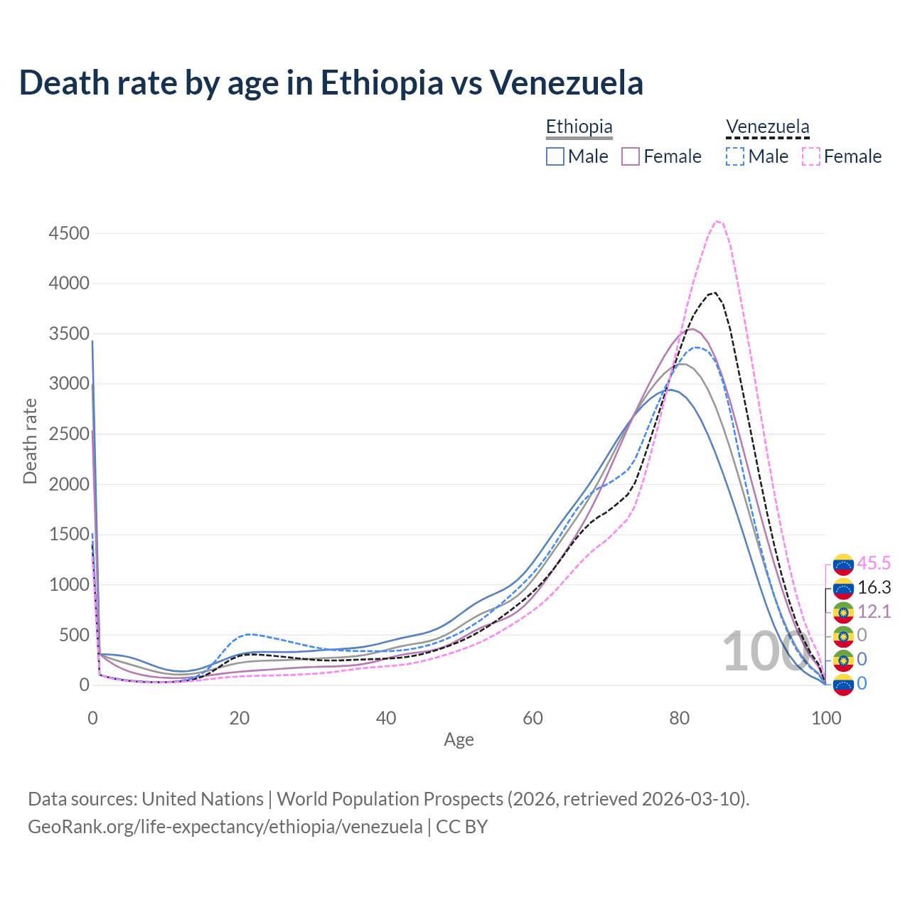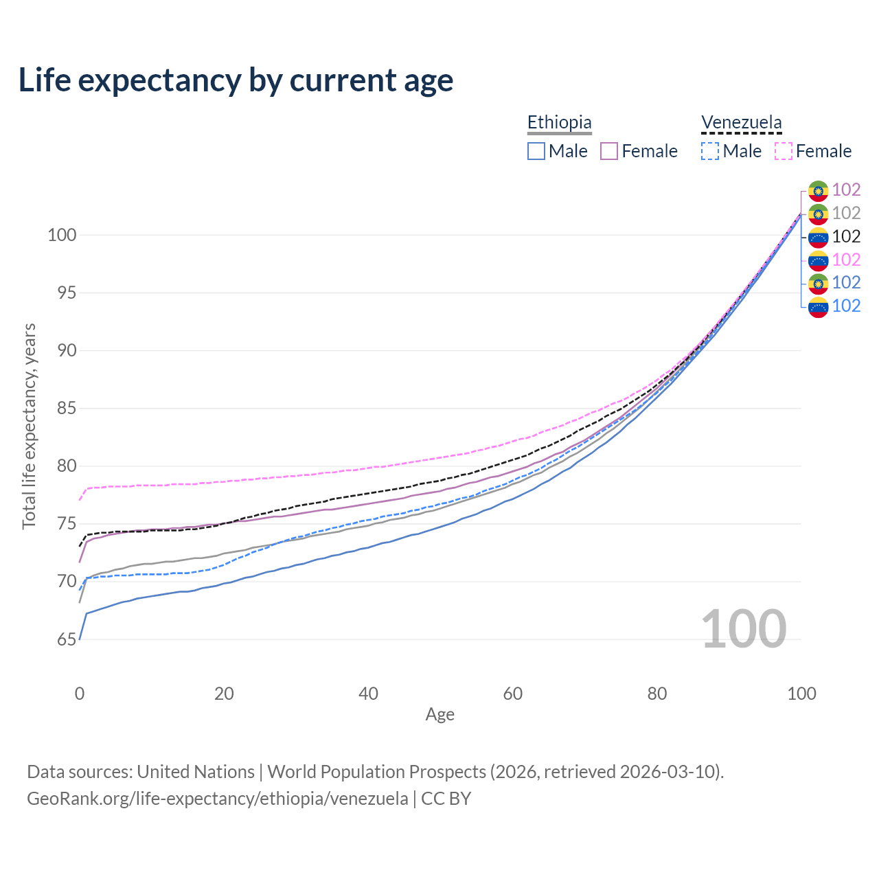 This life expectancy calculator shows the odds of living to 100, 95, 90, and below based on current age for both males and females in Ethiopia and Venezuela, along with mean and median age of death. The calculations are based on the 2026 life tables (actuarial tables) from the UN World Population Prospects.