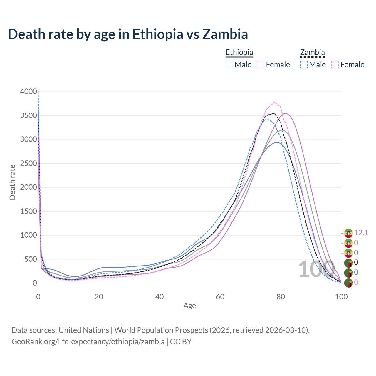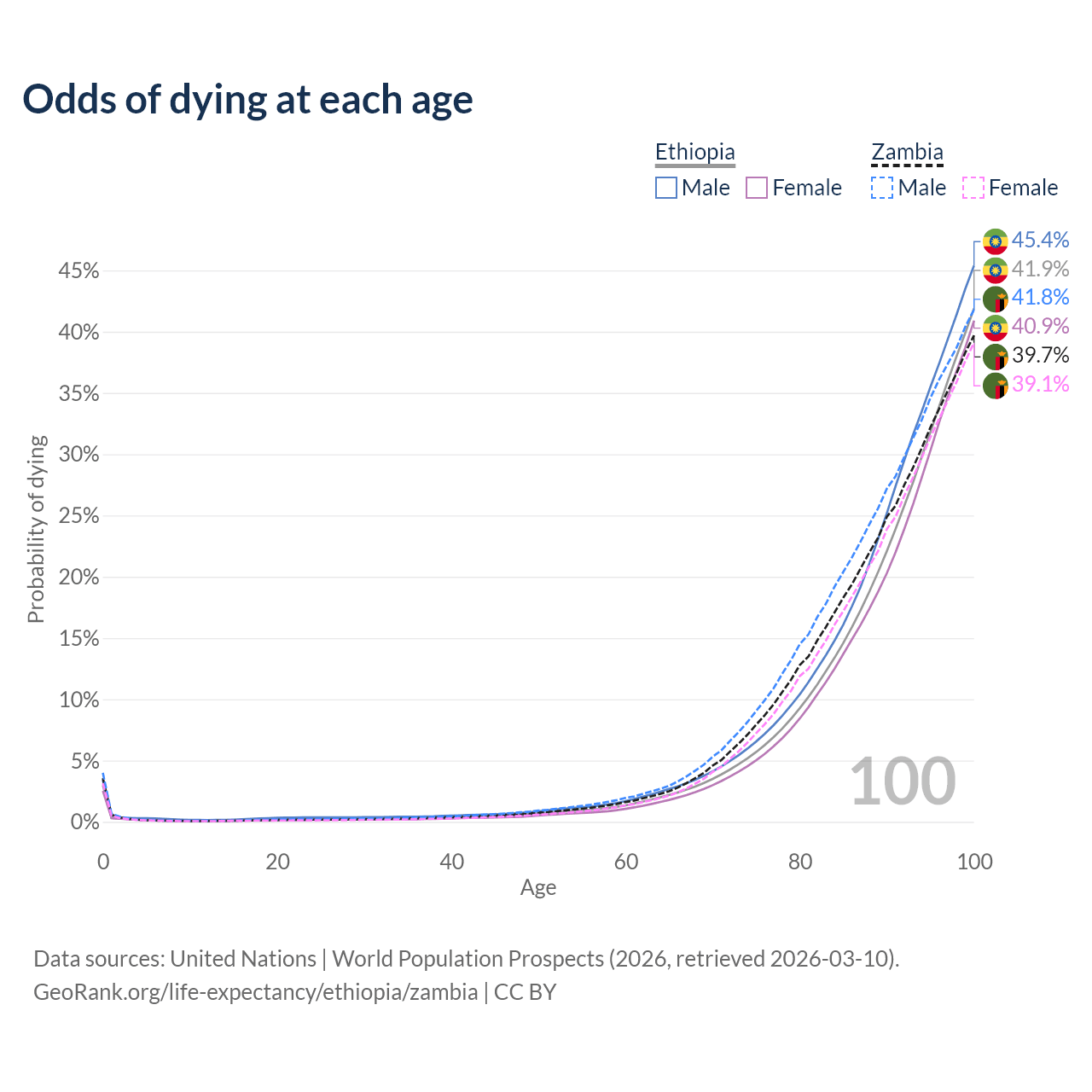 This life expectancy calculator shows the odds of living to 100, 95, 90, and below based on current age for both males and females in Ethiopia and Zambia, along with mean and median age of death. The calculations are based on the 2026 life tables (actuarial tables) from the UN World Population Prospects.