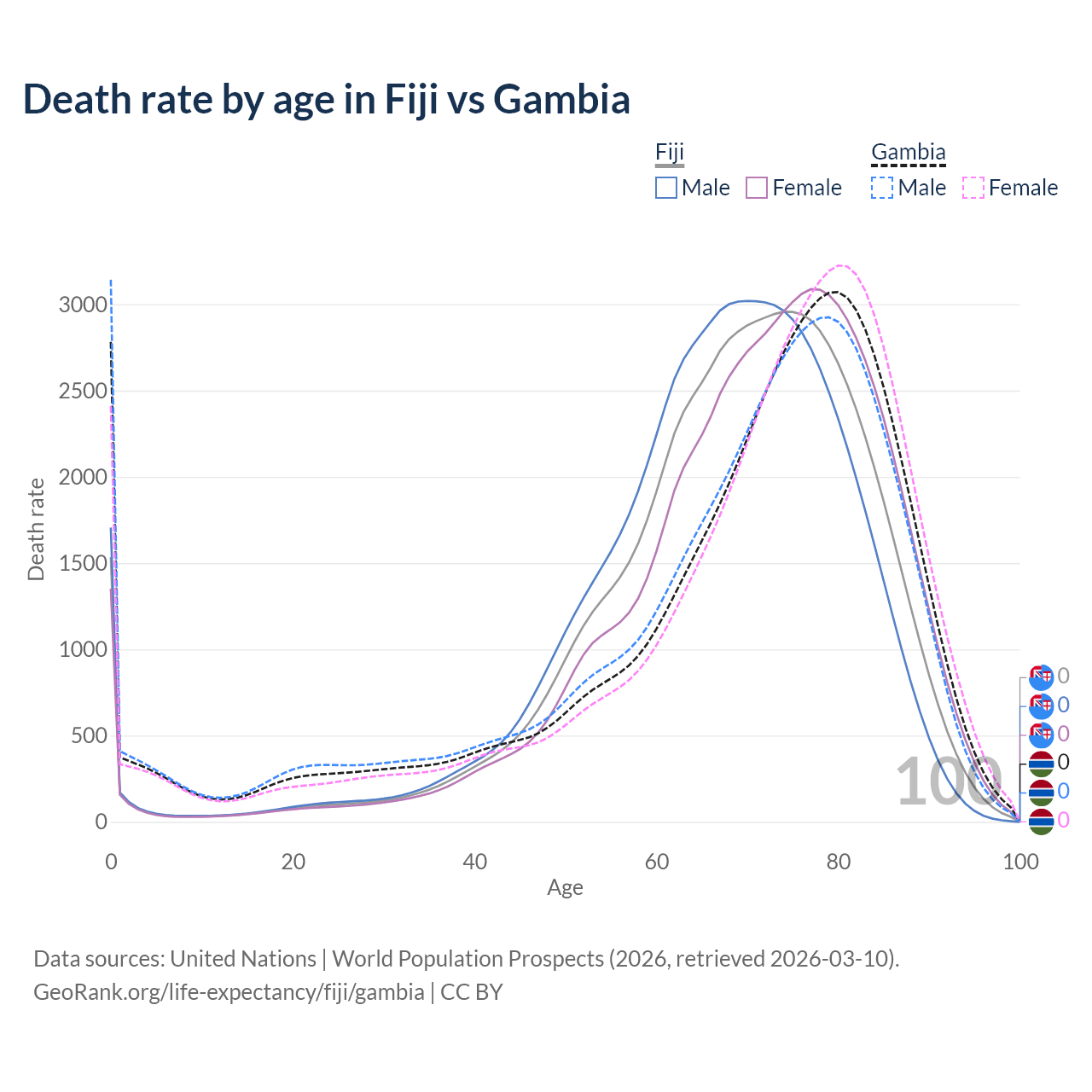 In Fiji, the most common age of death is 74, compared to 80 in the Gambia. The median age of death is 70.5 in Fiji and 73.4 in the Gambia, meaning only half of each cohort is expected to live past that age.