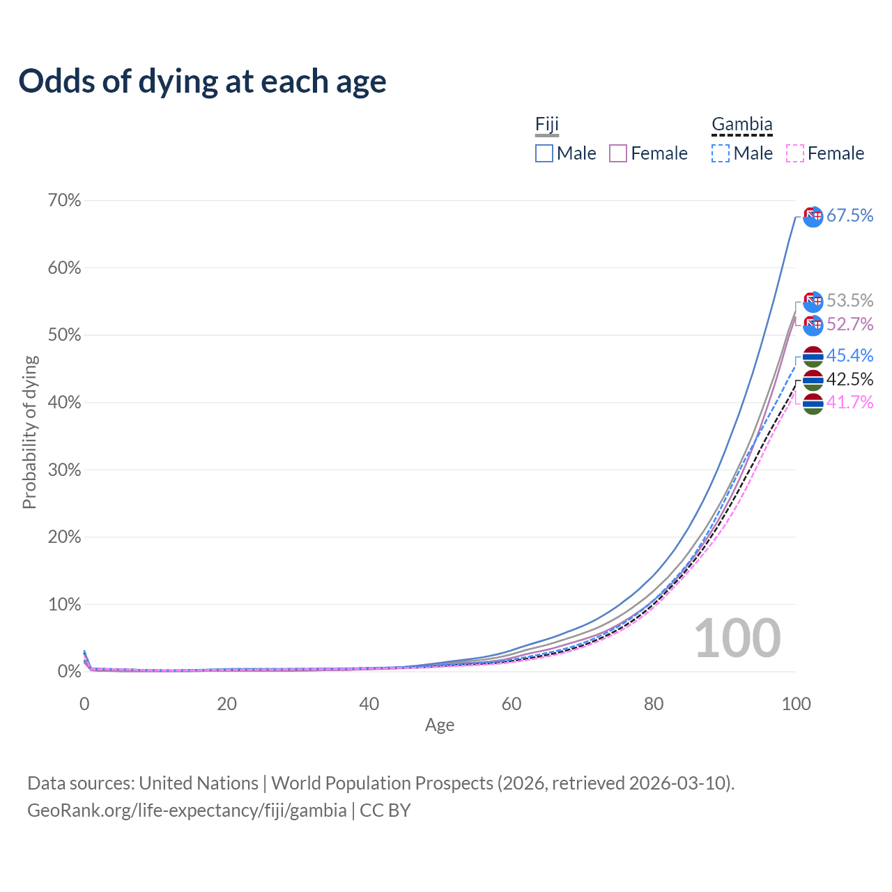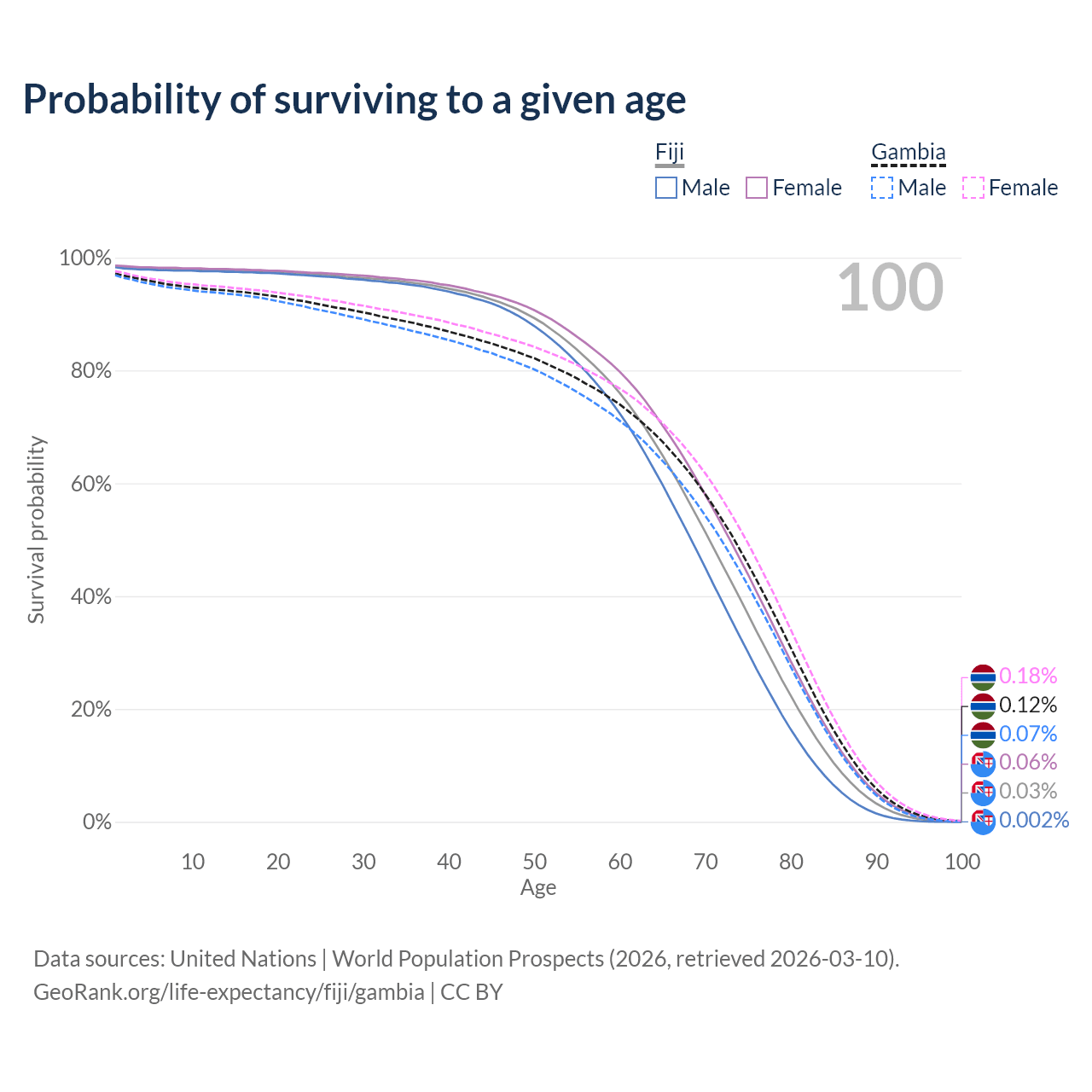 This life expectancy calculator shows the odds of living to 100, 95, 90, and below based on current age for both males and females in Fiji and the Gambia, along with mean and median age of death. The calculations are based on the 2026 life tables (actuarial tables) from the UN World Population Prospects.