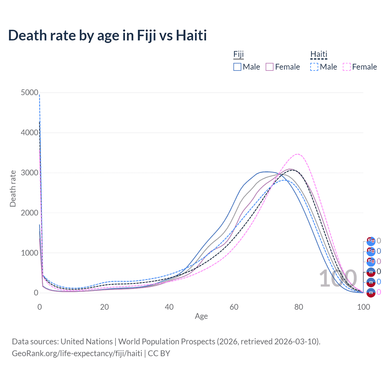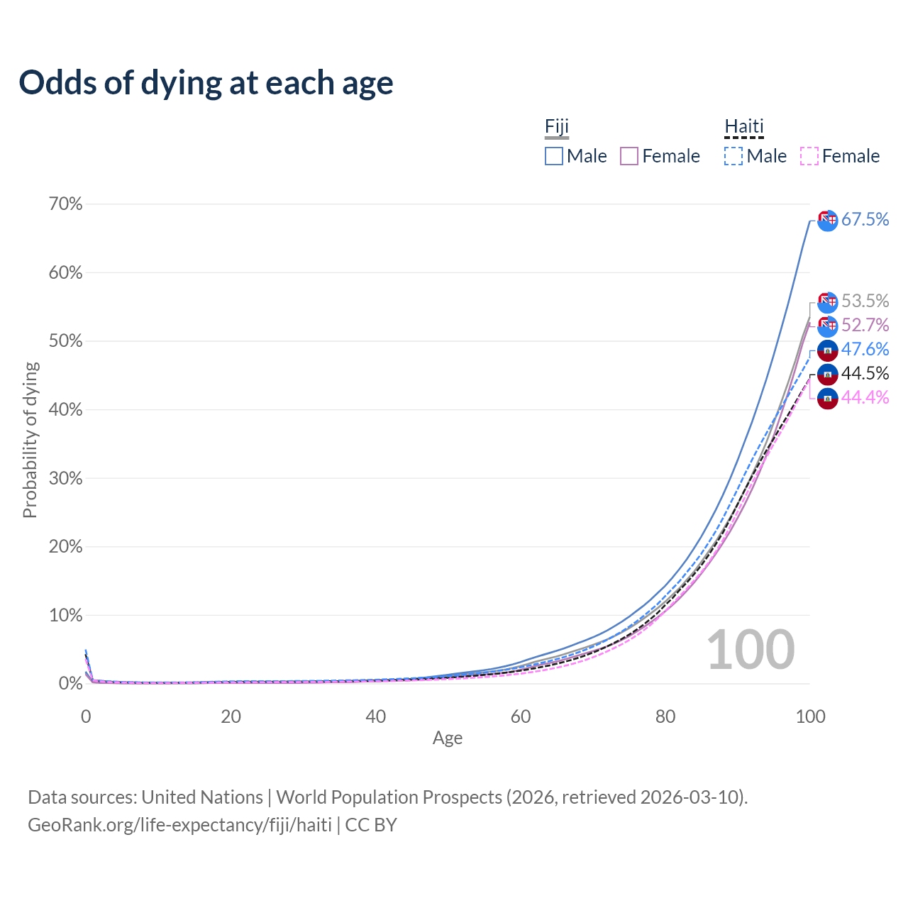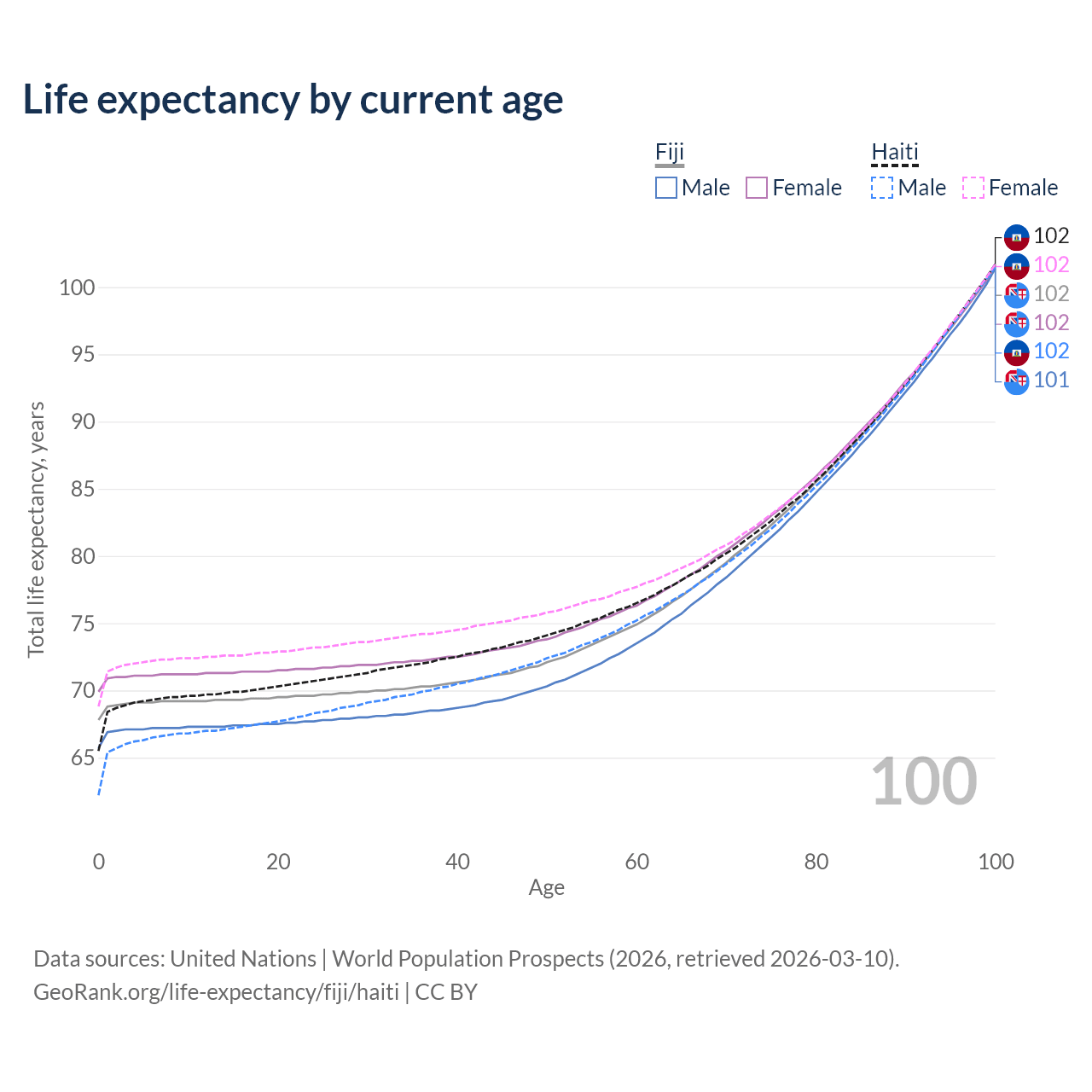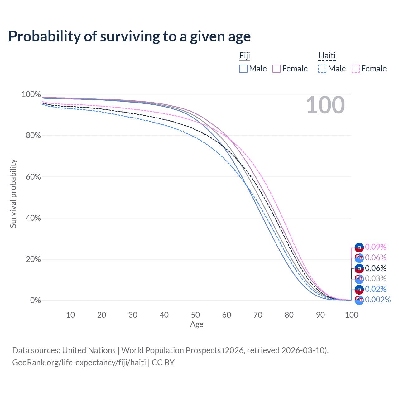 This life expectancy calculator shows the odds of living to 100, 95, 90, and below based on current age for both males and females in Fiji and Haiti, along with mean and median age of death. The calculations are based on the 2026 life tables (actuarial tables) from the UN World Population Prospects.