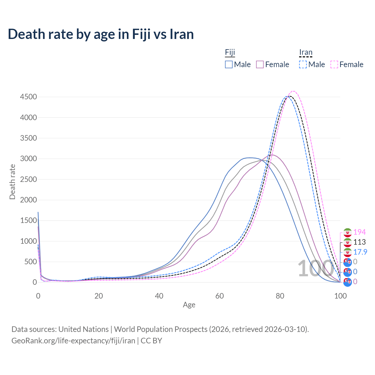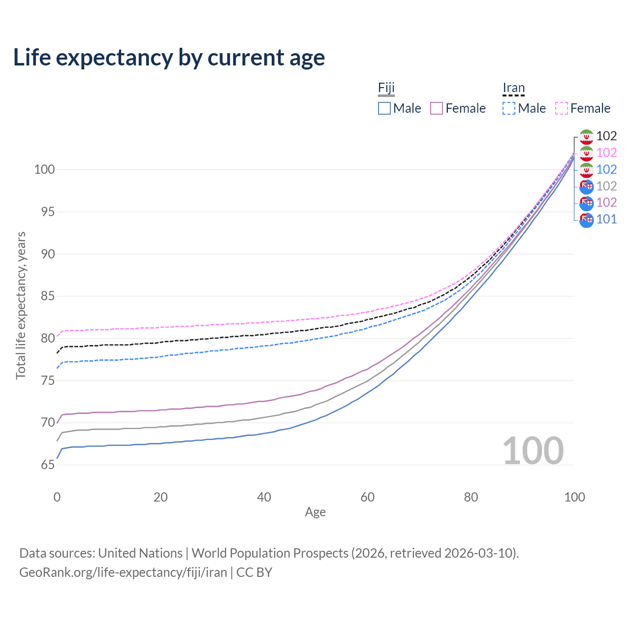 This life expectancy calculator shows the odds of living to 100, 95, 90, and below based on current age for both males and females in Fiji and Iran, along with mean and median age of death. The calculations are based on the 2026 life tables (actuarial tables) from the UN World Population Prospects.