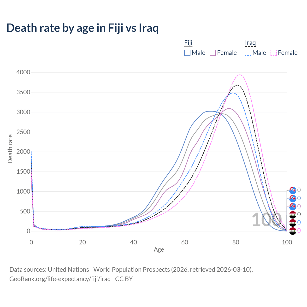 In Fiji, the most common age of death is 74, compared to 81 in Iraq. The median age of death is 70.5 in Fiji and 76.7 in Iraq, meaning only half of each cohort is expected to live past that age.