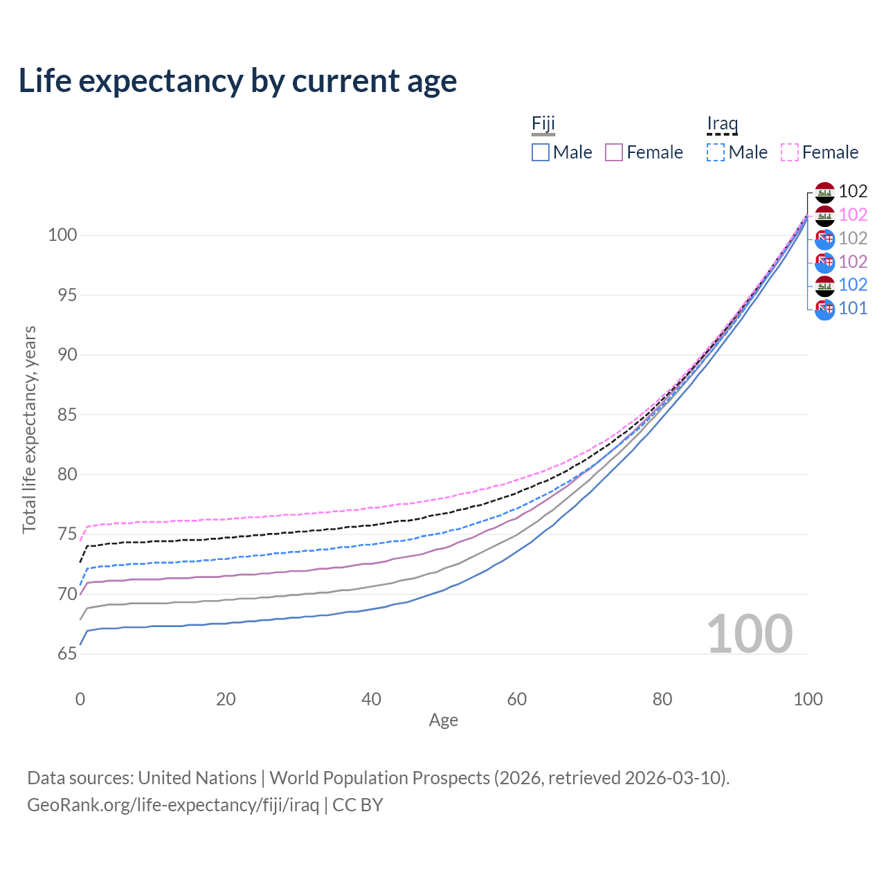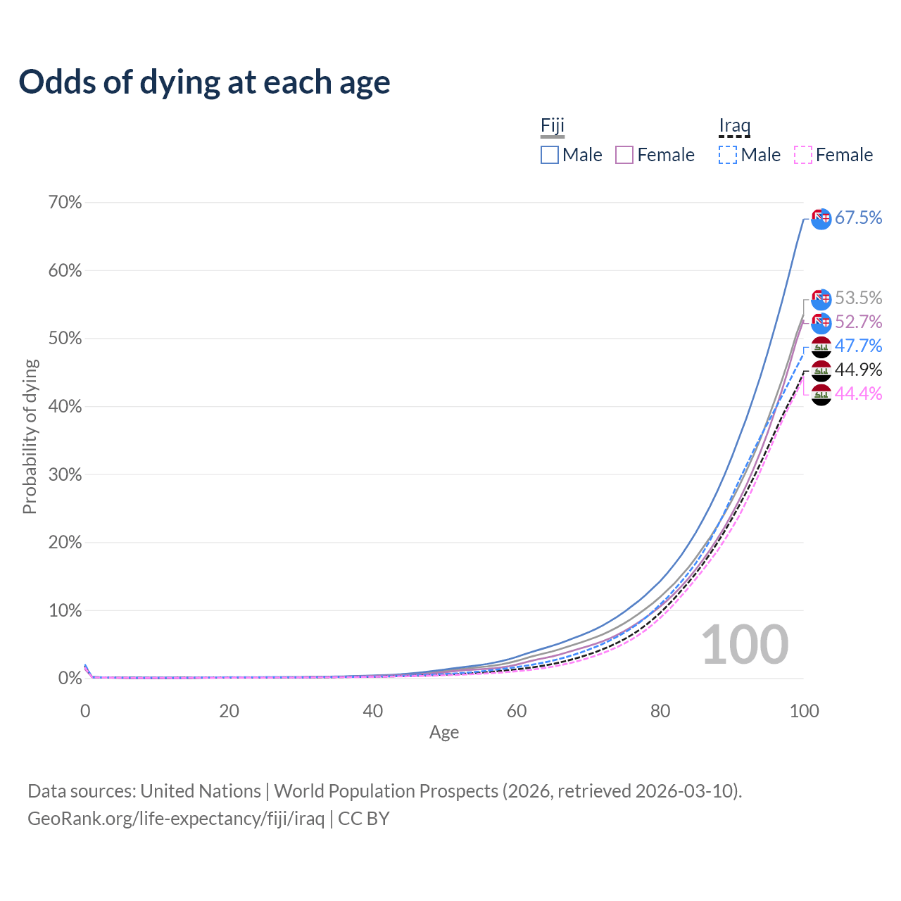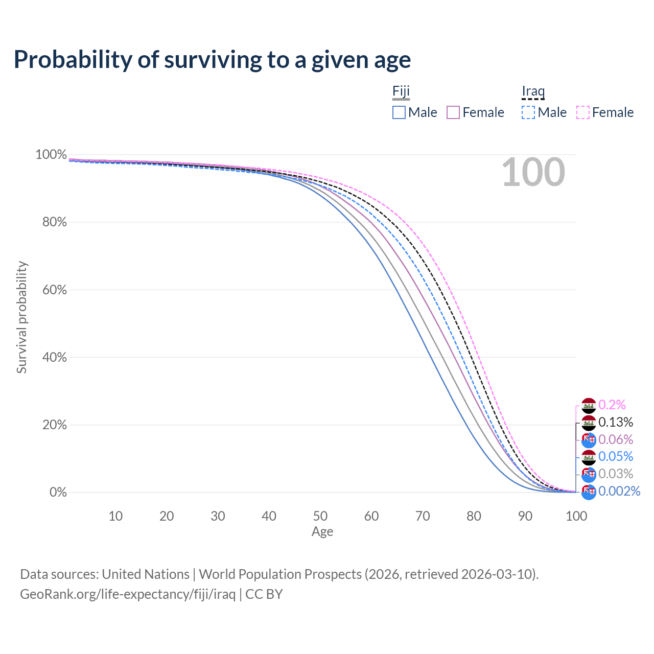This life expectancy calculator shows the odds of living to 100, 95, 90, and below based on current age for both males and females in Fiji and Iraq, along with mean and median age of death. The calculations are based on the 2026 life tables (actuarial tables) from the UN World Population Prospects.