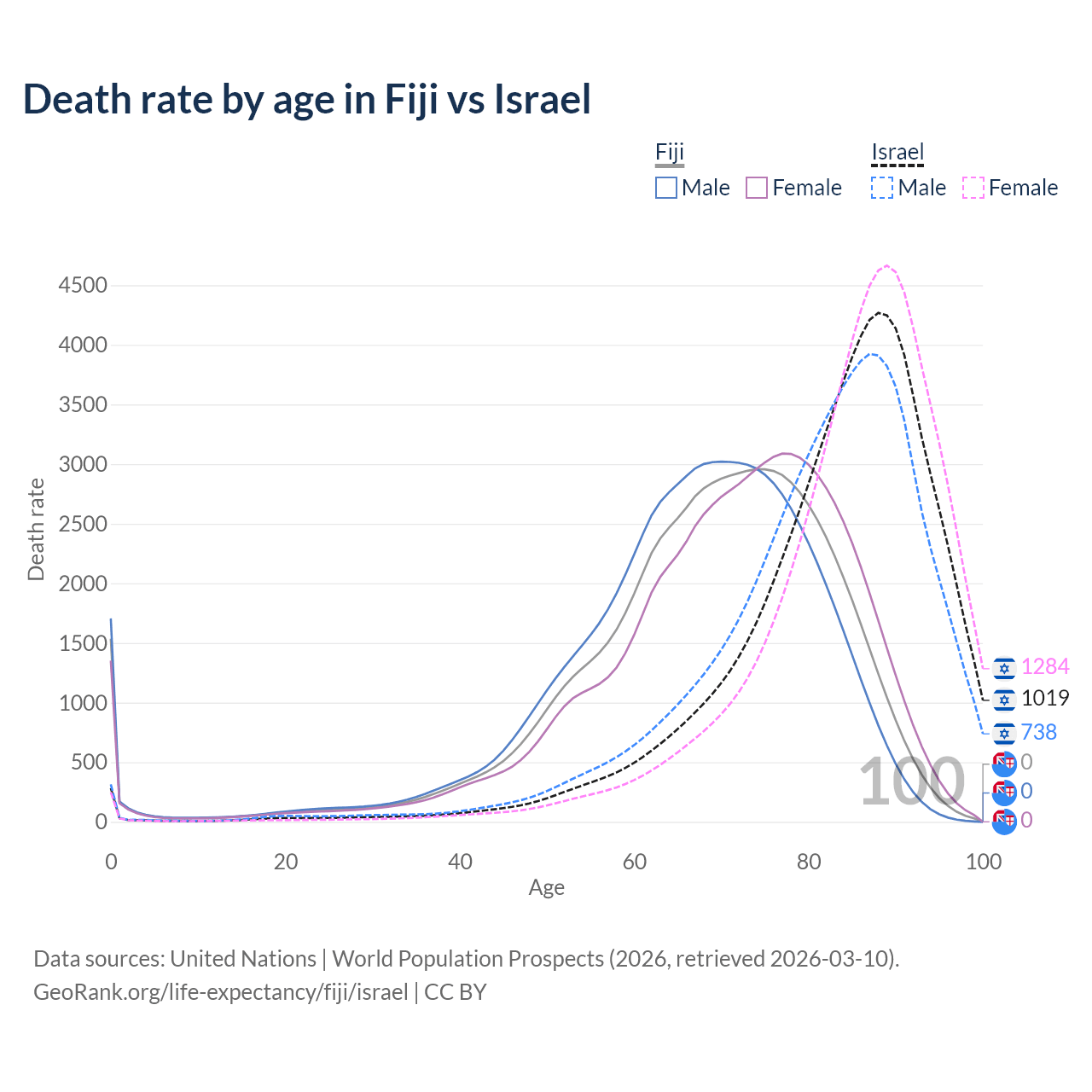 In Fiji, the most common age of death is 74, compared to 88 in Israel. The median age of death is 70.5 in Fiji and 85.6 in Israel, meaning only half of each cohort is expected to live past that age.