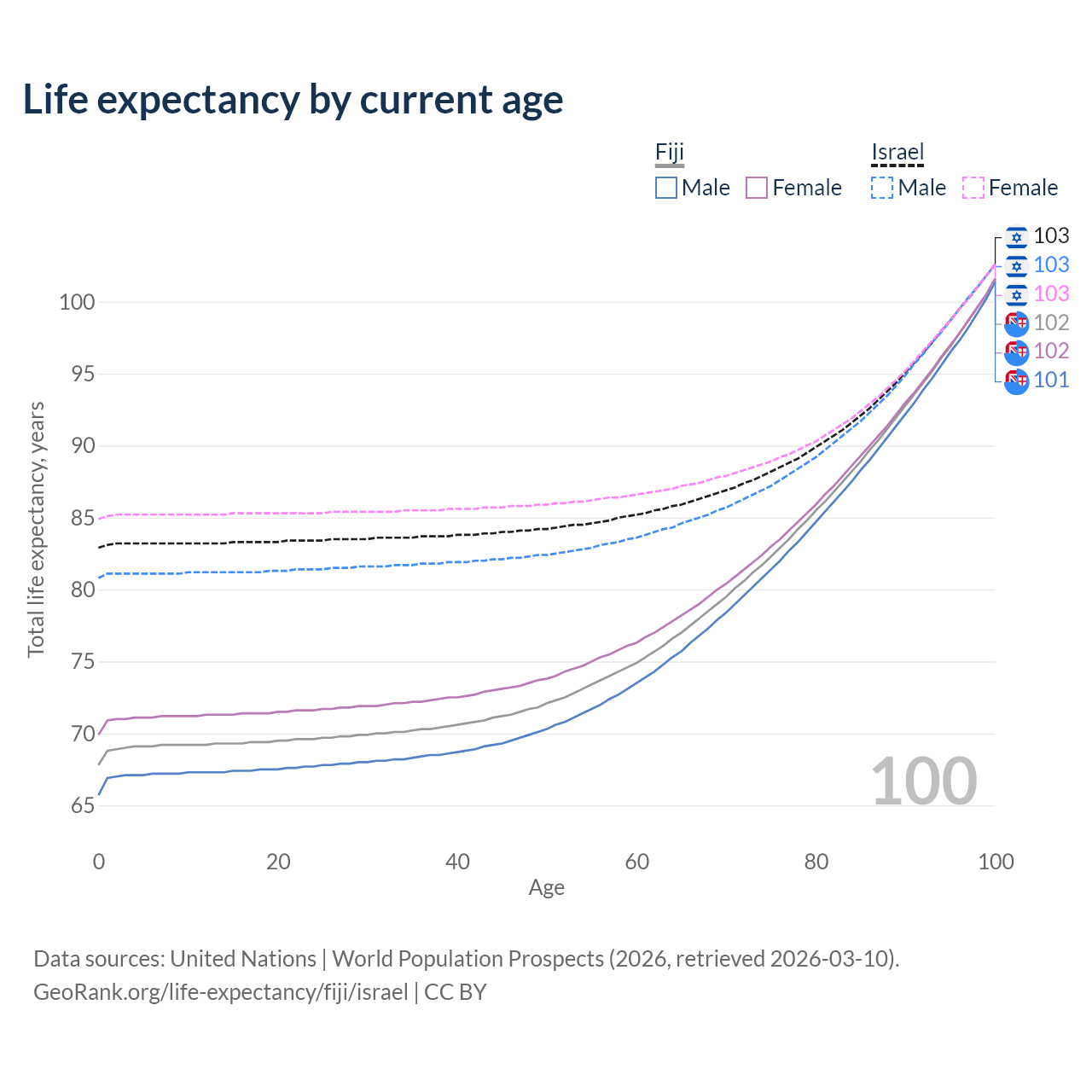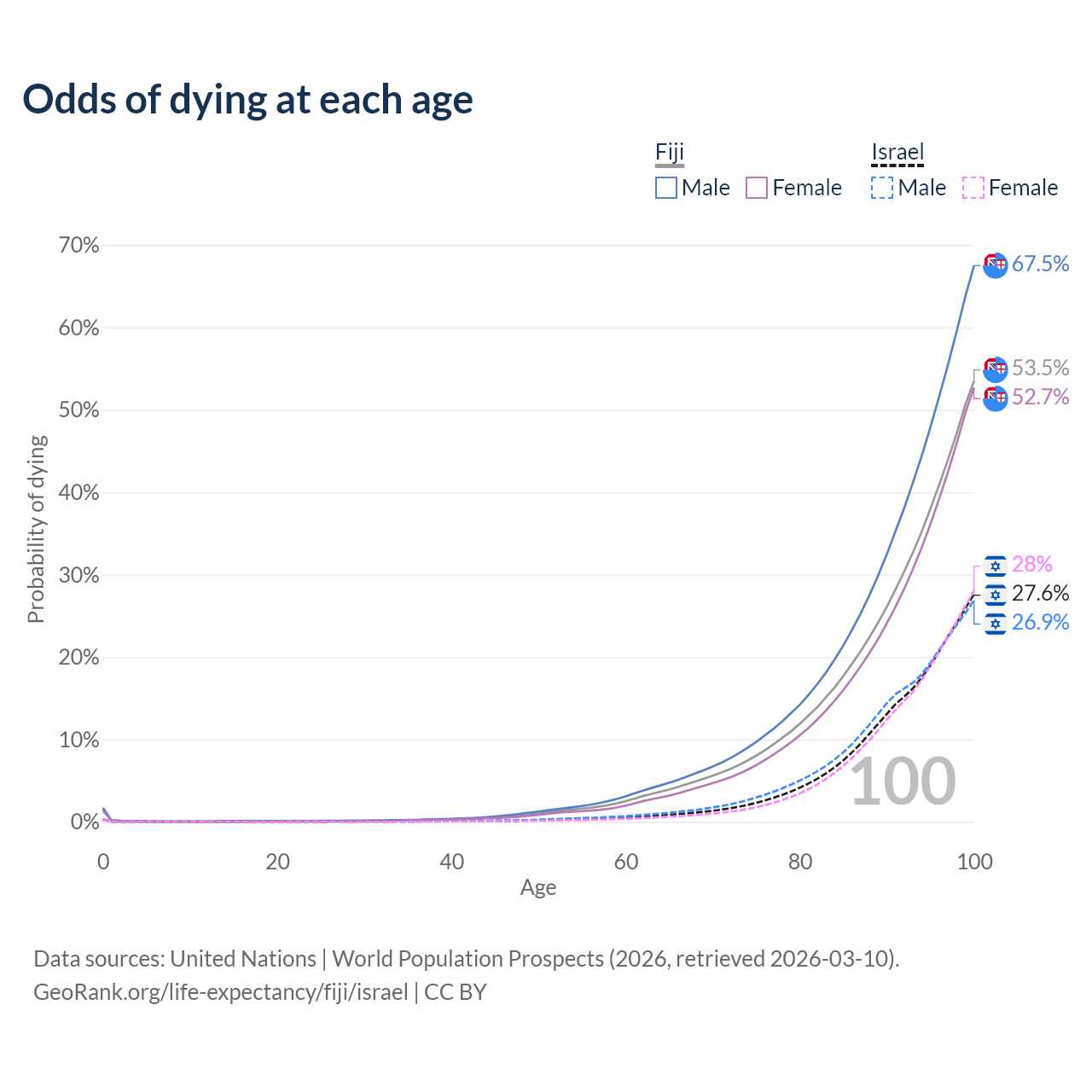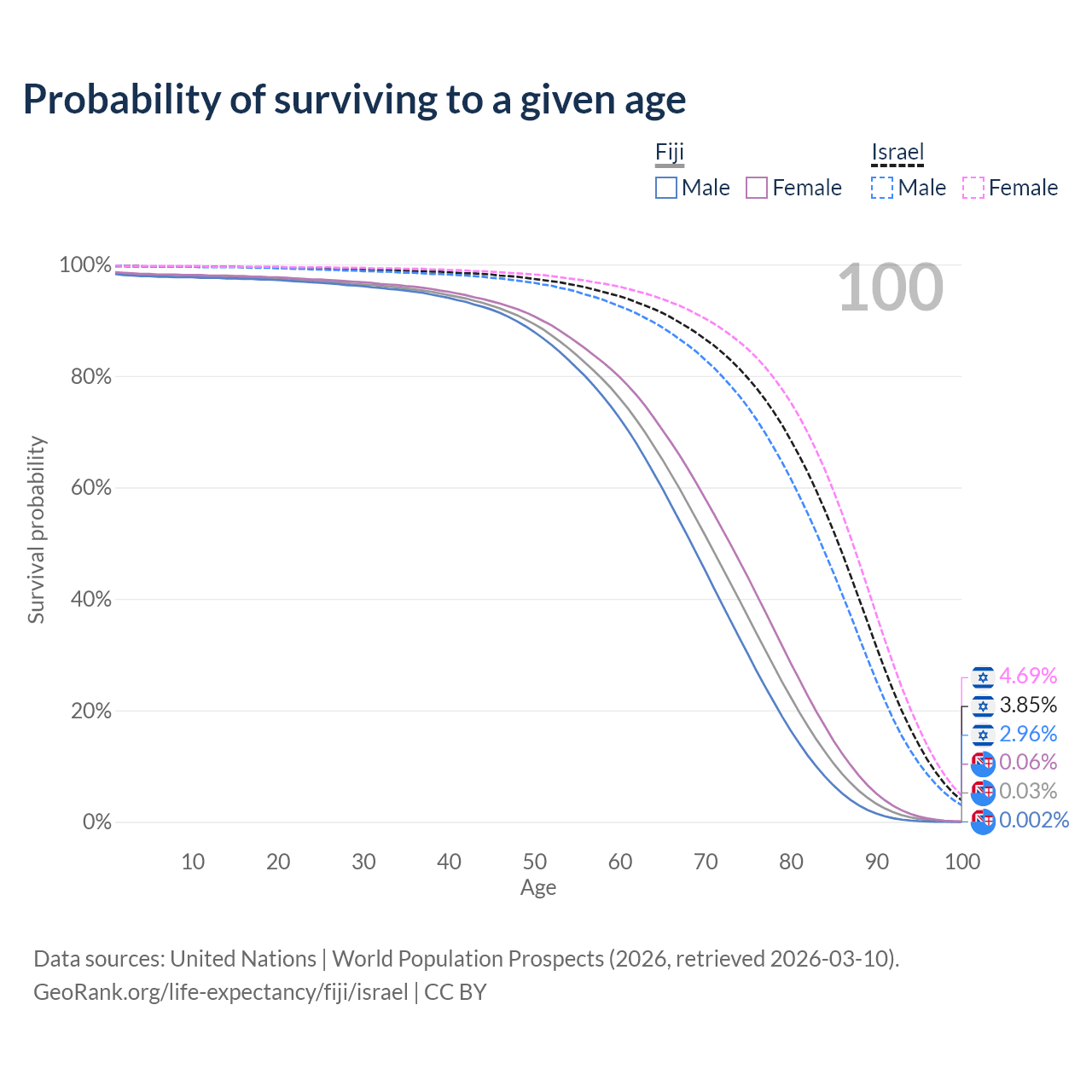 This life expectancy calculator shows the odds of living to 100, 95, 90, and below based on current age for both males and females in Fiji and Israel, along with mean and median age of death. The calculations are based on the 2026 life tables (actuarial tables) from the UN World Population Prospects.