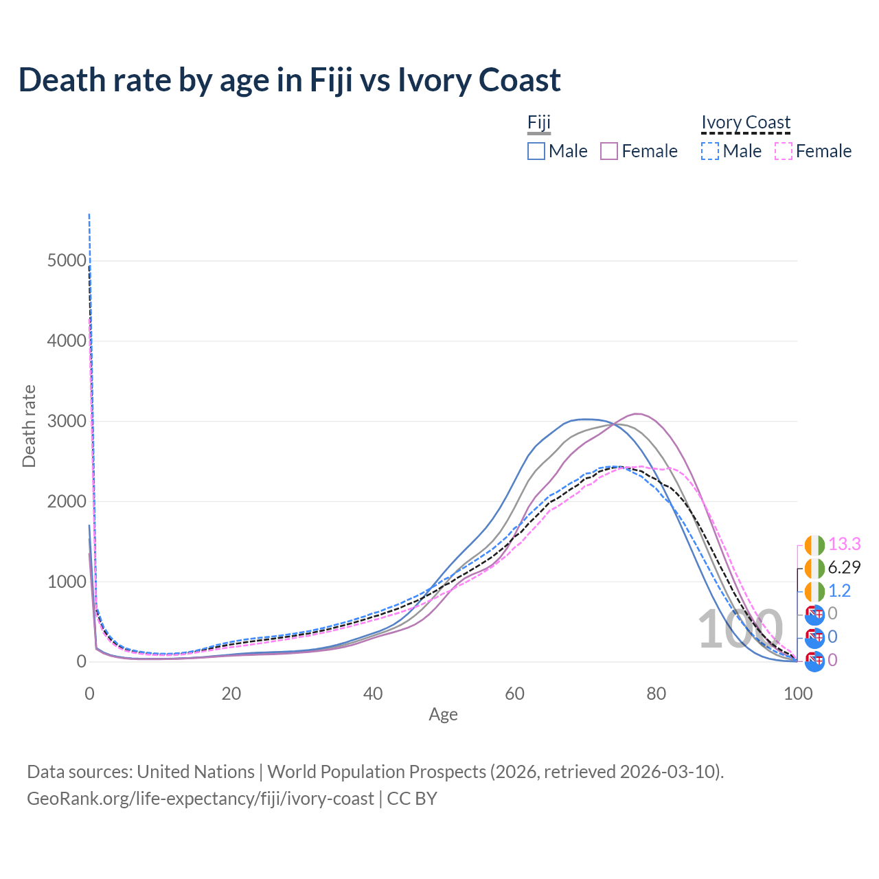 In Fiji, the most common age of death is 74, compared to 0 in Ivory Coast. The median age of death is 70.5 in Fiji and 68.6 in Ivory Coast, meaning only half of each cohort is expected to live past that age.