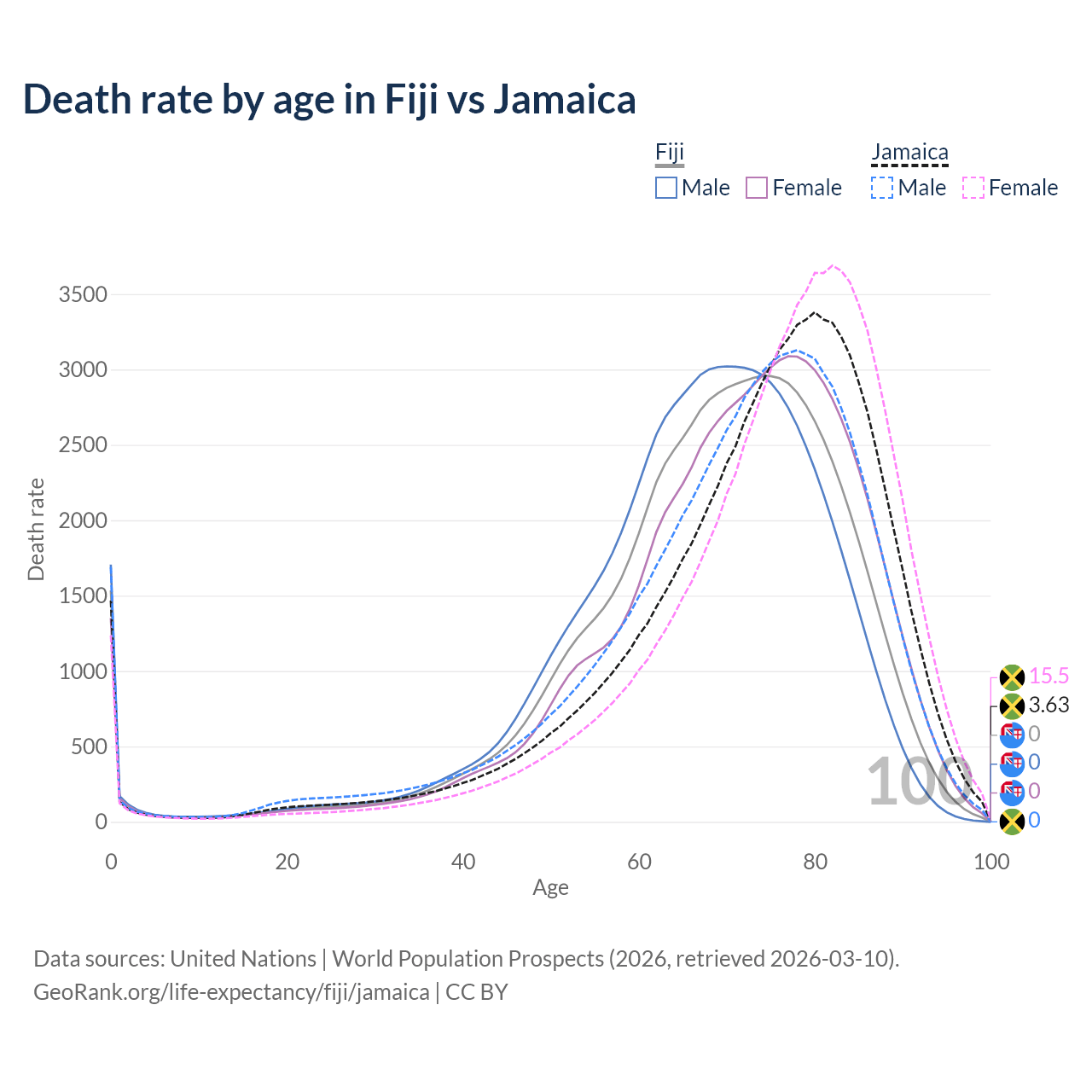 In Fiji, the most common age of death is 74, compared to 80 in Jamaica. The median age of death is 70.5 in Fiji and 75.7 in Jamaica, meaning only half of each cohort is expected to live past that age.