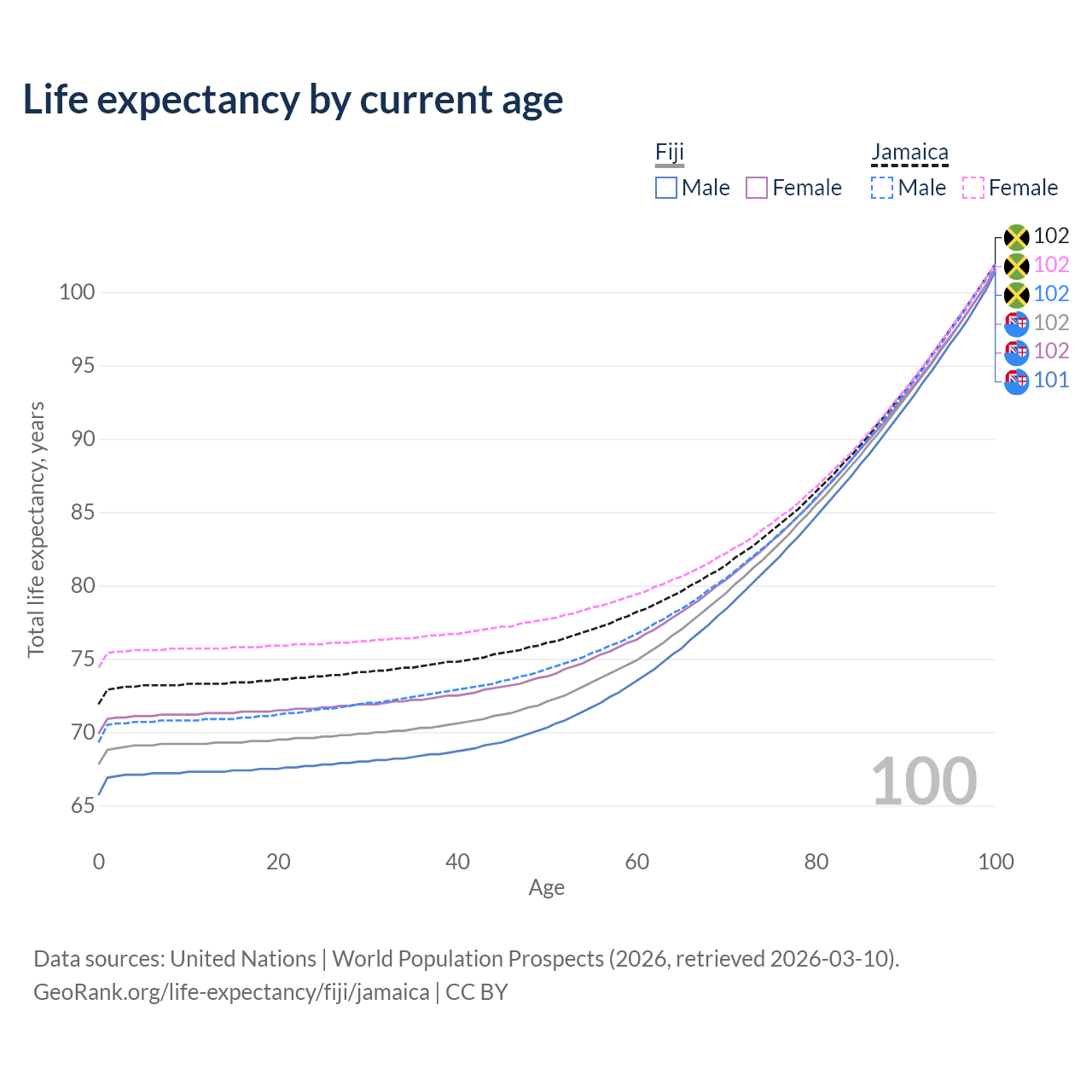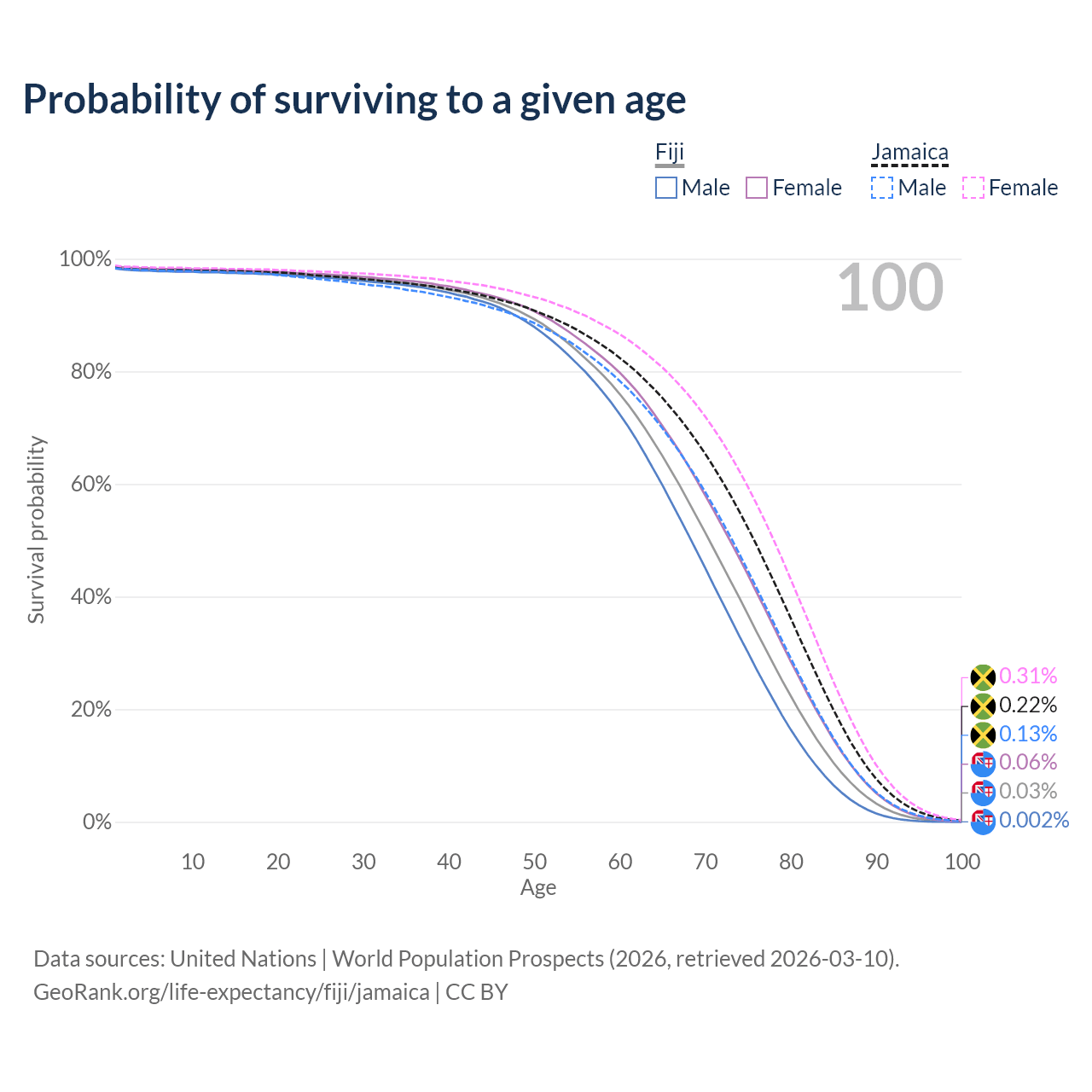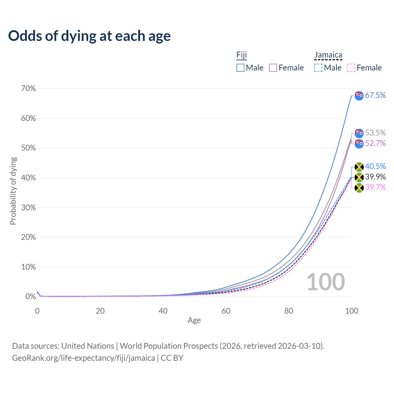 This life expectancy calculator shows the odds of living to 100, 95, 90, and below based on current age for both males and females in Fiji and Jamaica, along with mean and median age of death. The calculations are based on the 2026 life tables (actuarial tables) from the UN World Population Prospects.