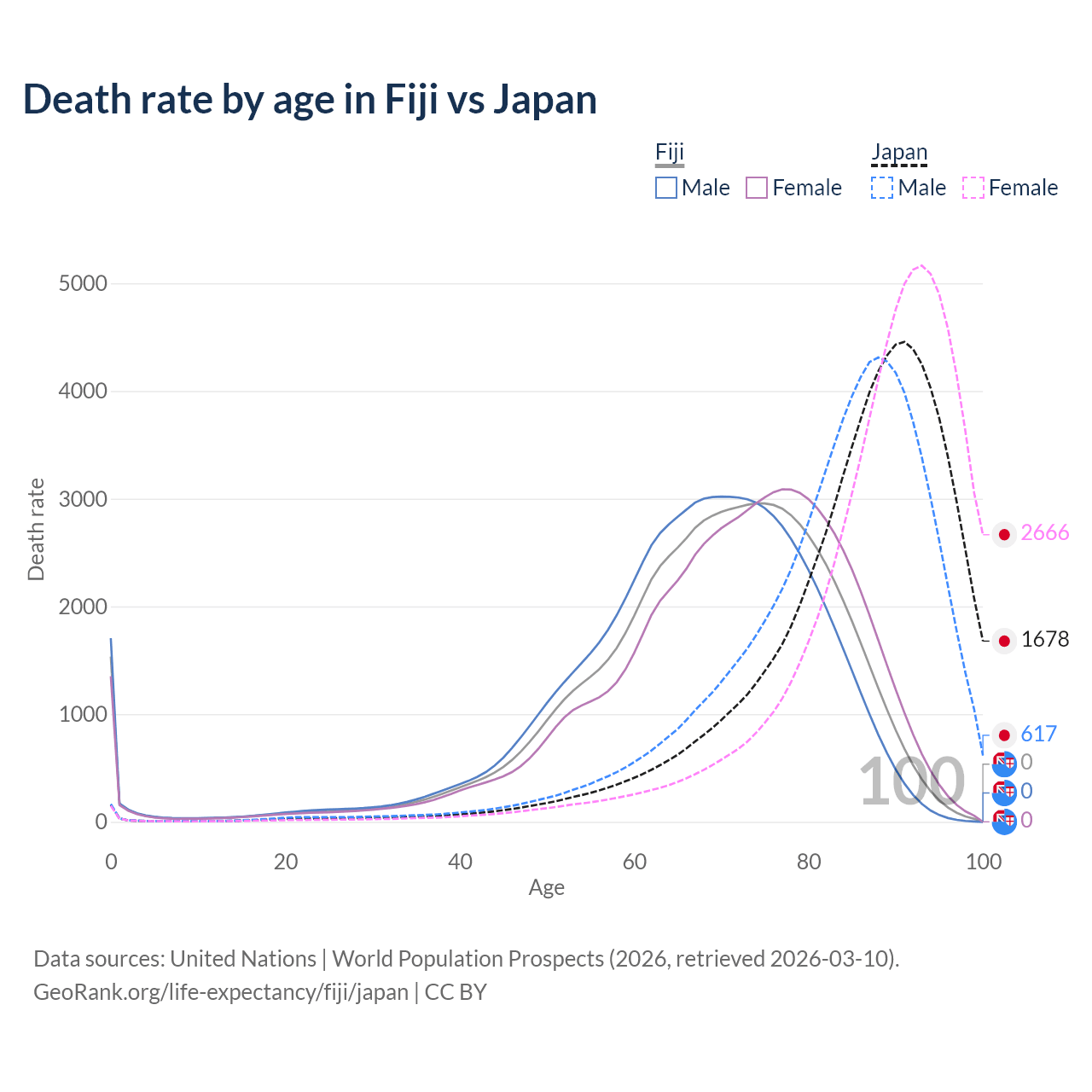 In Fiji, the most common age of death is 74, compared to 91 in Japan. The median age of death is 70.5 in Fiji and 88.1 in Japan, meaning only half of each cohort is expected to live past that age.