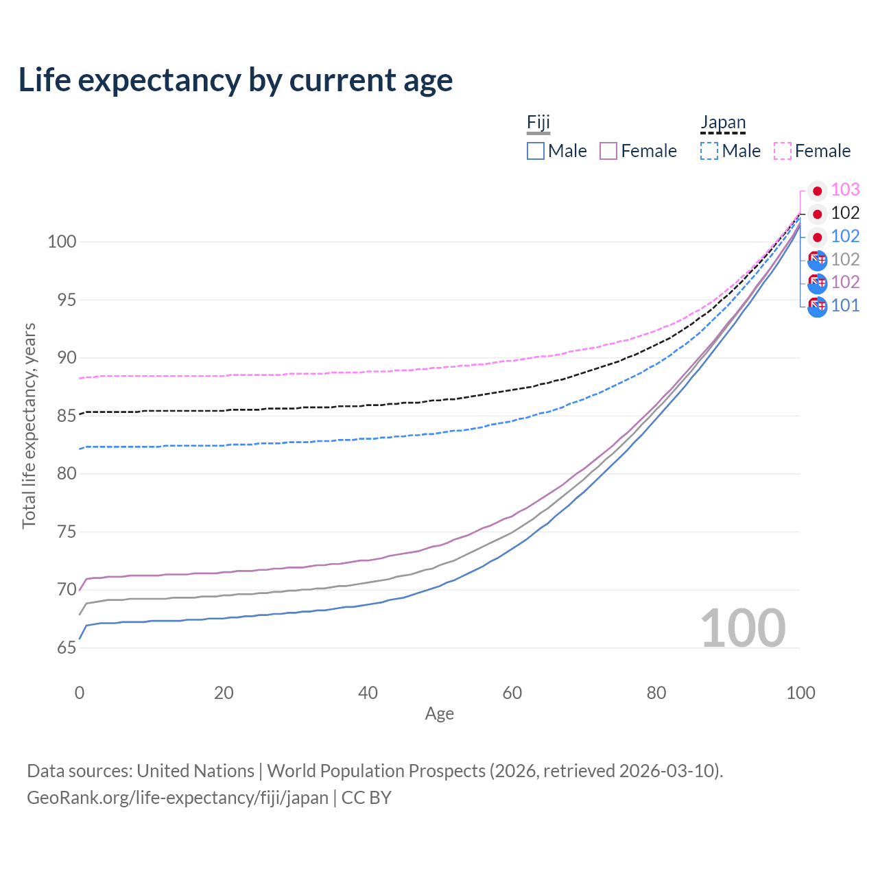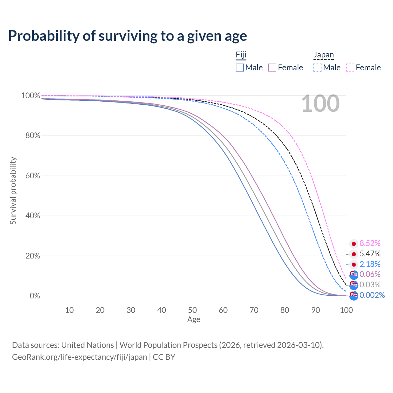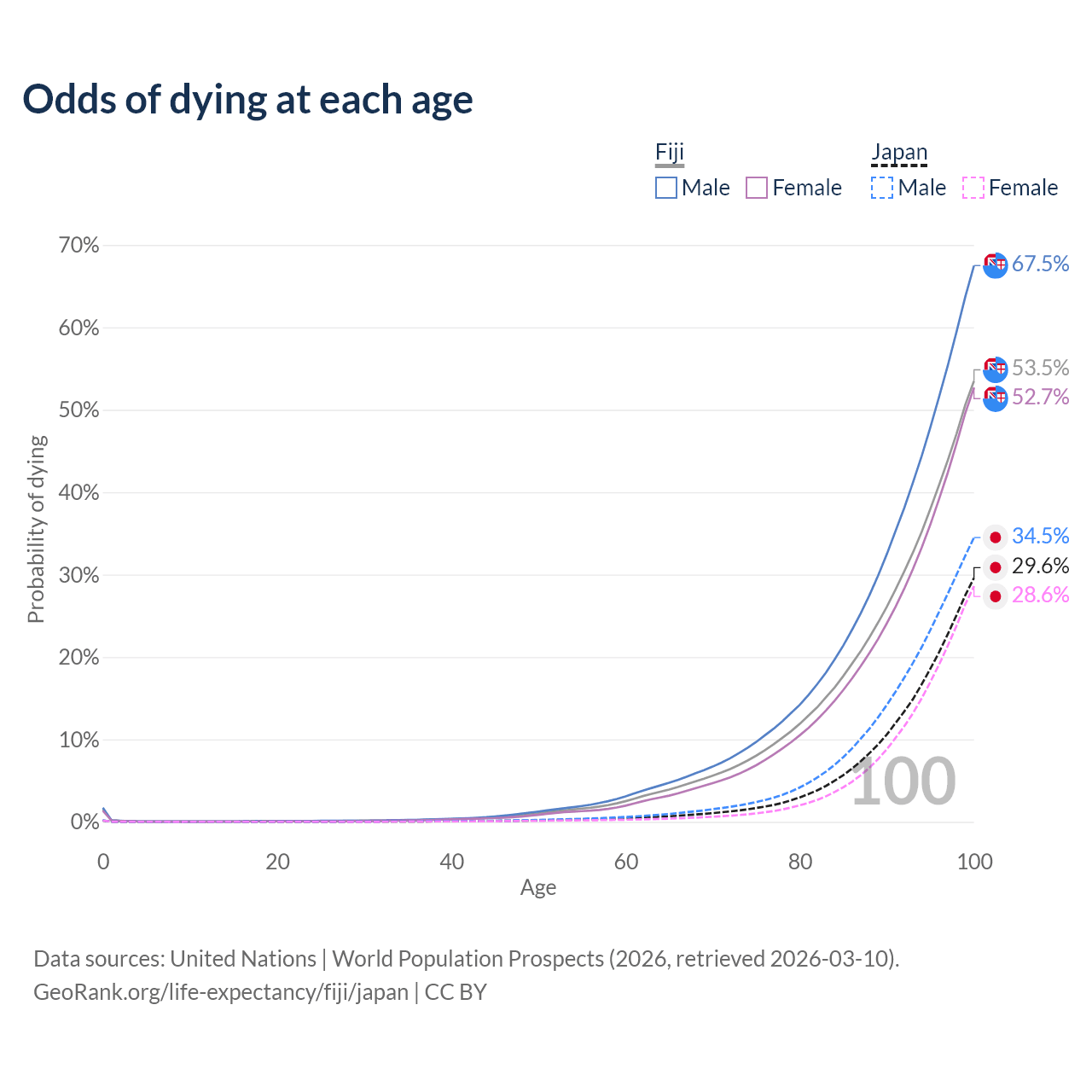 This life expectancy calculator shows the odds of living to 100, 95, 90, and below based on current age for both males and females in Fiji and Japan, along with mean and median age of death. The calculations are based on the 2026 life tables (actuarial tables) from the UN World Population Prospects.