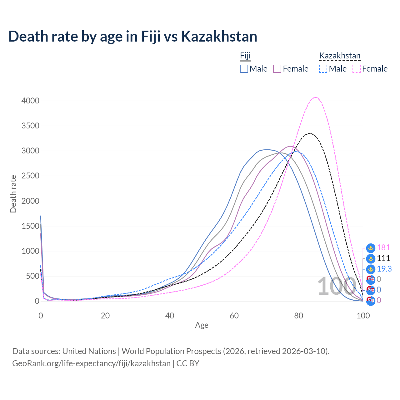 In Fiji, the most common age of death is 74, compared to 84 in Kazakhstan. The median age of death is 70.5 in Fiji and 78.6 in Kazakhstan, meaning only half of each cohort is expected to live past that age.