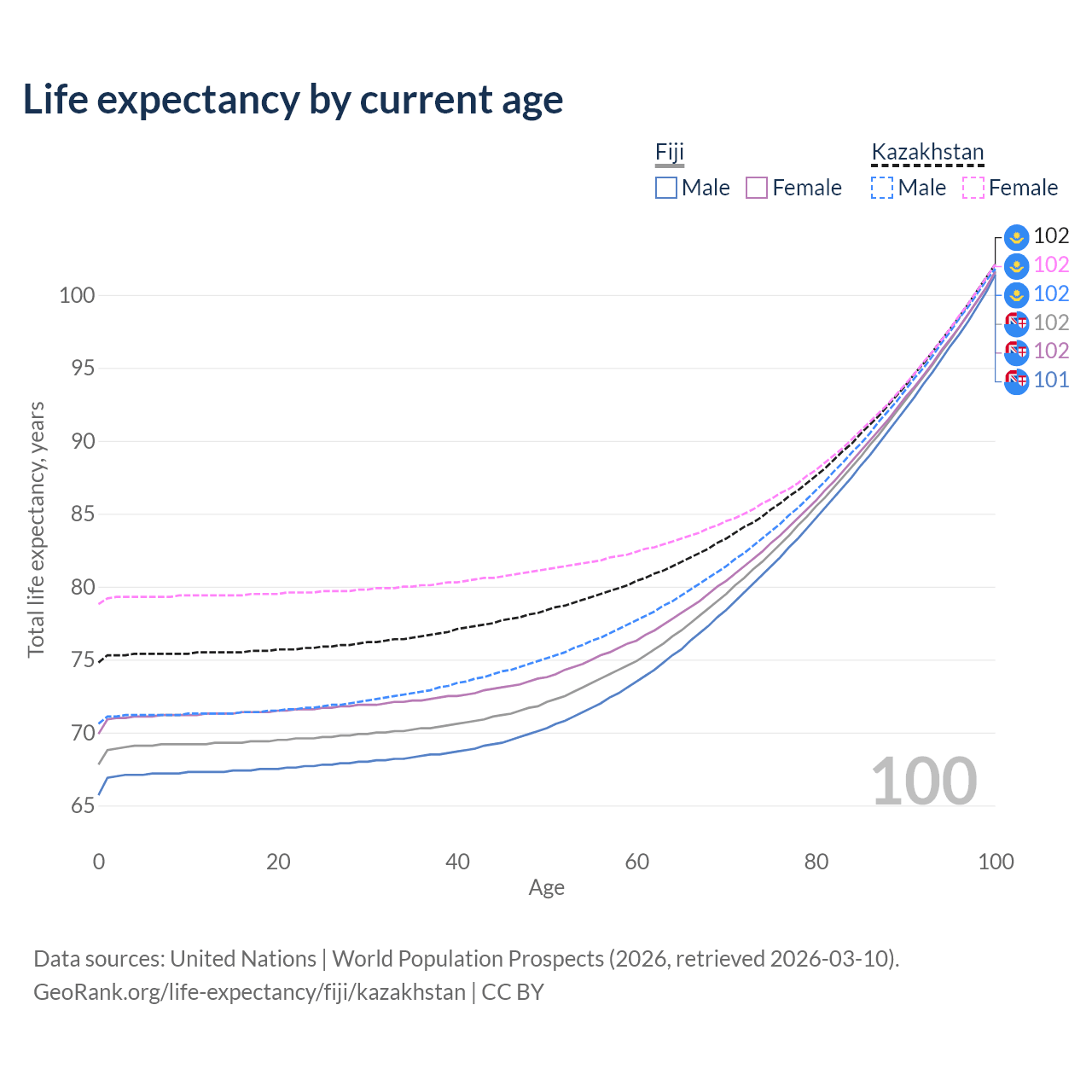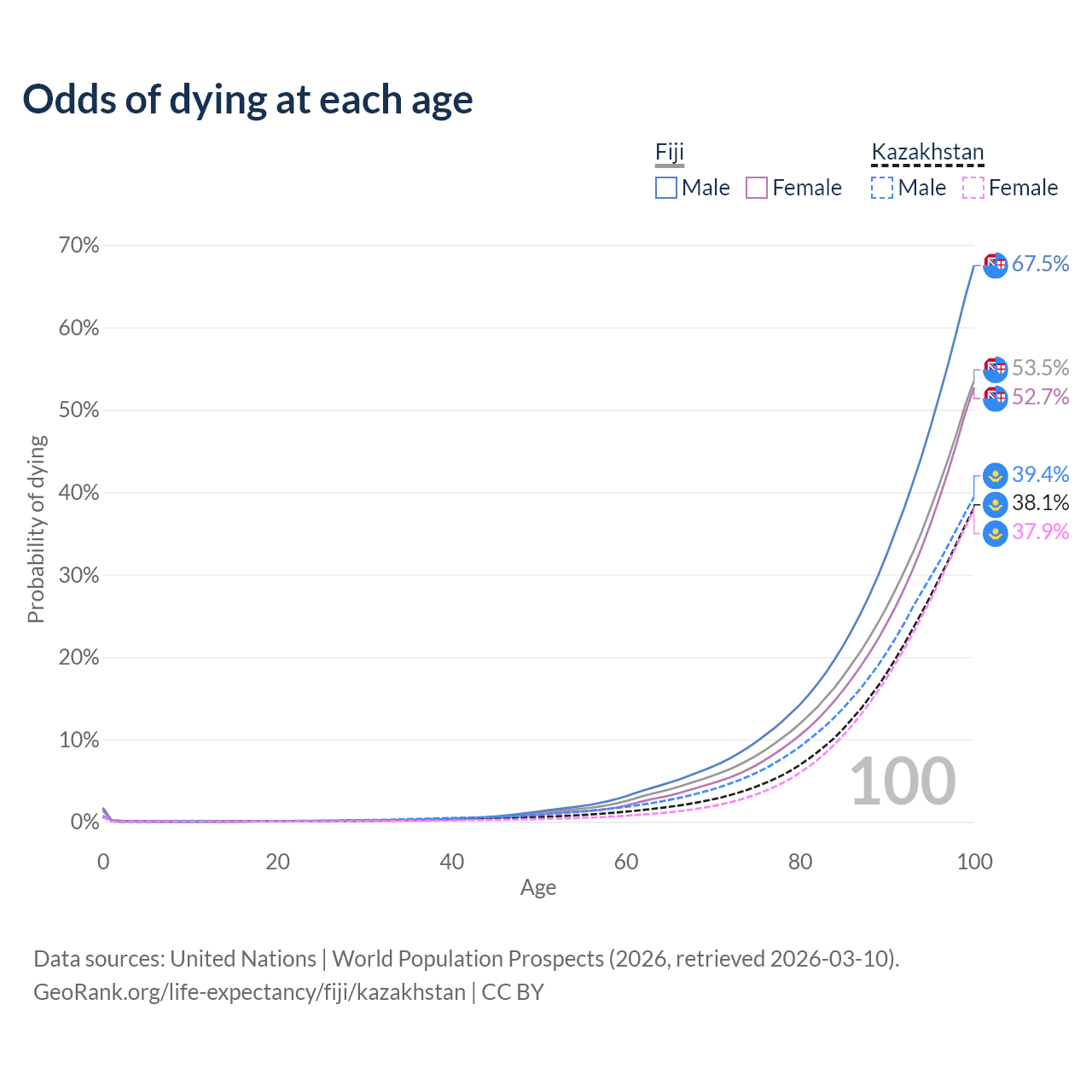 This life expectancy calculator shows the odds of living to 100, 95, 90, and below based on current age for both males and females in Fiji and Kazakhstan, along with mean and median age of death. The calculations are based on the 2026 life tables (actuarial tables) from the UN World Population Prospects.