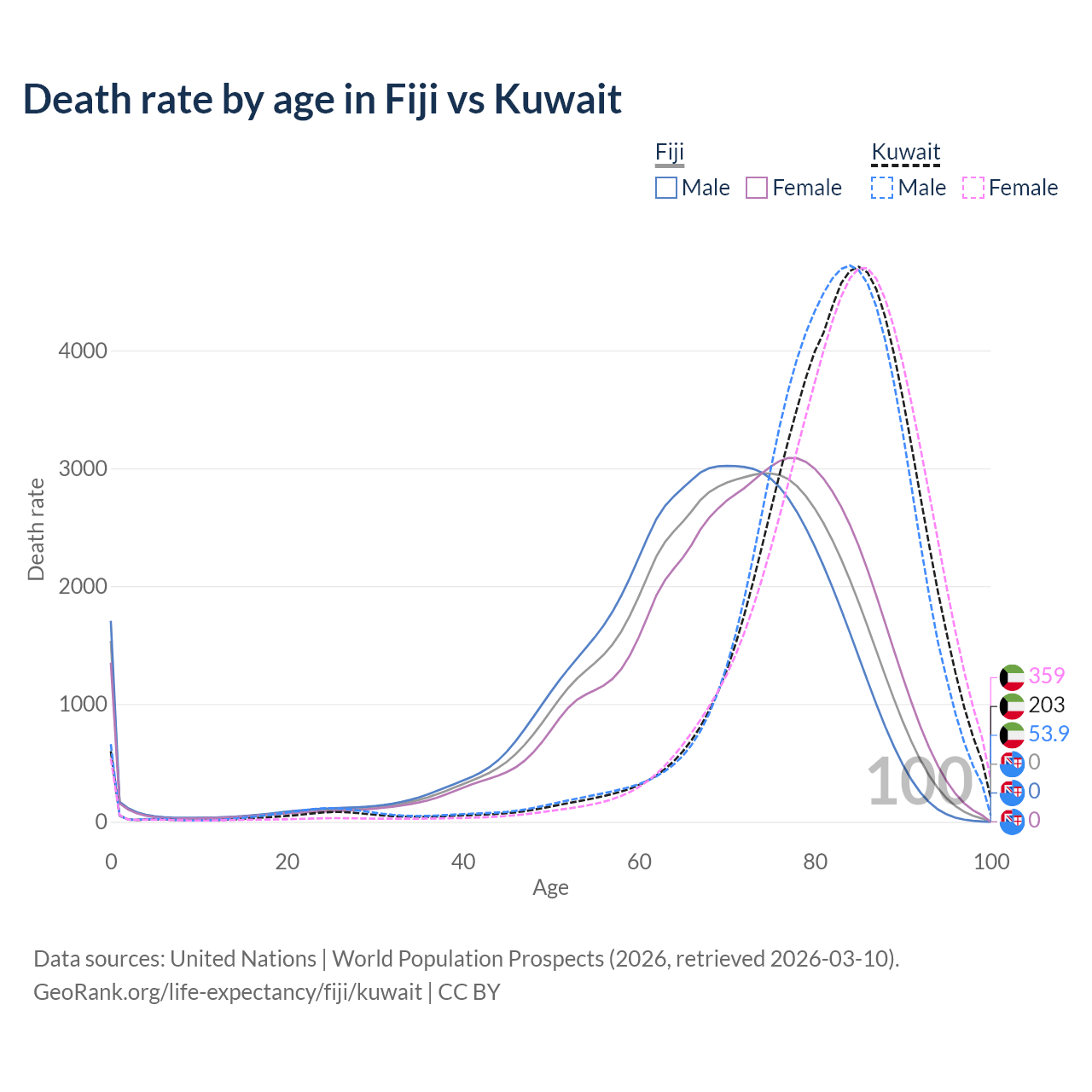 In Fiji, the most common age of death is 74, compared to 85 in Kuwait. The median age of death is 70.5 in Fiji and 83.3 in Kuwait, meaning only half of each cohort is expected to live past that age.