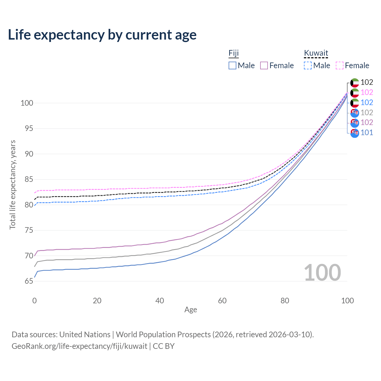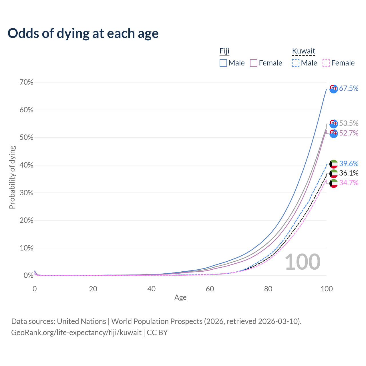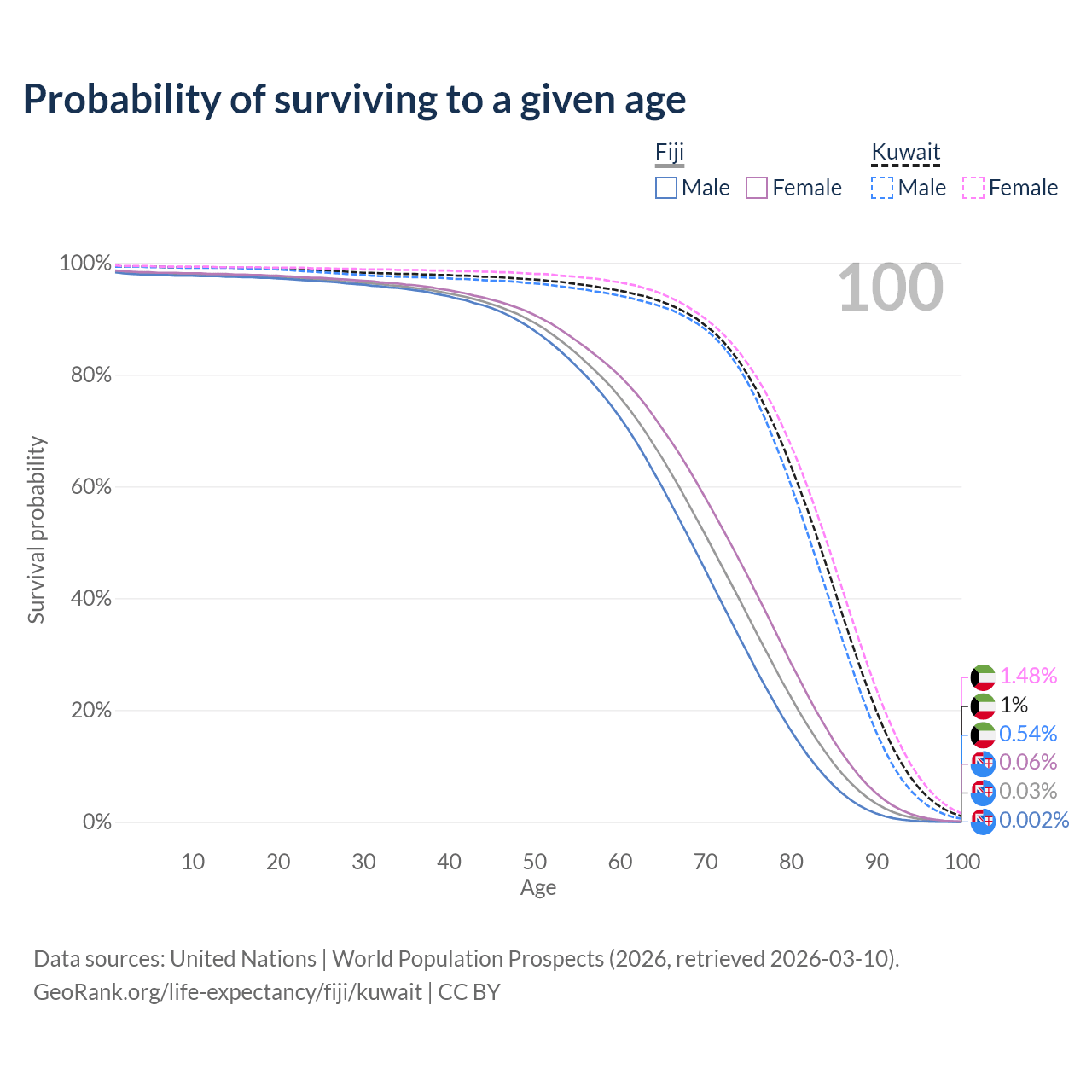 This life expectancy calculator shows the odds of living to 100, 95, 90, and below based on current age for both males and females in Fiji and Kuwait, along with mean and median age of death. The calculations are based on the 2026 life tables (actuarial tables) from the UN World Population Prospects.
