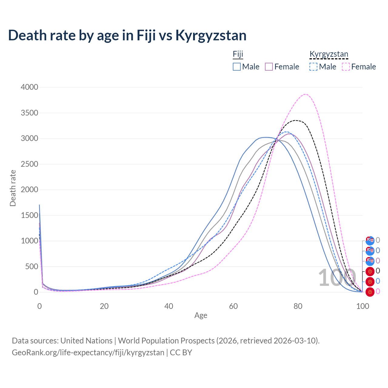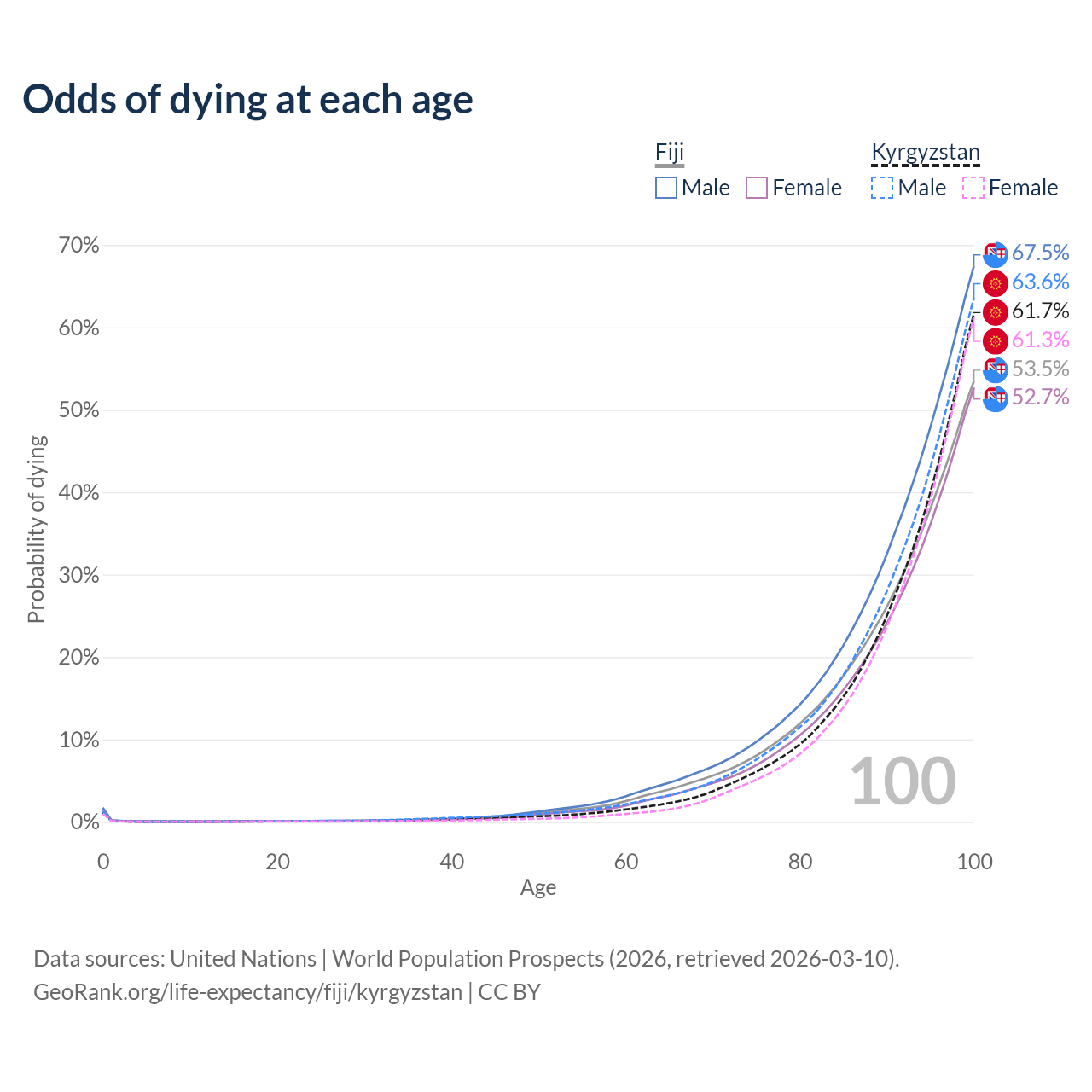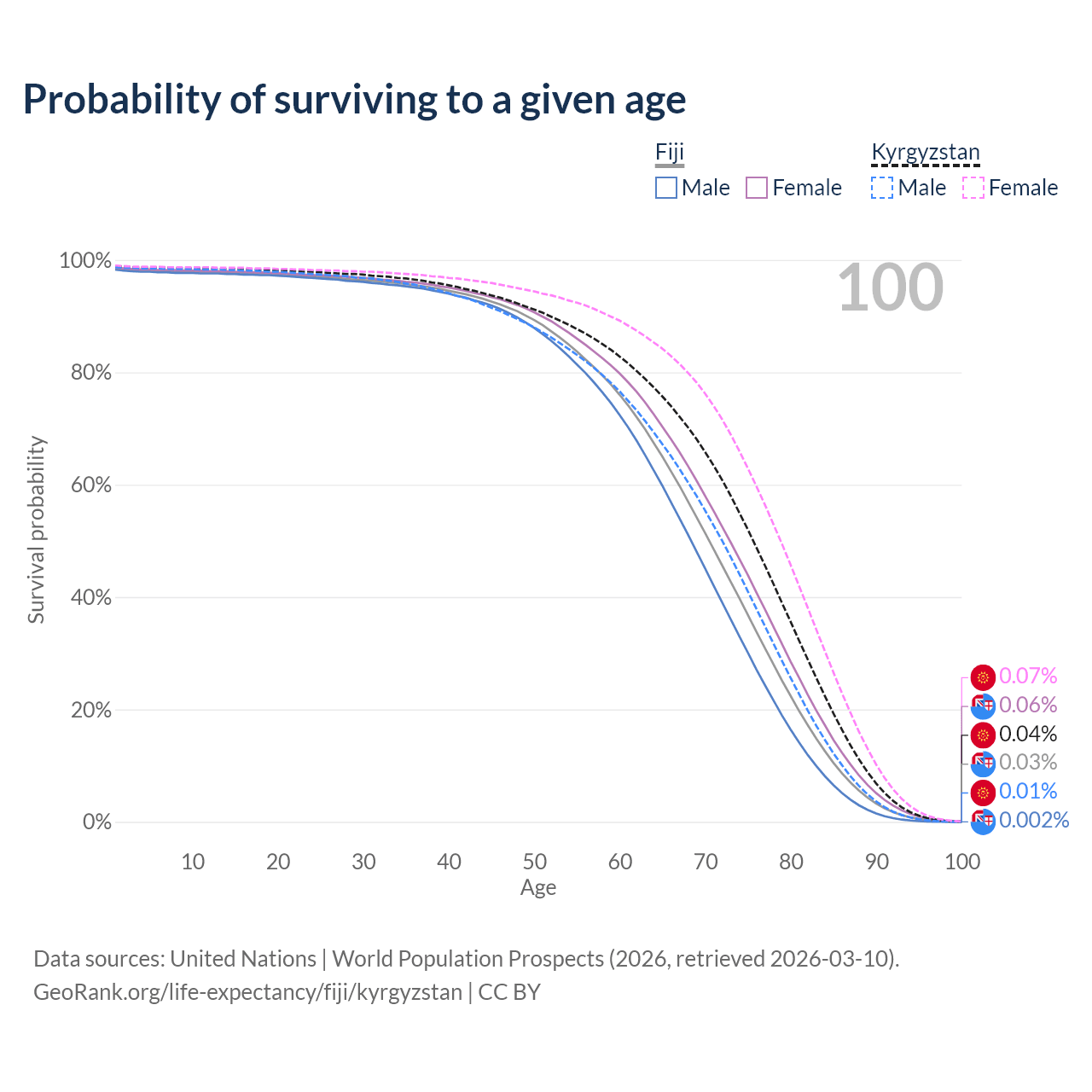 This life expectancy calculator shows the odds of living to 100, 95, 90, and below based on current age for both males and females in Fiji and Kyrgyzstan, along with mean and median age of death. The calculations are based on the 2026 life tables (actuarial tables) from the UN World Population Prospects.