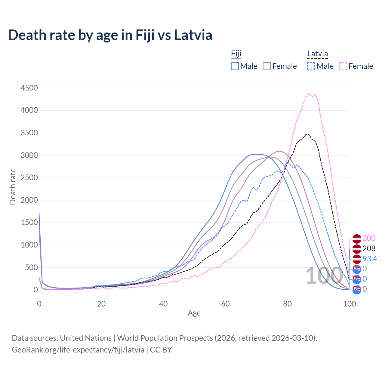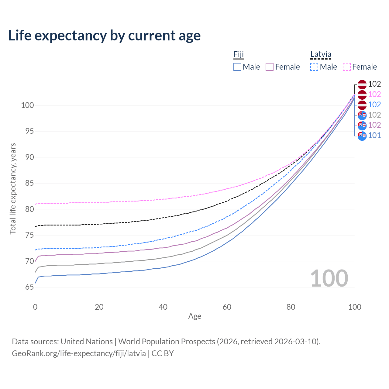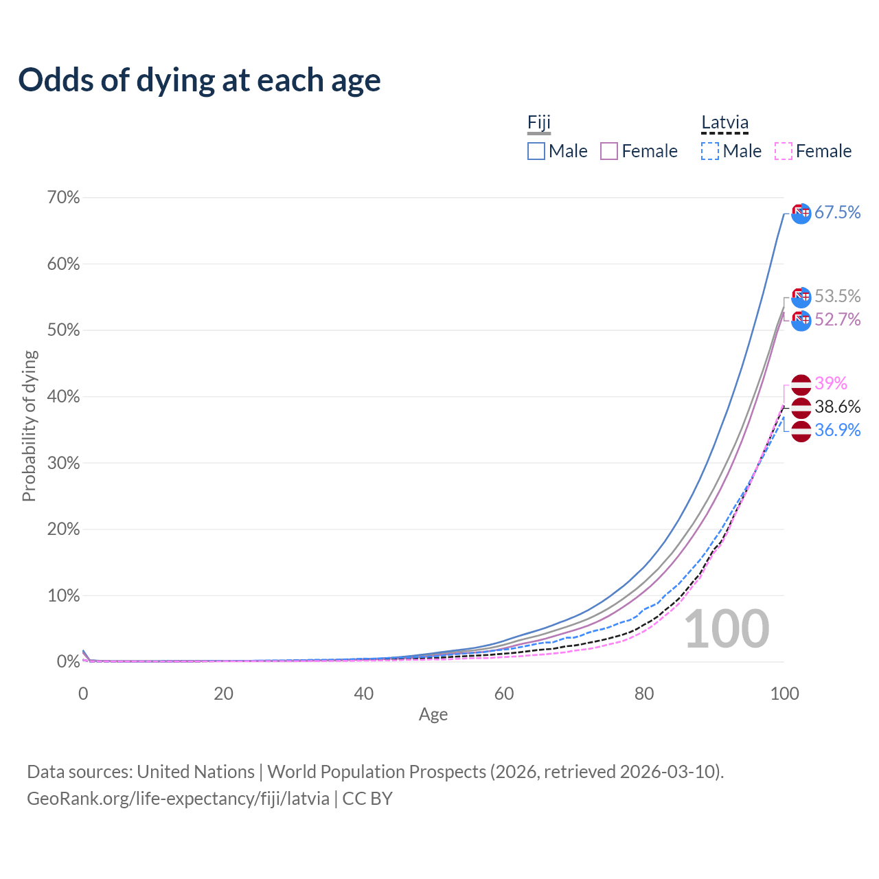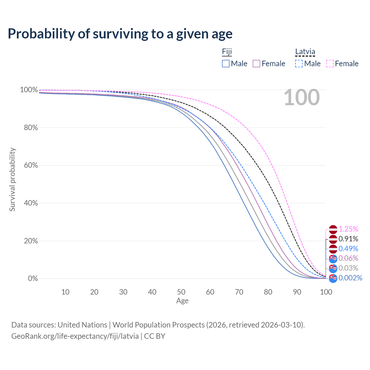 This life expectancy calculator shows the odds of living to 100, 95, 90, and below based on current age for both males and females in Fiji and Latvia, along with mean and median age of death. The calculations are based on the 2026 life tables (actuarial tables) from the UN World Population Prospects.