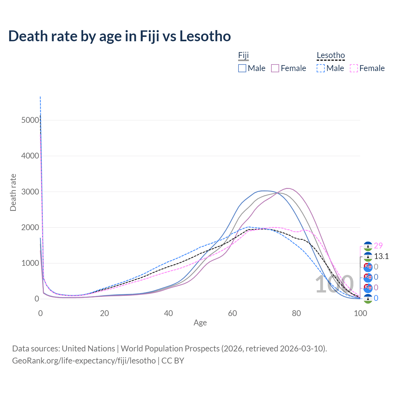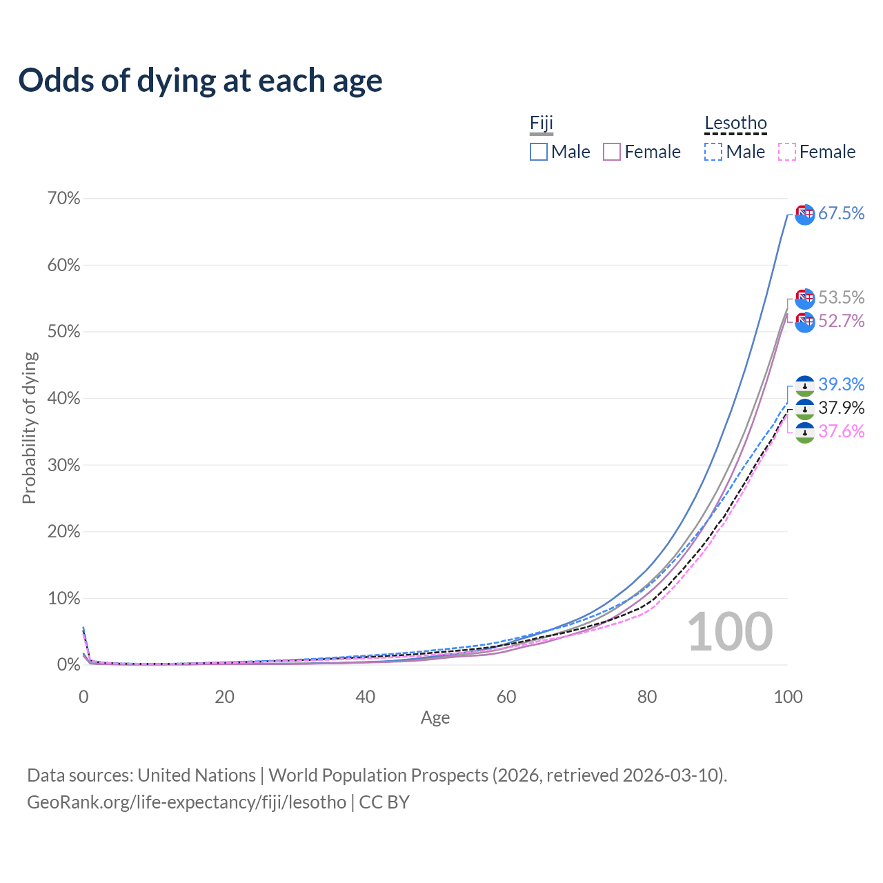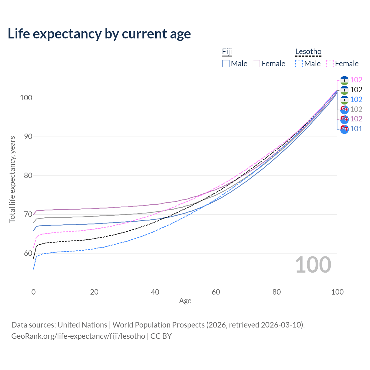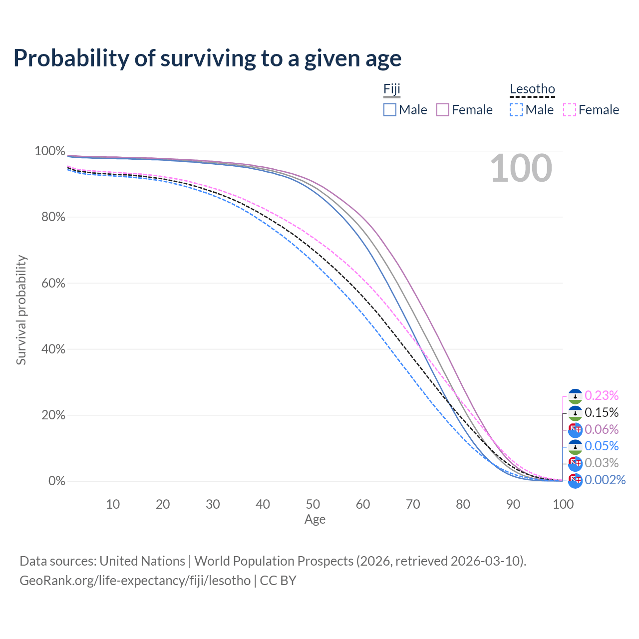 This life expectancy calculator shows the odds of living to 100, 95, 90, and below based on current age for both males and females in Fiji and Lesotho, along with mean and median age of death. The calculations are based on the 2026 life tables (actuarial tables) from the UN World Population Prospects.