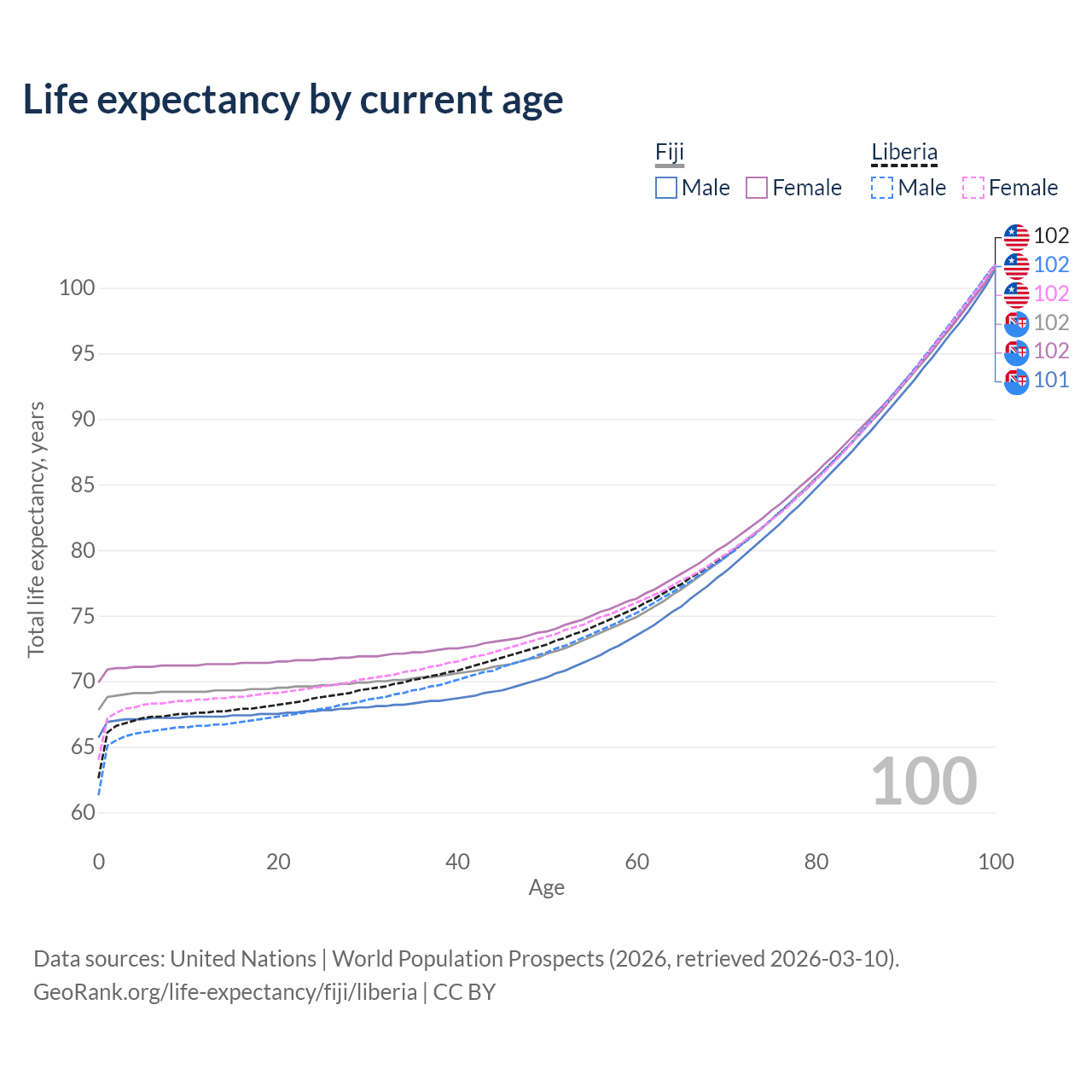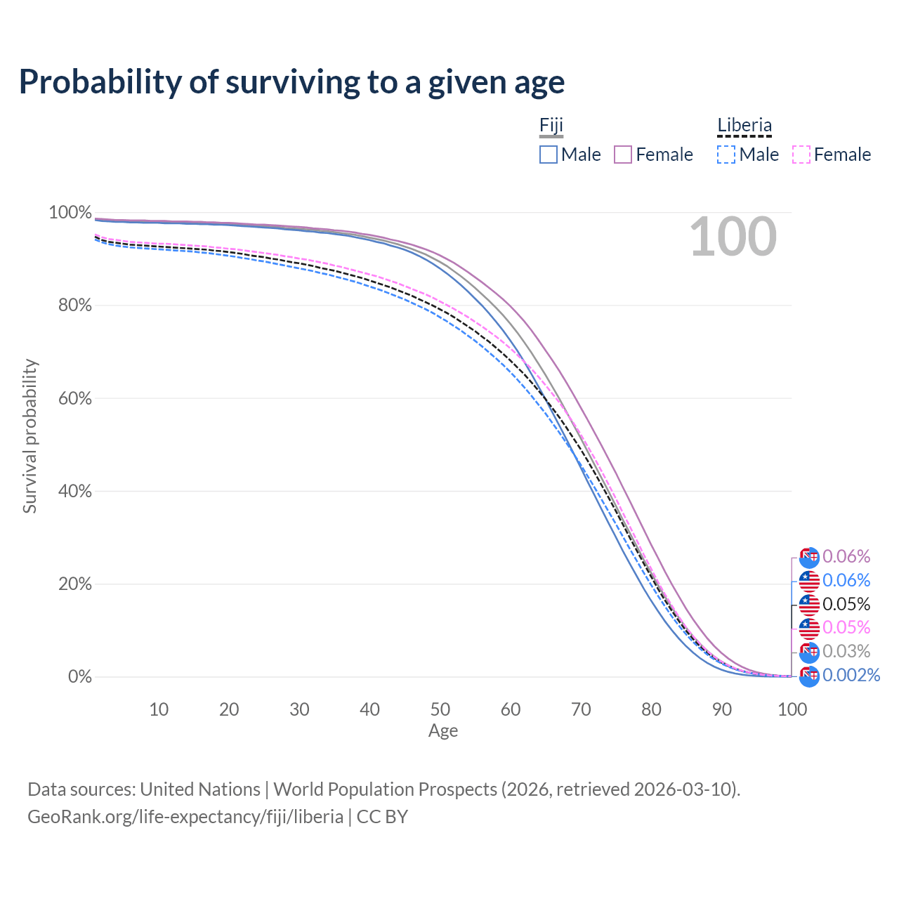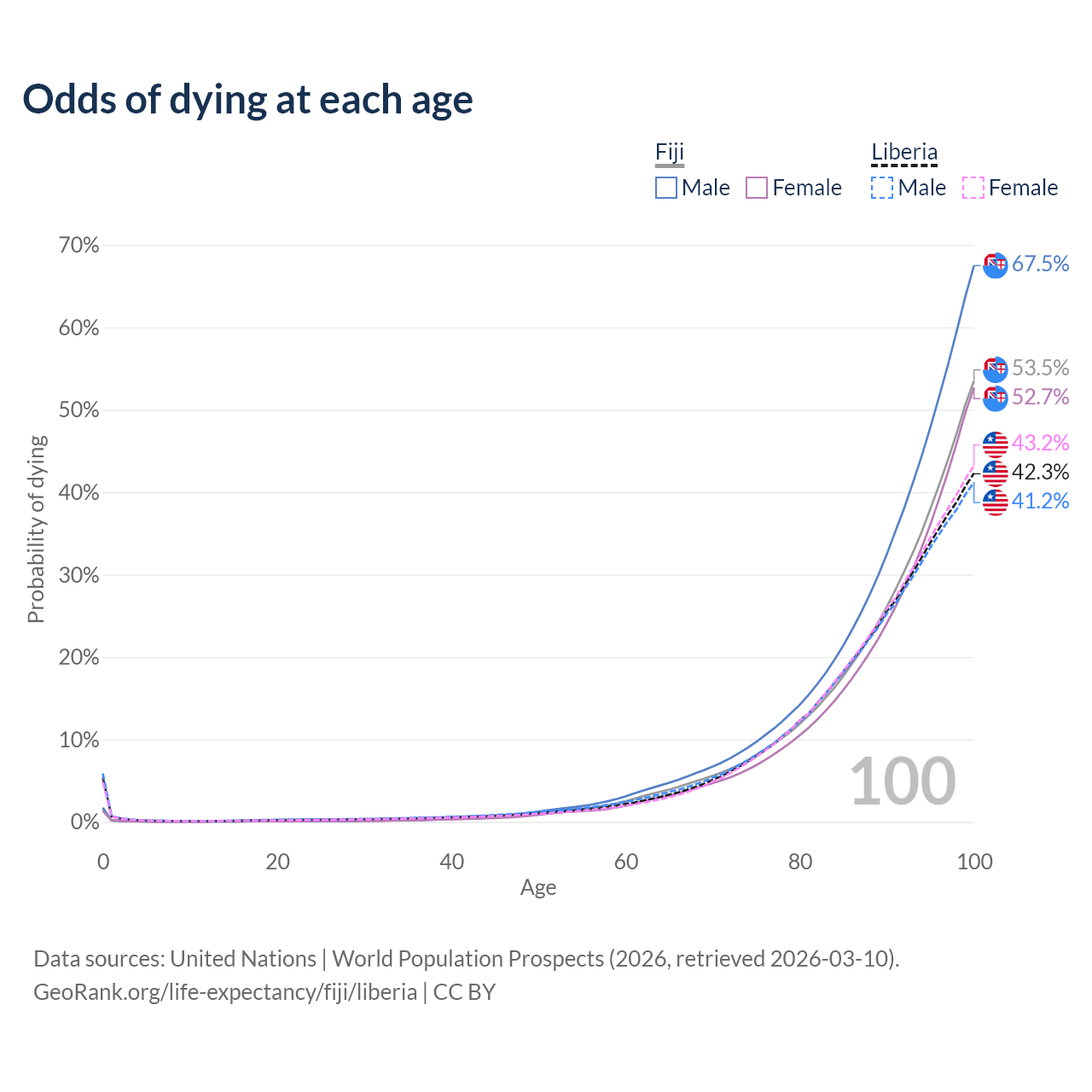 This life expectancy calculator shows the odds of living to 100, 95, 90, and below based on current age for both males and females in Fiji and Liberia, along with mean and median age of death. The calculations are based on the 2026 life tables (actuarial tables) from the UN World Population Prospects.