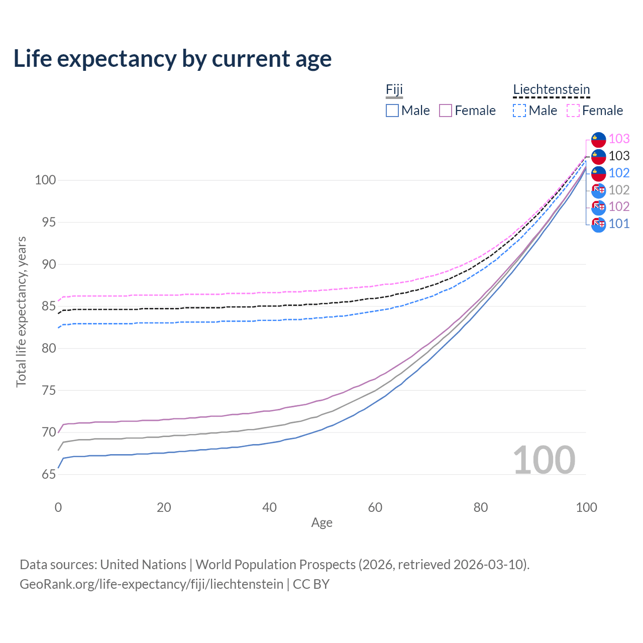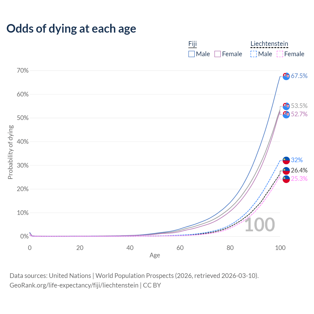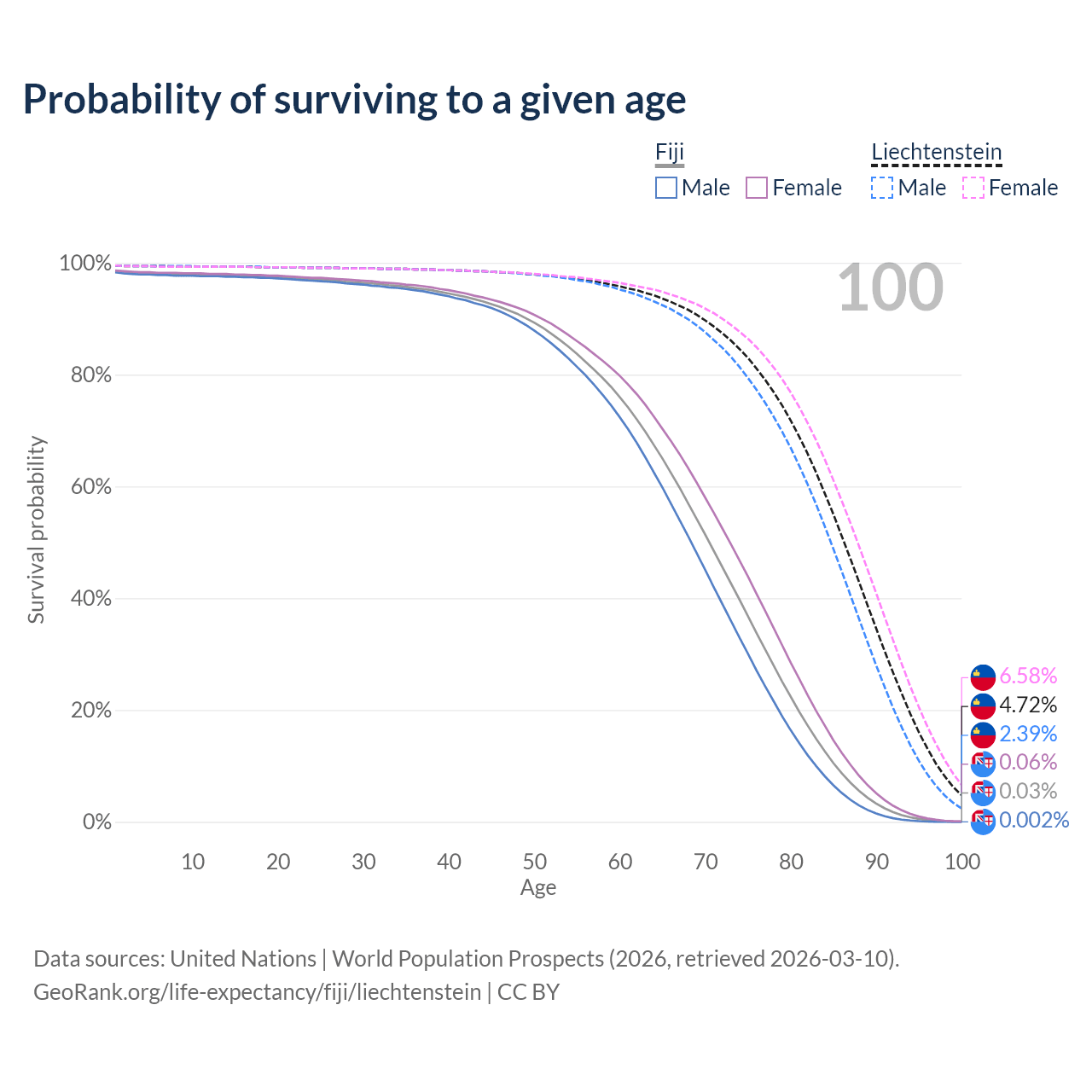 This life expectancy calculator shows the odds of living to 100, 95, 90, and below based on current age for both males and females in Fiji and Liechtenstein, along with mean and median age of death. The calculations are based on the 2026 life tables (actuarial tables) from the UN World Population Prospects.