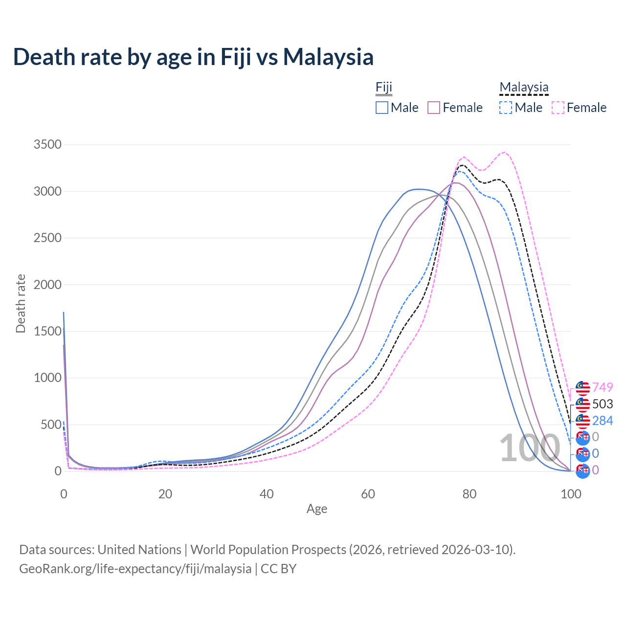 In Fiji, the most common age of death is 74, compared to 79 in Malaysia. The median age of death is 70.5 in Fiji and 79.8 in Malaysia, meaning only half of each cohort is expected to live past that age.