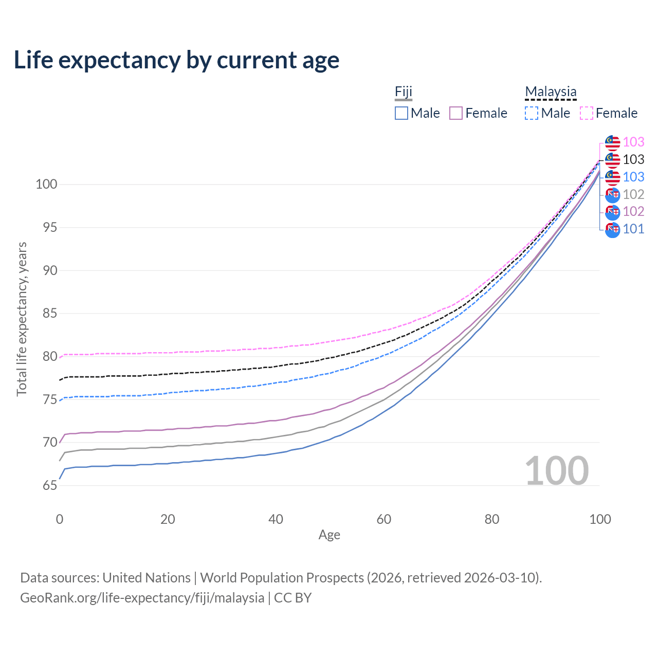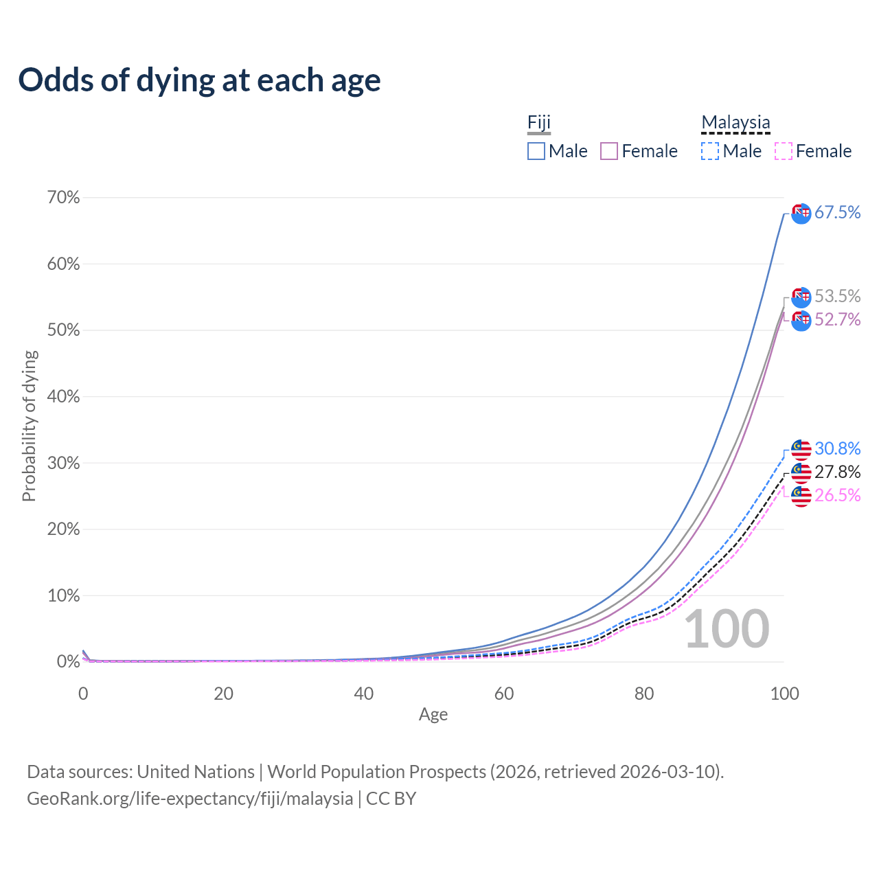 This life expectancy calculator shows the odds of living to 100, 95, 90, and below based on current age for both males and females in Fiji and Malaysia, along with mean and median age of death. The calculations are based on the 2026 life tables (actuarial tables) from the UN World Population Prospects.