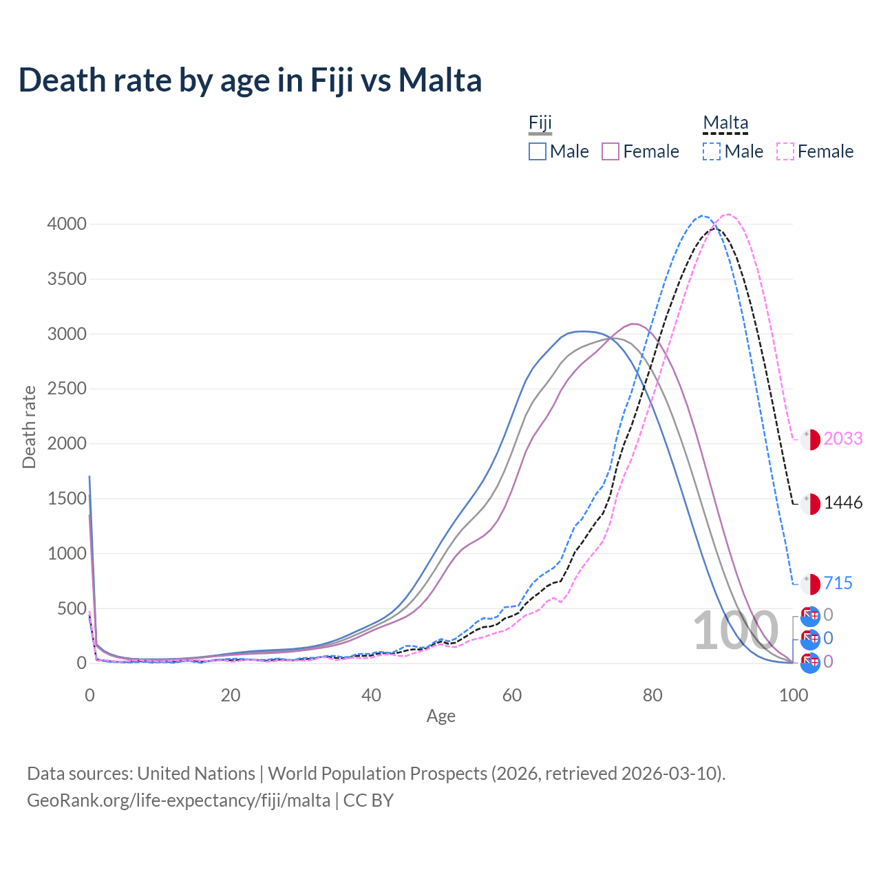 In Fiji, the most common age of death is 74, compared to 89 in Malta. The median age of death is 70.5 in Fiji and 86.3 in Malta, meaning only half of each cohort is expected to live past that age.