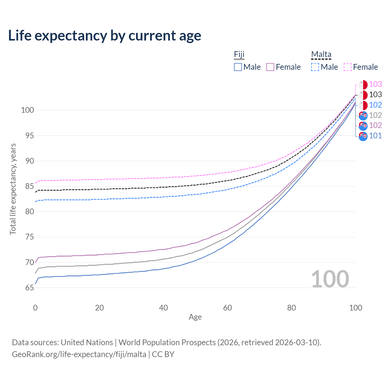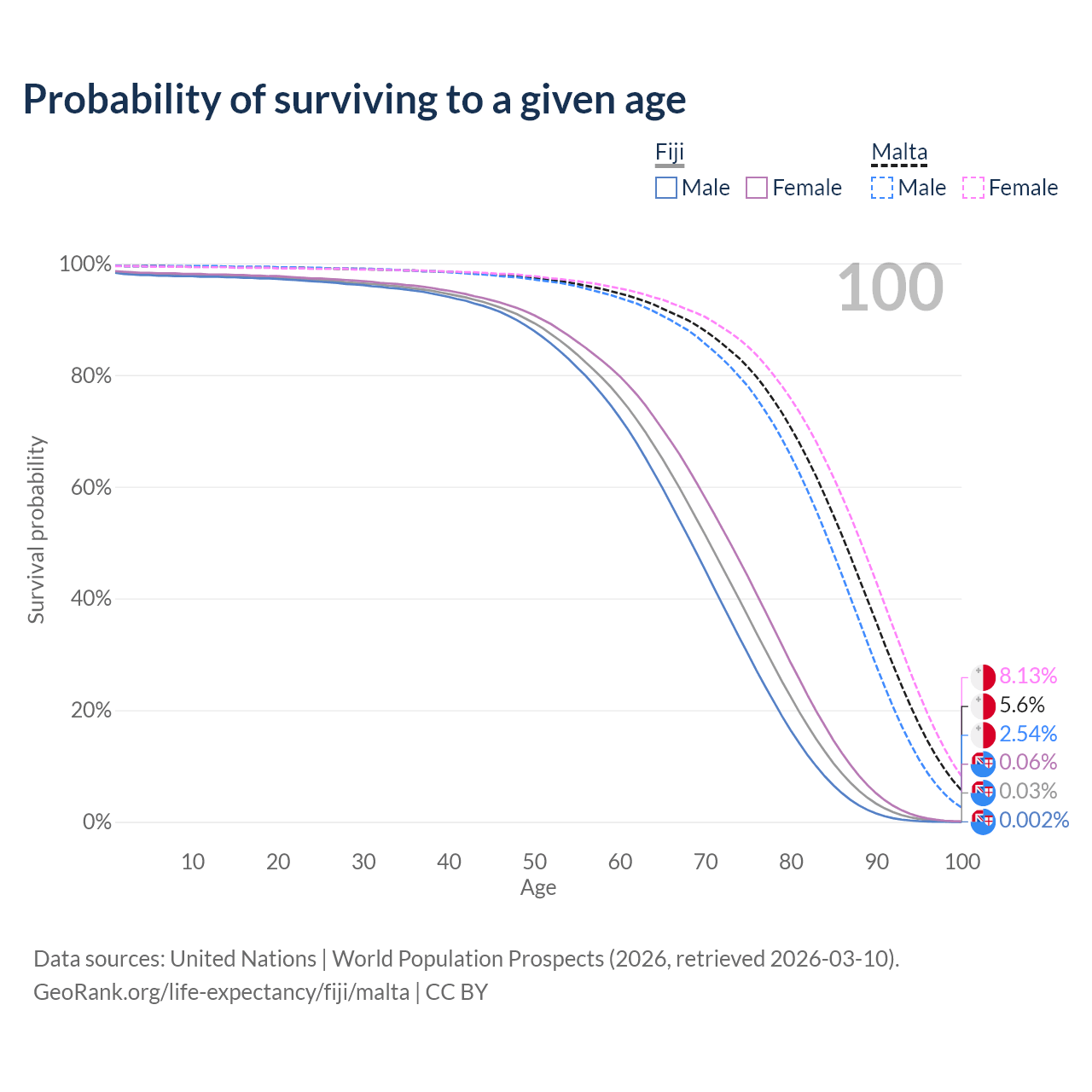 This life expectancy calculator shows the odds of living to 100, 95, 90, and below based on current age for both males and females in Fiji and Malta, along with mean and median age of death. The calculations are based on the 2026 life tables (actuarial tables) from the UN World Population Prospects.