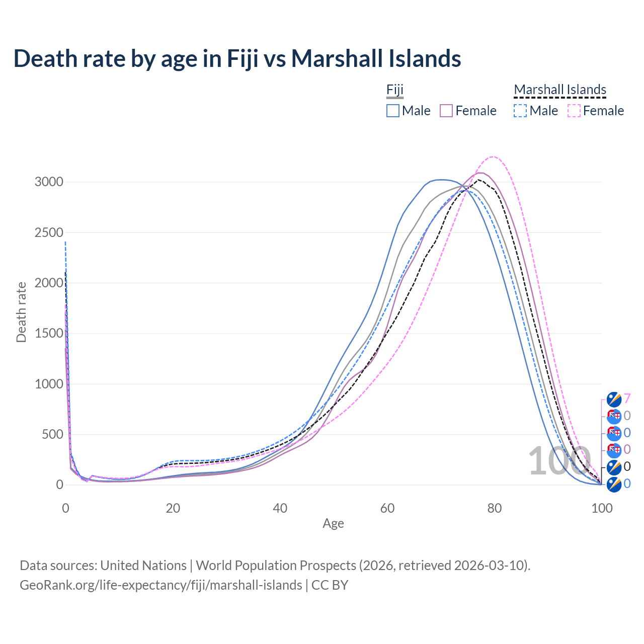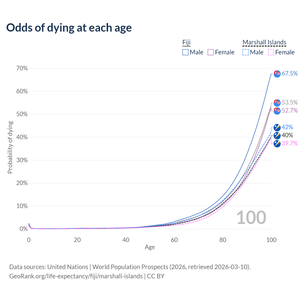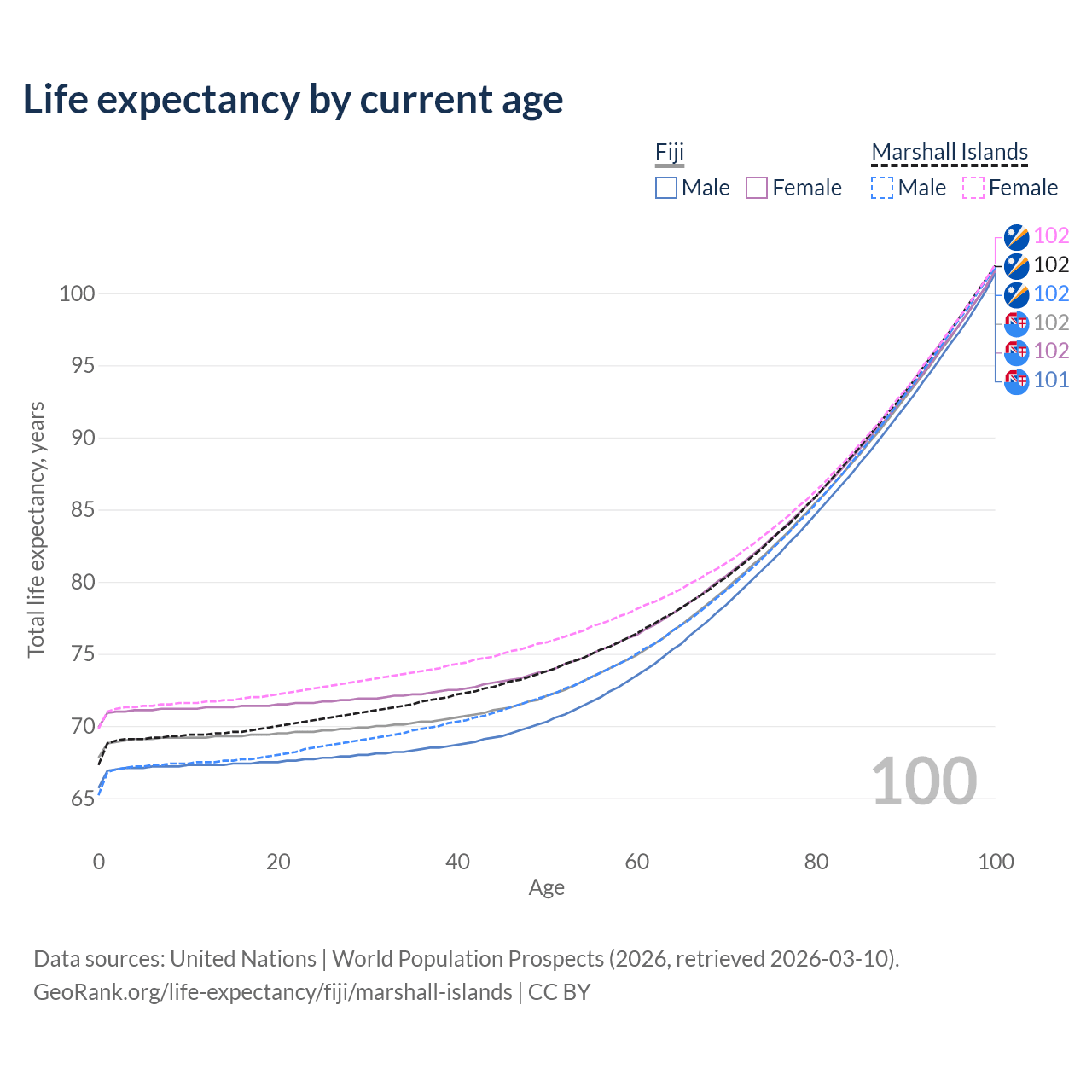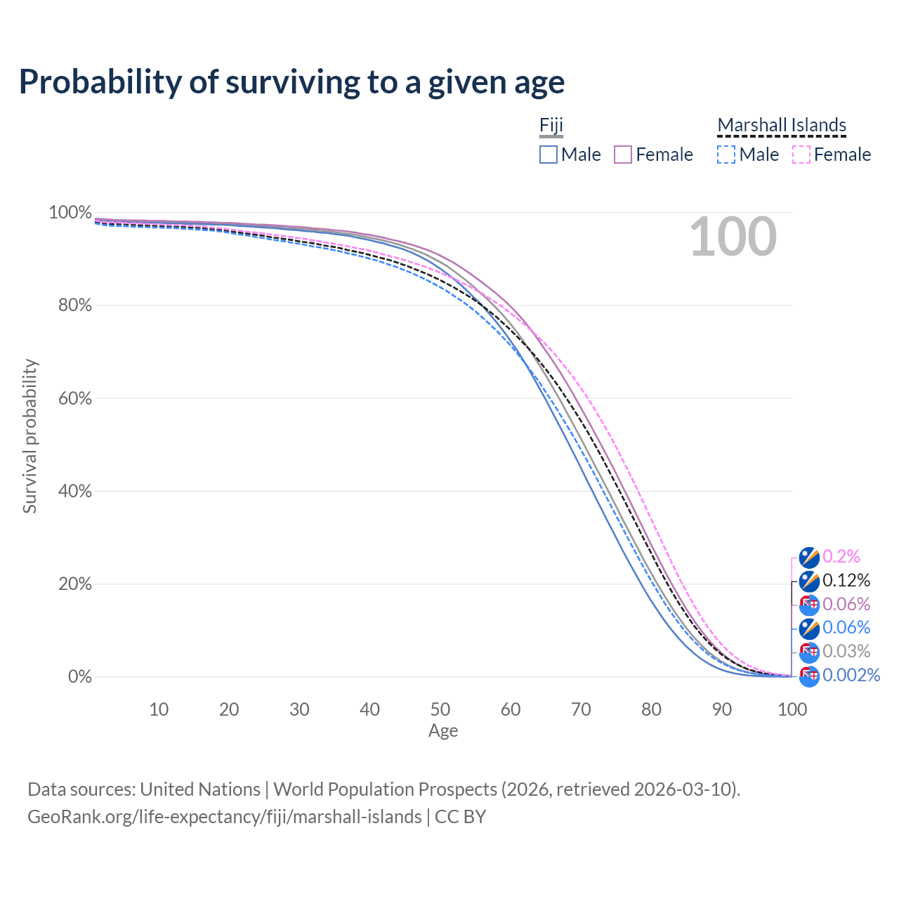 This life expectancy calculator shows the odds of living to 100, 95, 90, and below based on current age for both males and females in Fiji and the Marshall Islands, along with mean and median age of death. The calculations are based on the 2026 life tables (actuarial tables) from the UN World Population Prospects.