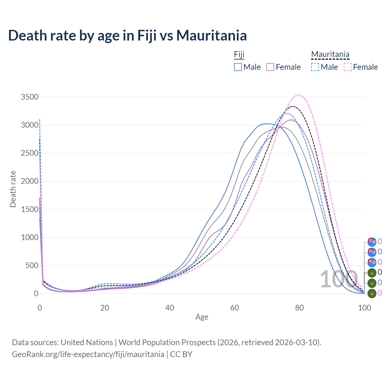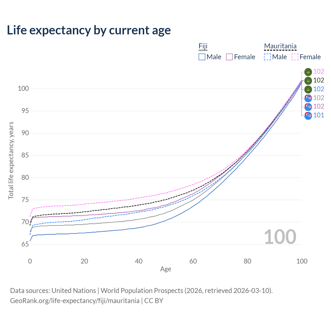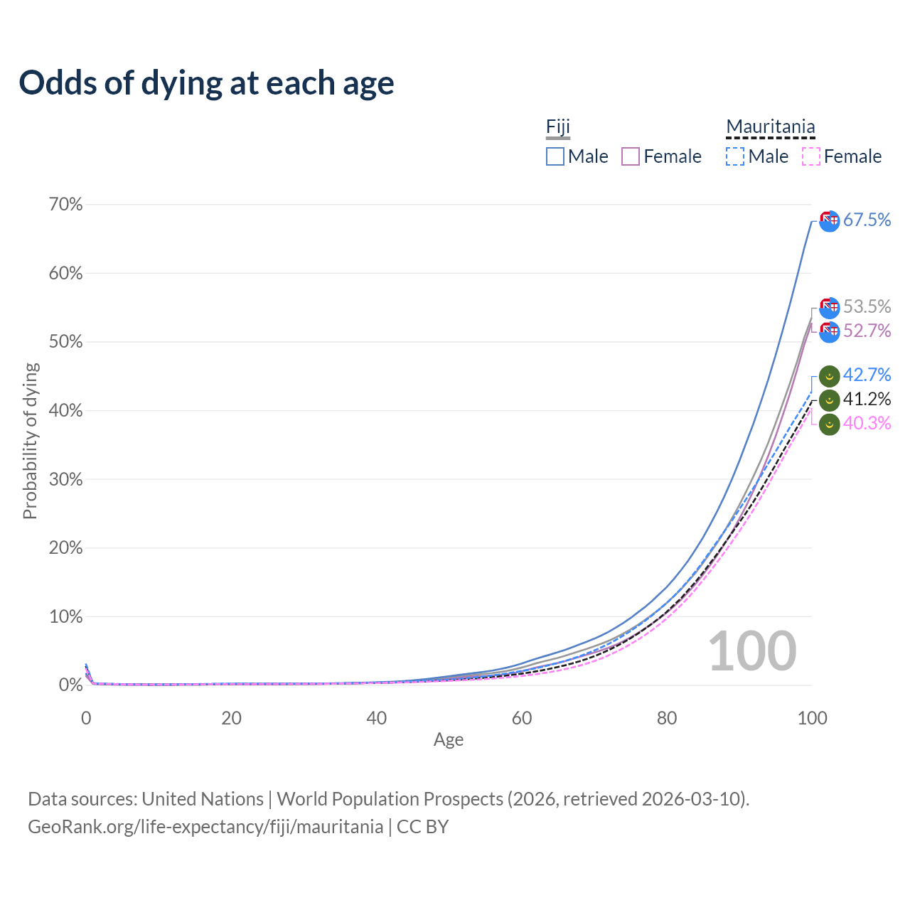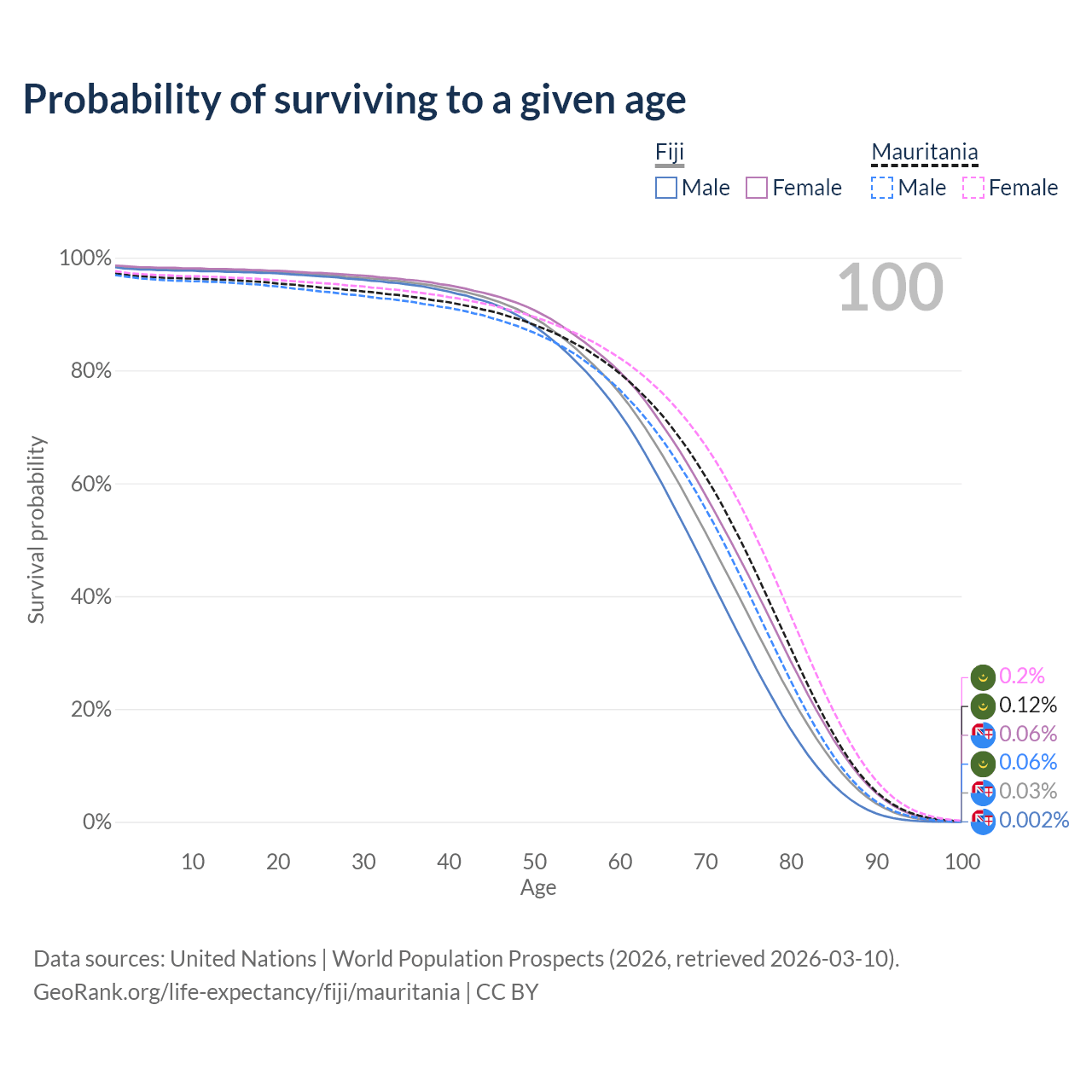 This life expectancy calculator shows the odds of living to 100, 95, 90, and below based on current age for both males and females in Fiji and Mauritania, along with mean and median age of death. The calculations are based on the 2026 life tables (actuarial tables) from the UN World Population Prospects.