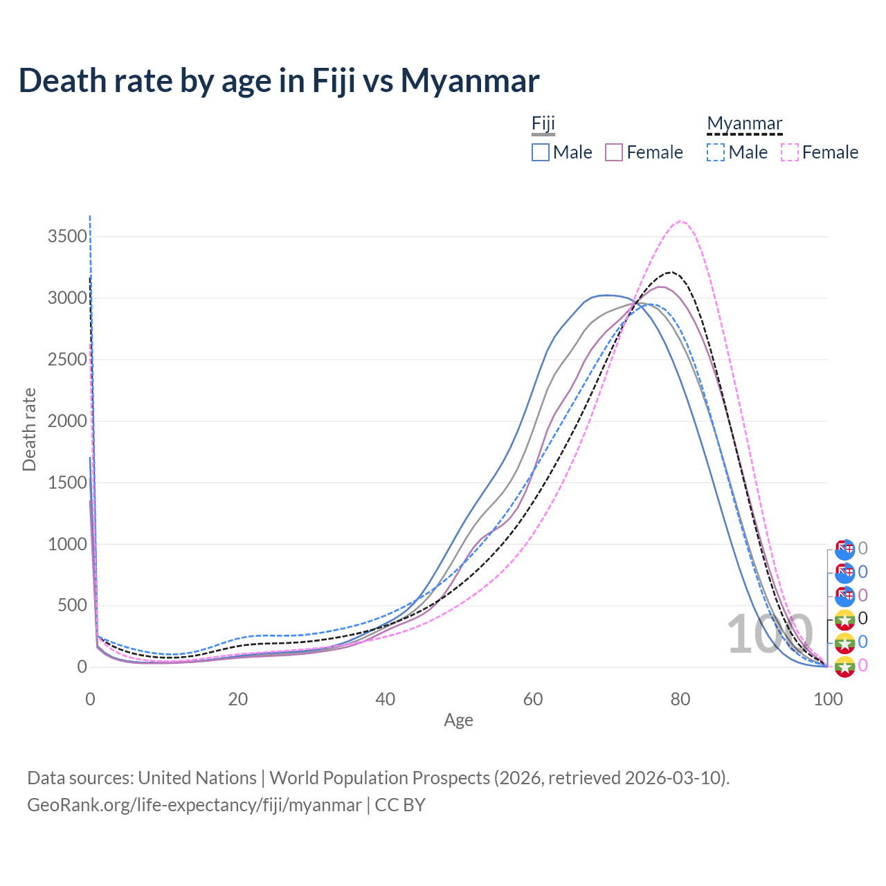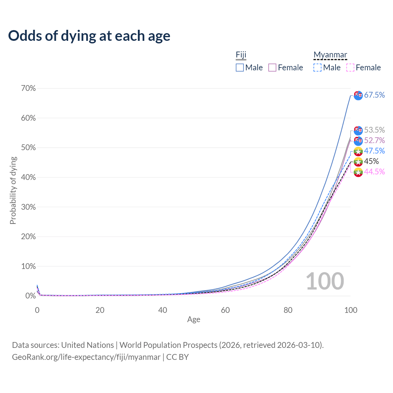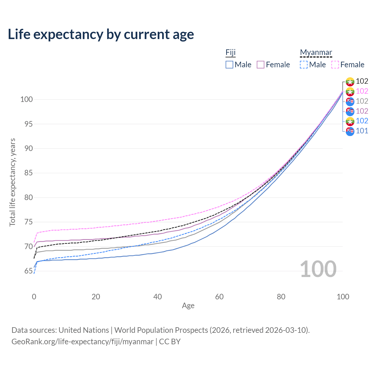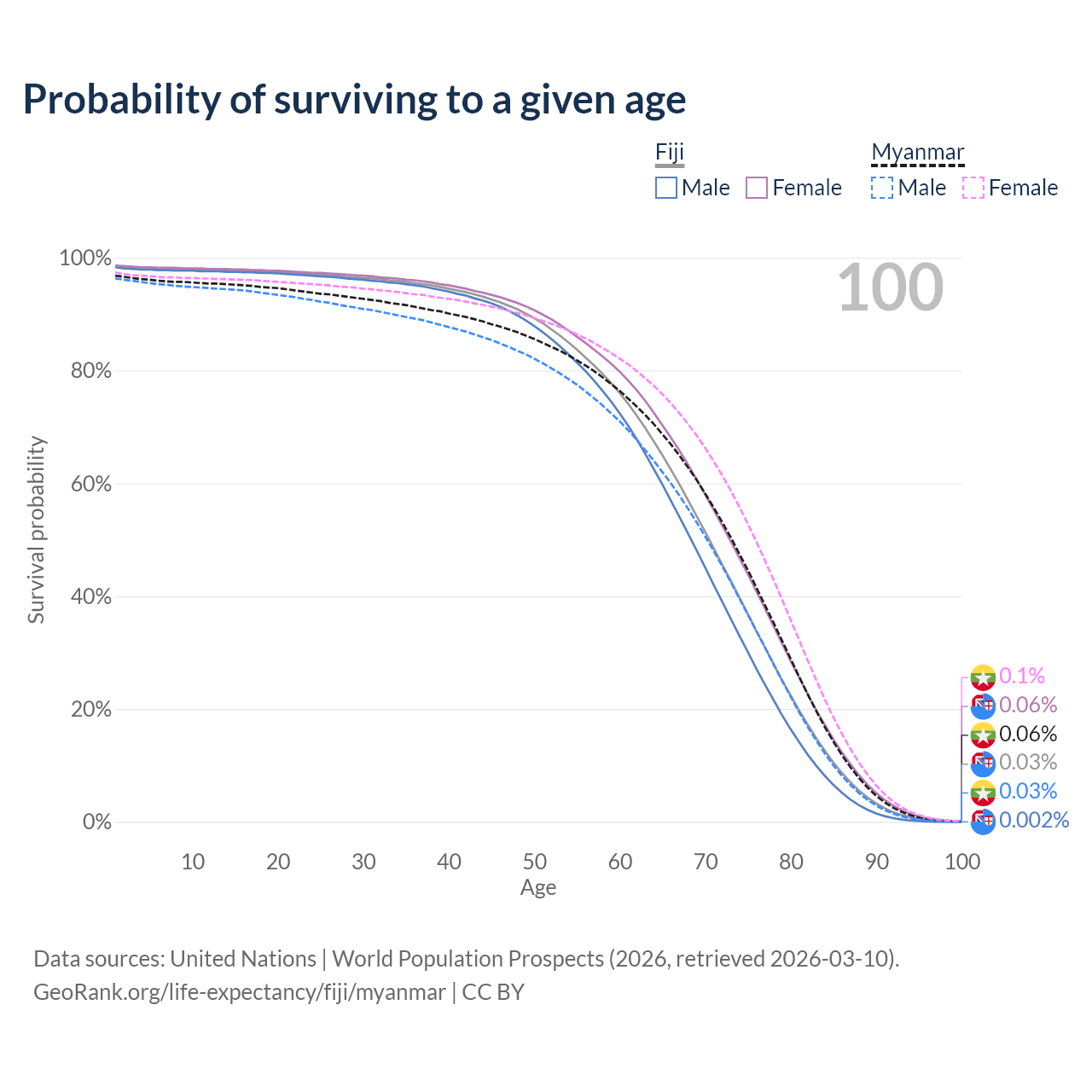 This life expectancy calculator shows the odds of living to 100, 95, 90, and below based on current age for both males and females in Fiji and Myanmar, along with mean and median age of death. The calculations are based on the 2026 life tables (actuarial tables) from the UN World Population Prospects.