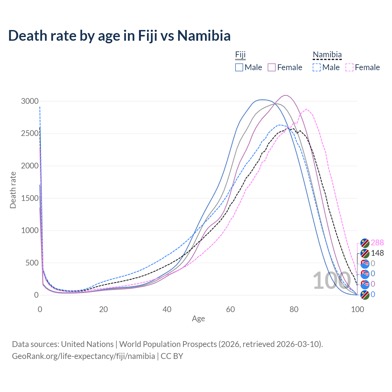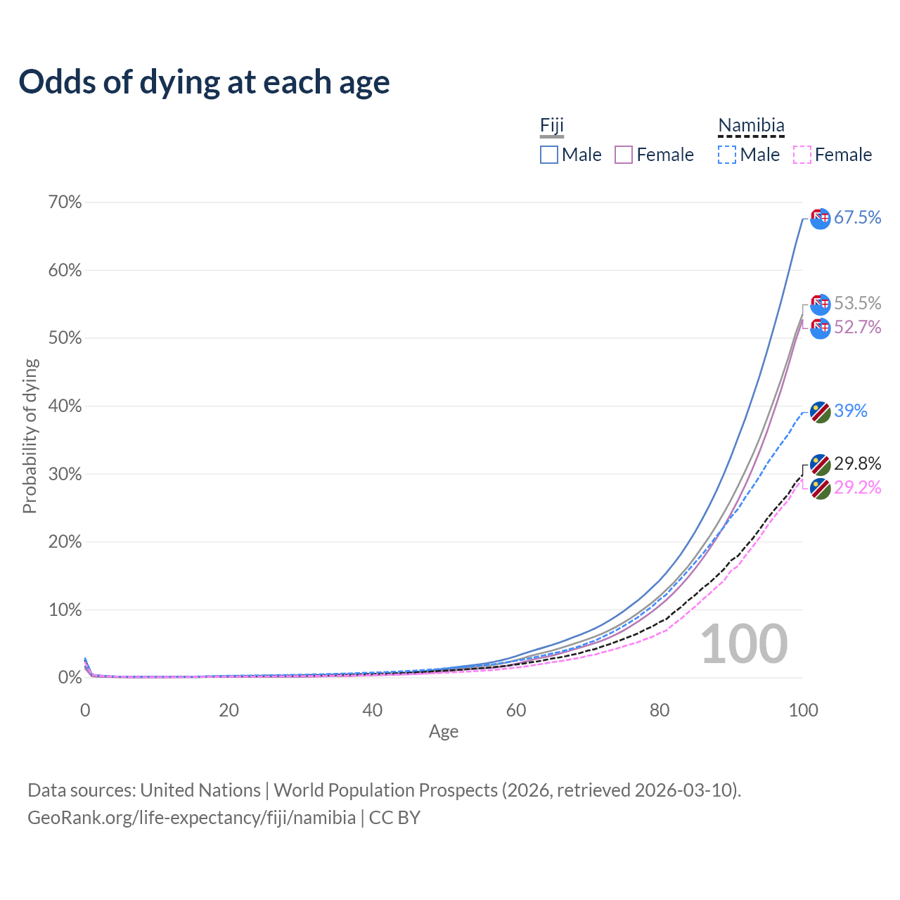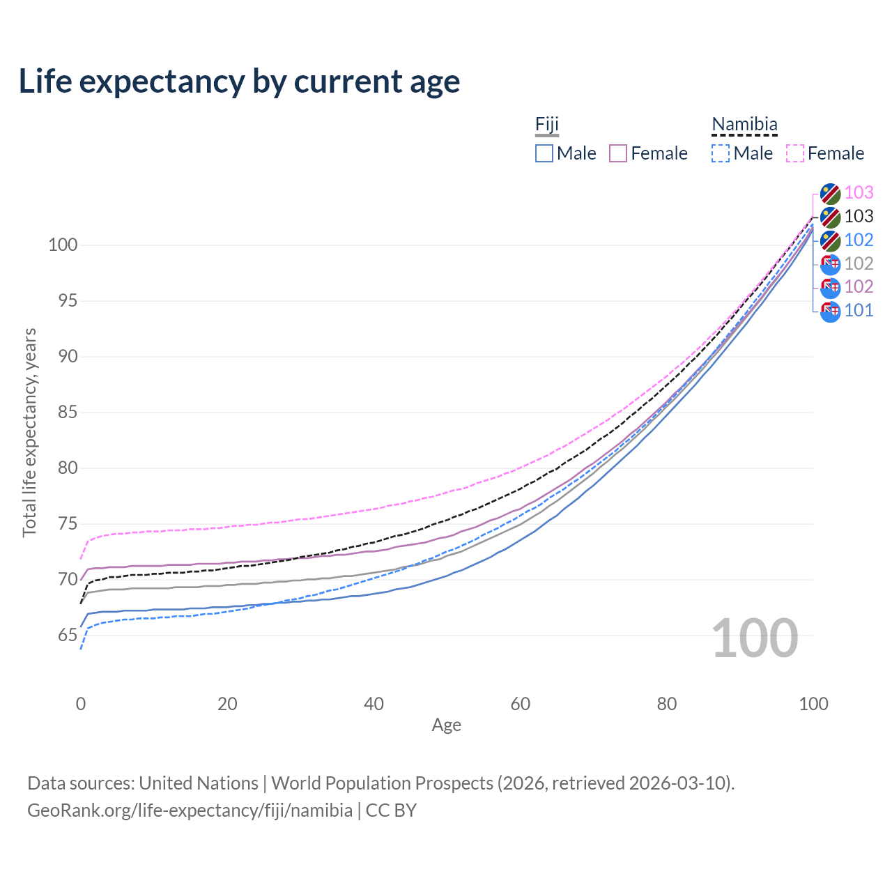 This life expectancy calculator shows the odds of living to 100, 95, 90, and below based on current age for both males and females in Fiji and Namibia, along with mean and median age of death. The calculations are based on the 2026 life tables (actuarial tables) from the UN World Population Prospects.