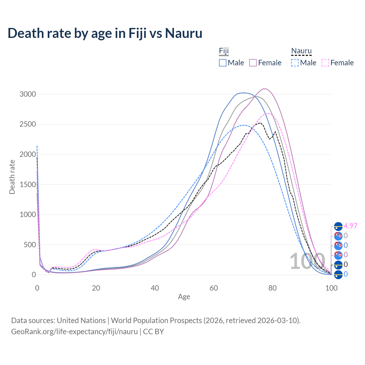 In Fiji, the most common age of death is 74, compared to 76 in Nauru. The median age of death is 70.5 in Fiji and 67.3 in Nauru, meaning only half of each cohort is expected to live past that age.