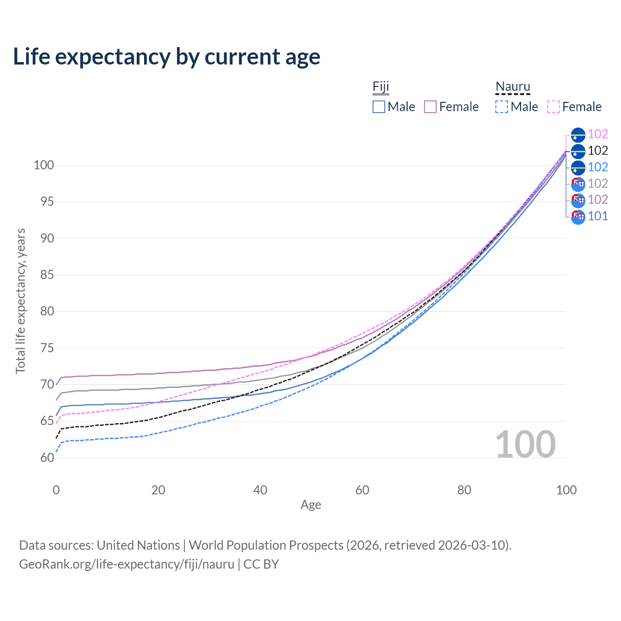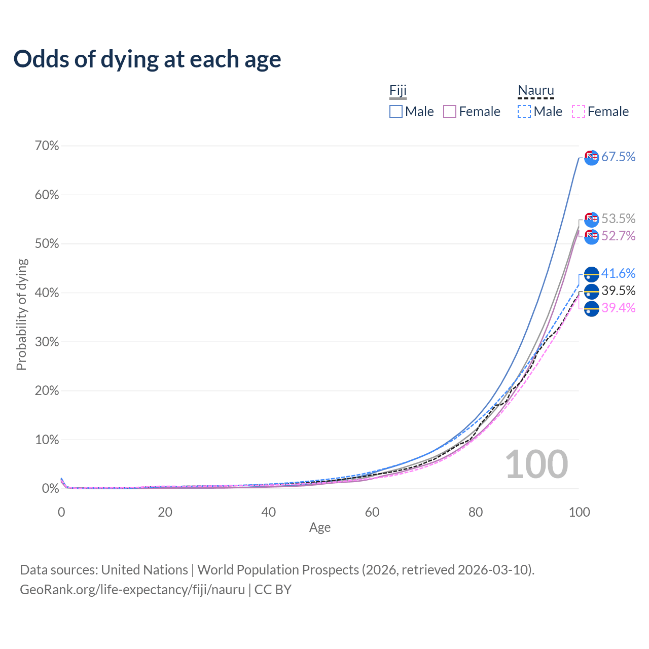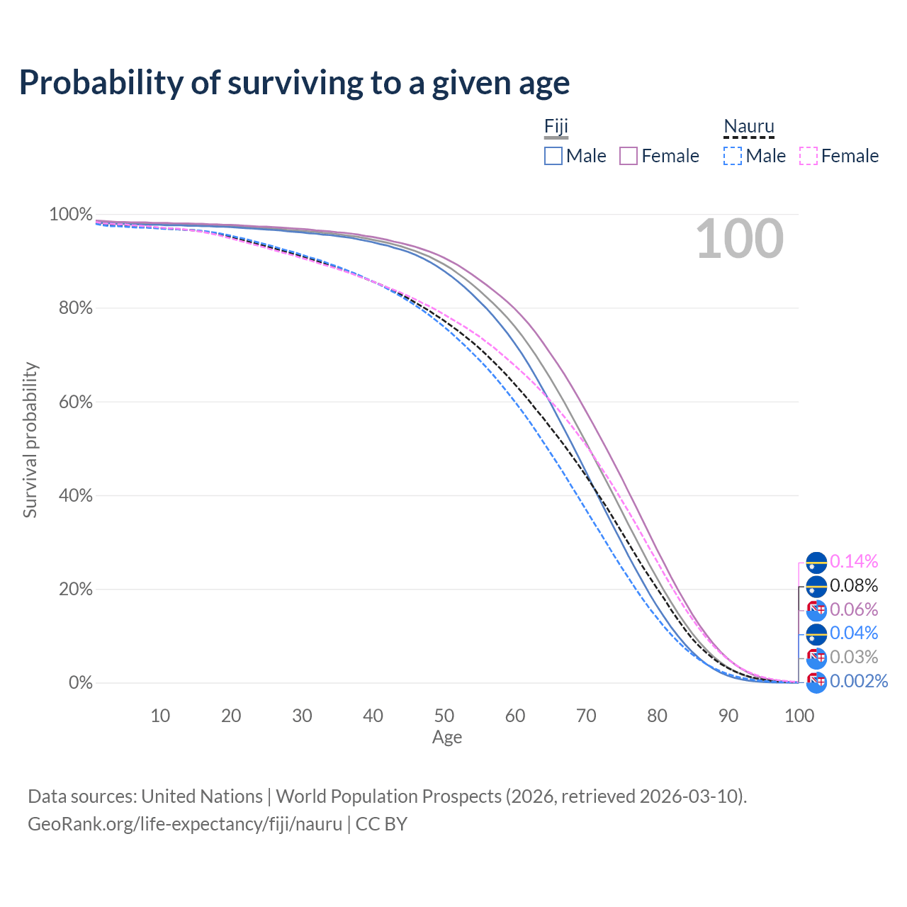 This life expectancy calculator shows the odds of living to 100, 95, 90, and below based on current age for both males and females in Fiji and Nauru, along with mean and median age of death. The calculations are based on the 2026 life tables (actuarial tables) from the UN World Population Prospects.