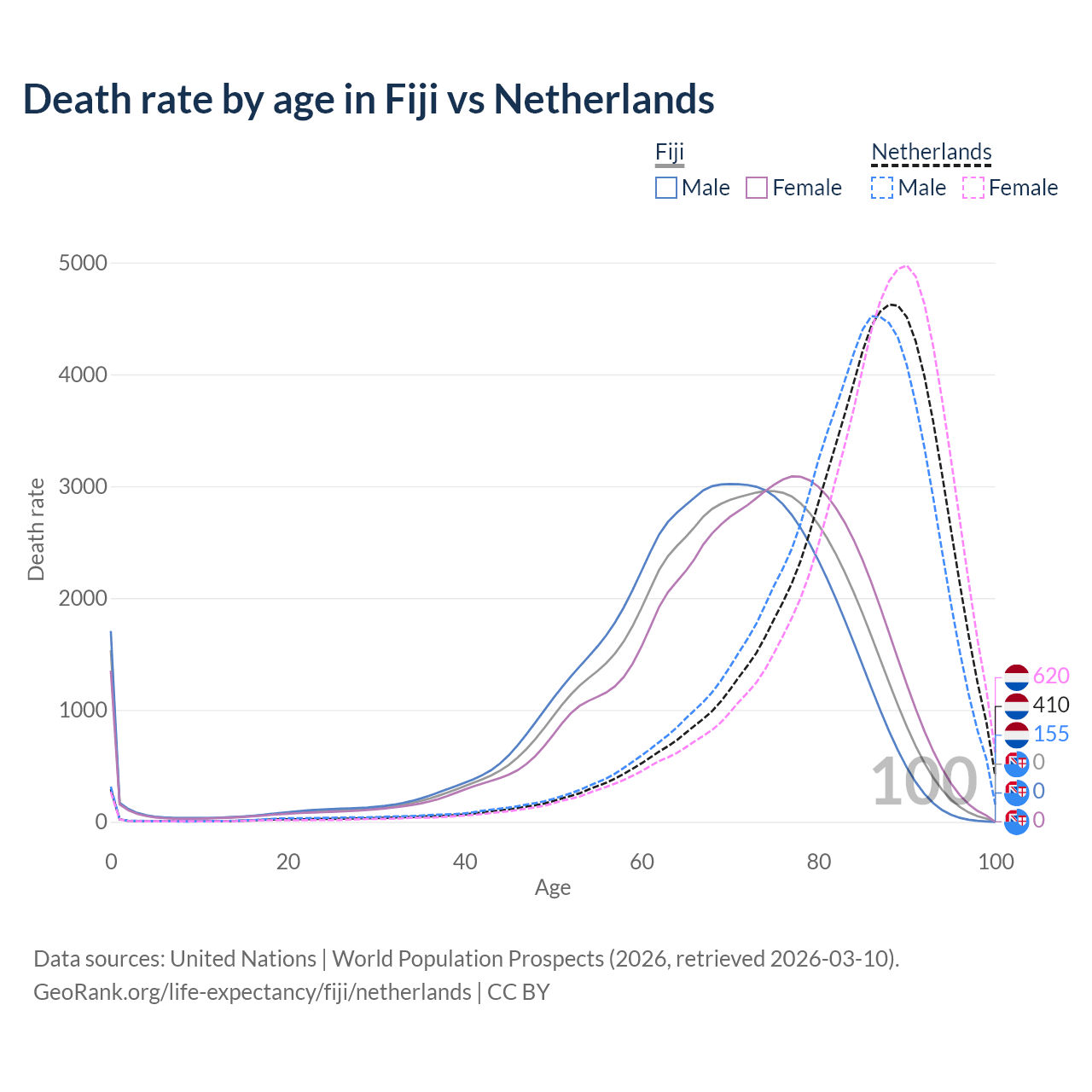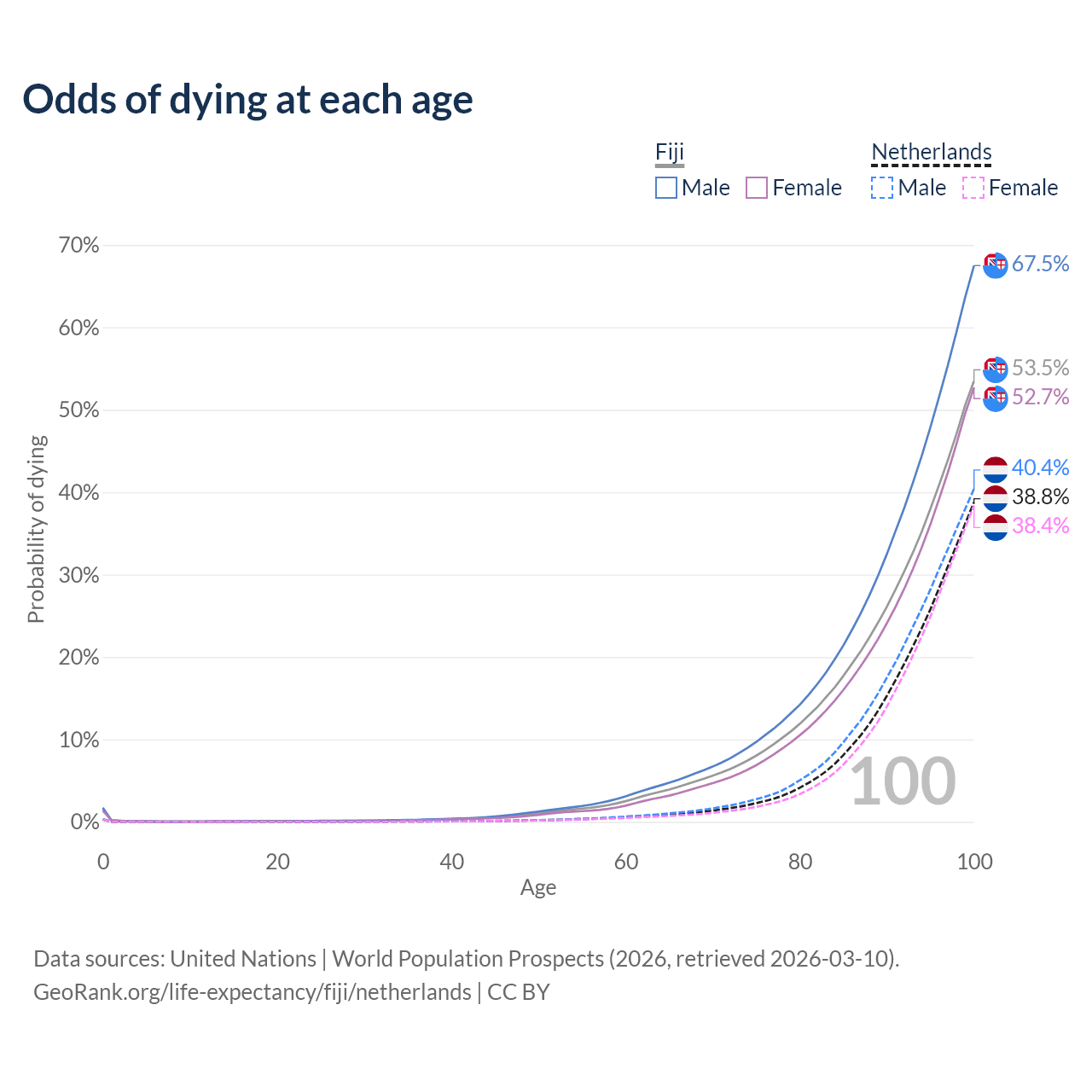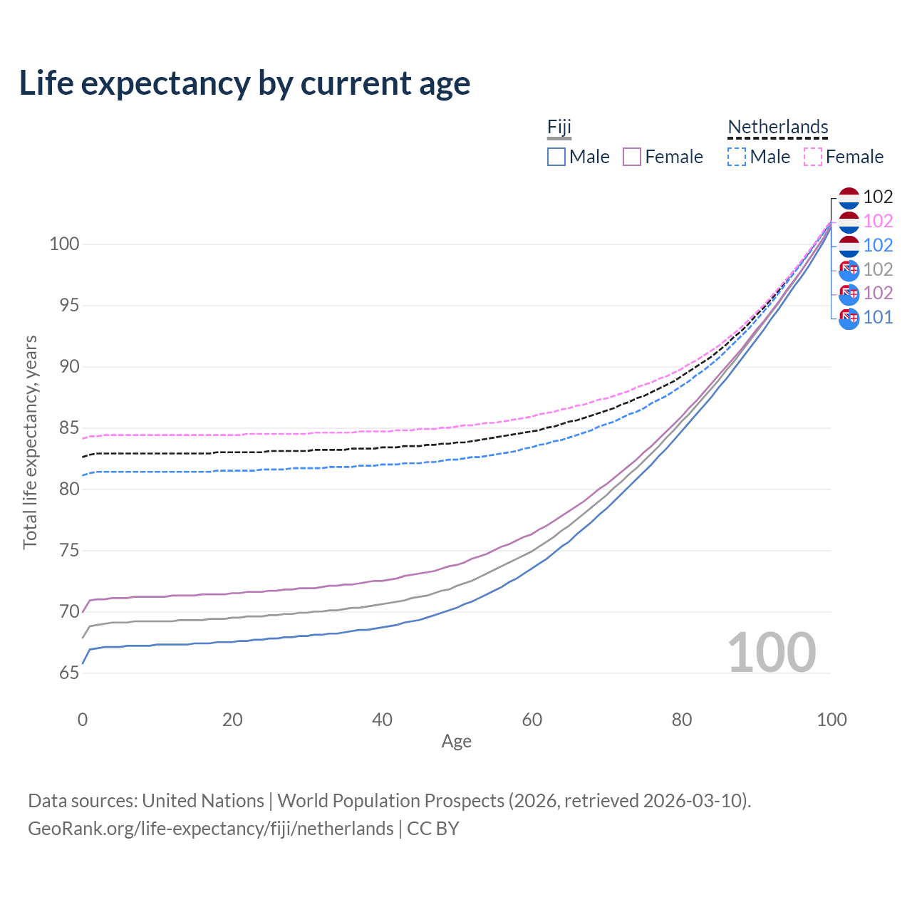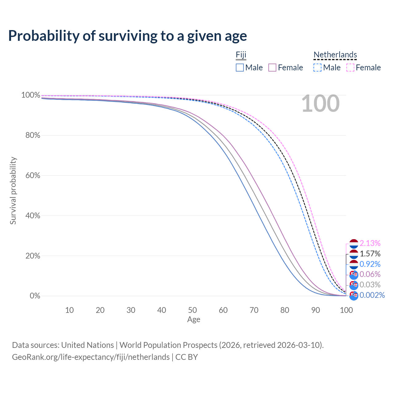 This life expectancy calculator shows the odds of living to 100, 95, 90, and below based on current age for both males and females in Fiji and the Netherlands, along with mean and median age of death. The calculations are based on the 2026 life tables (actuarial tables) from the UN World Population Prospects.